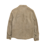 Patrick Assaraf zip-up, collared shacket in a cool beige suede. Features a chest patch pocket, a double zip closure, tonal snaps at cuffs and horizontal seam details.