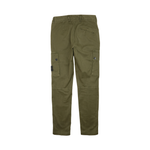Stone Island tapered cargo pants in army green cotton with cargo pockets on the thighs, a signature black logo patch, and a button-fly closure.