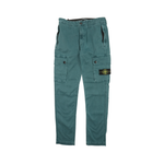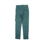 Stone Island tapered cargo pants in turquoise blue cotton with cargo pockets on the thighs, a signature black logo patch, and a button-fly closure.