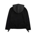 Valentino 'Mixed Media' pullover hoodie in black with a quilted puffer hood and front pocket and canvas logo straps on the sides. Features logo drawstrings in the hood, and silver hardware on the logo straps.