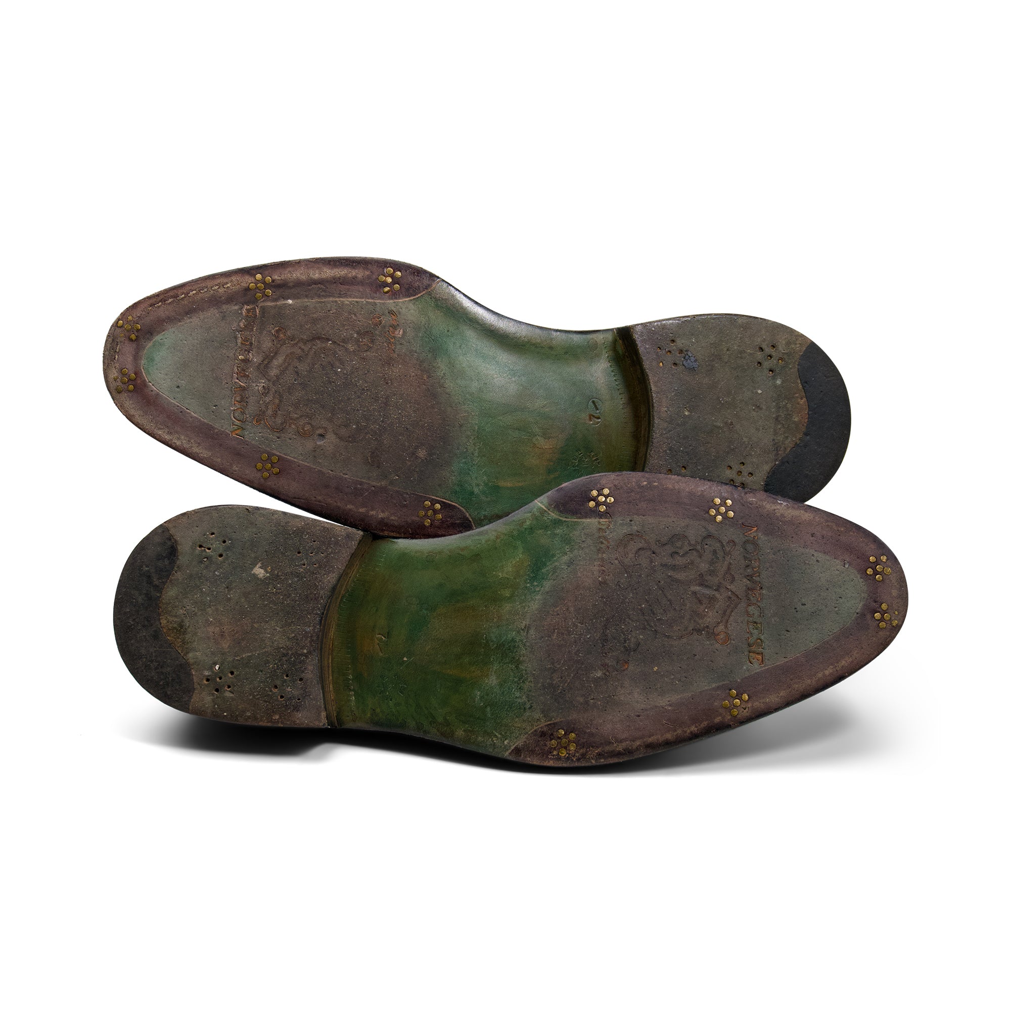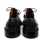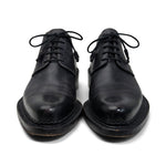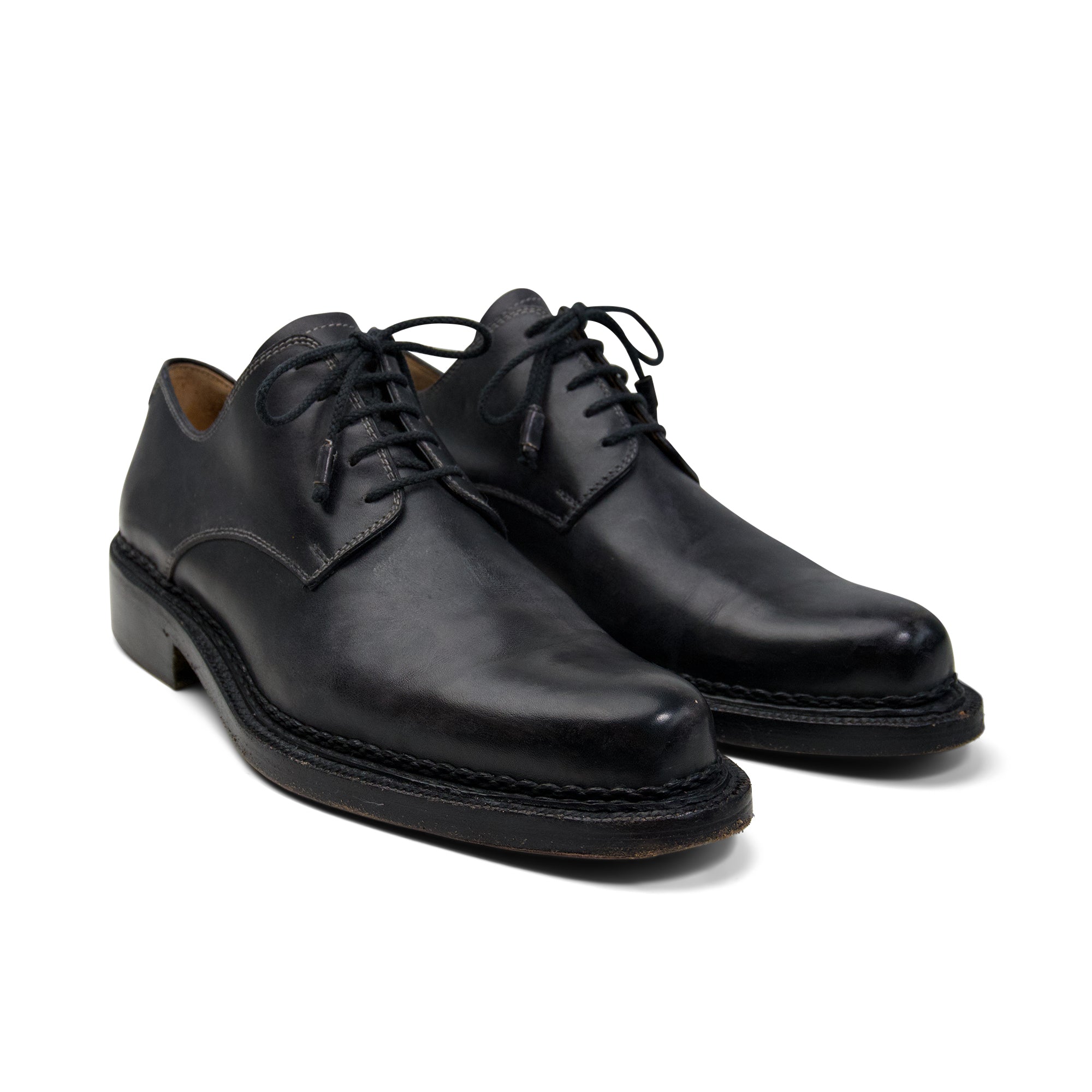 Berluti dress shoes in charcoal black aged leather with grey stitching, rope laces, and a woven detail around the toe.