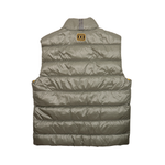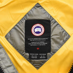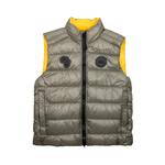 Canada Goose x Giants Of Africa 'Crofton' puffer vest in sage green nylon with a front zip opening in black hardware, black logo patches on the chest, and a bright yellow interior lining.