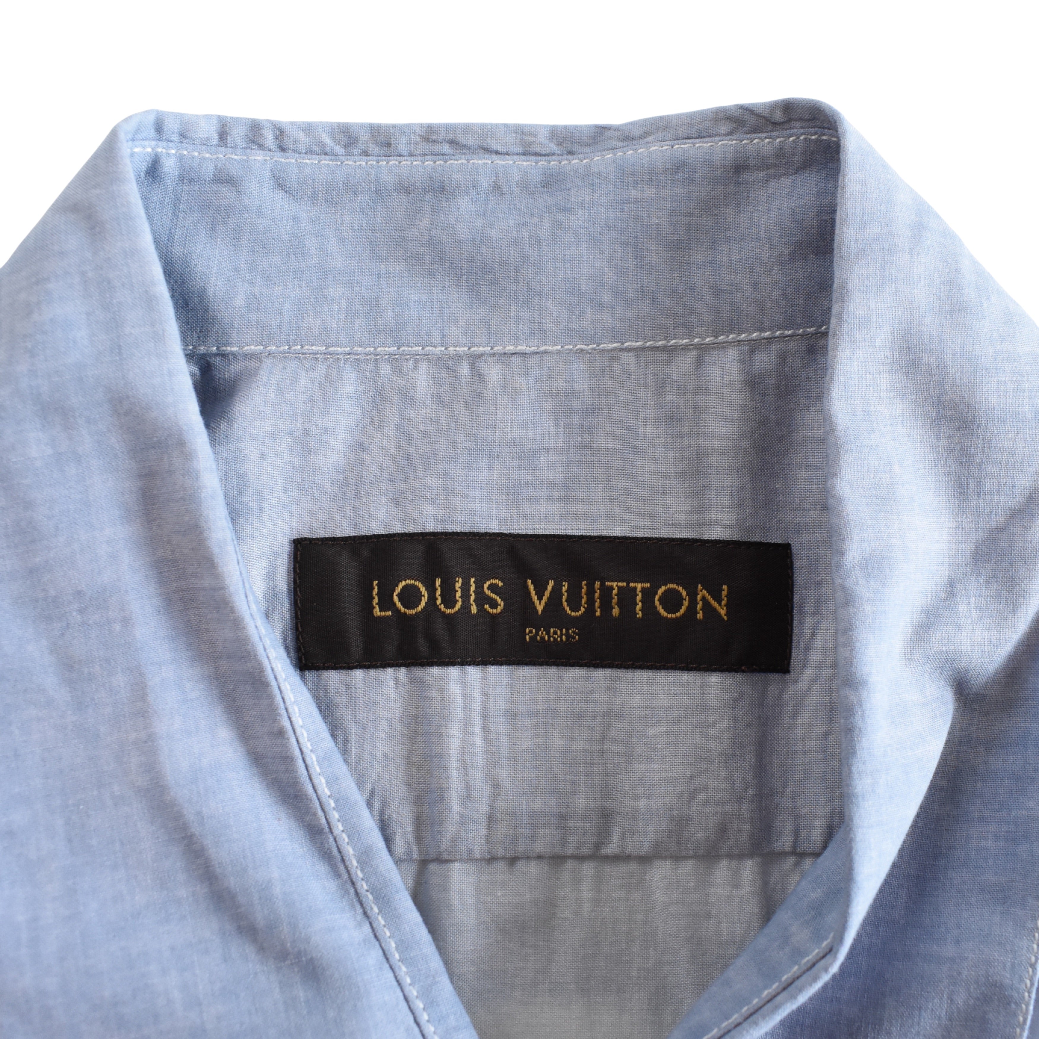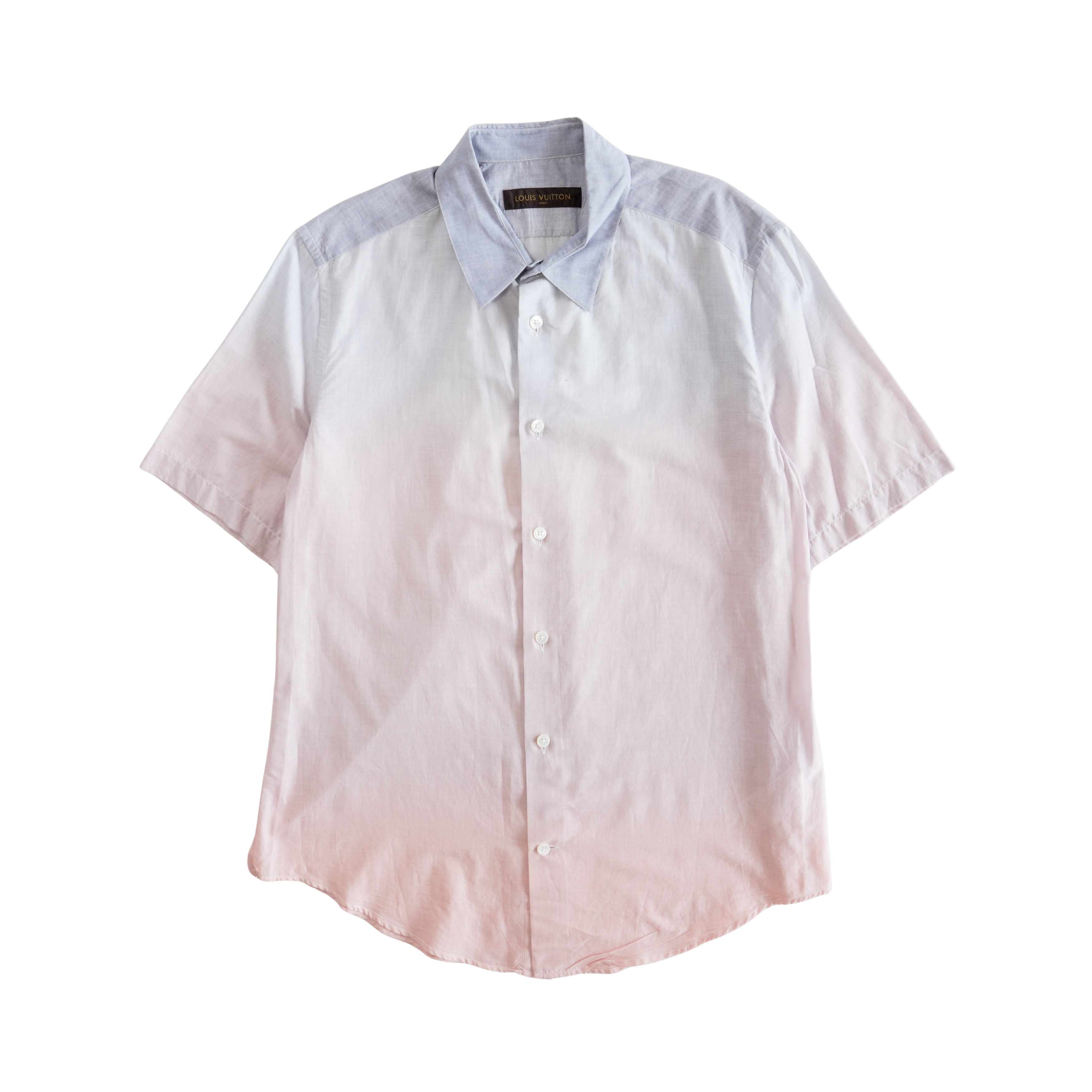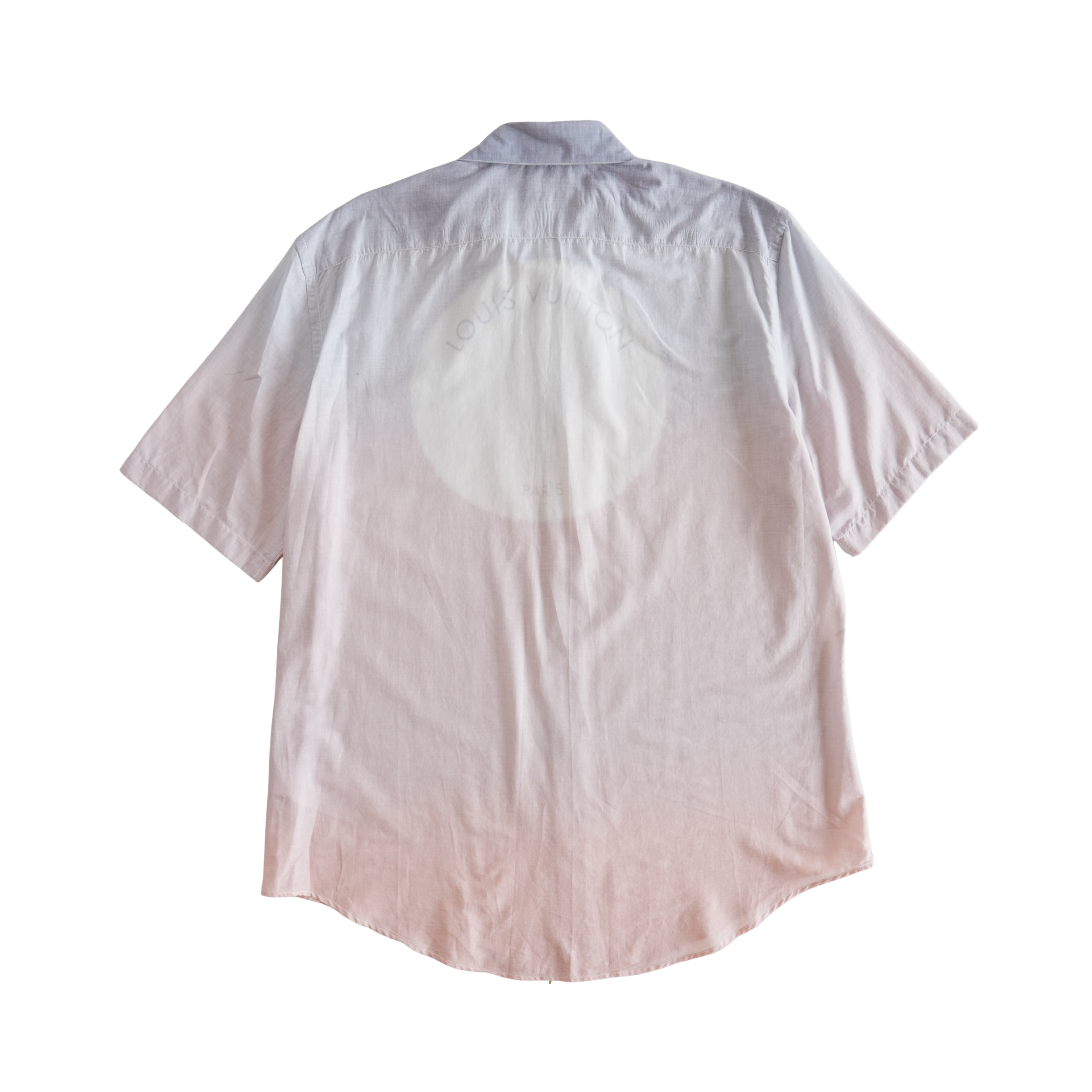 Louis Vuitton button-down shirt in blue to pink ombre cotton with pearlescent buttons and a large faded logo graphic on the back.