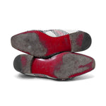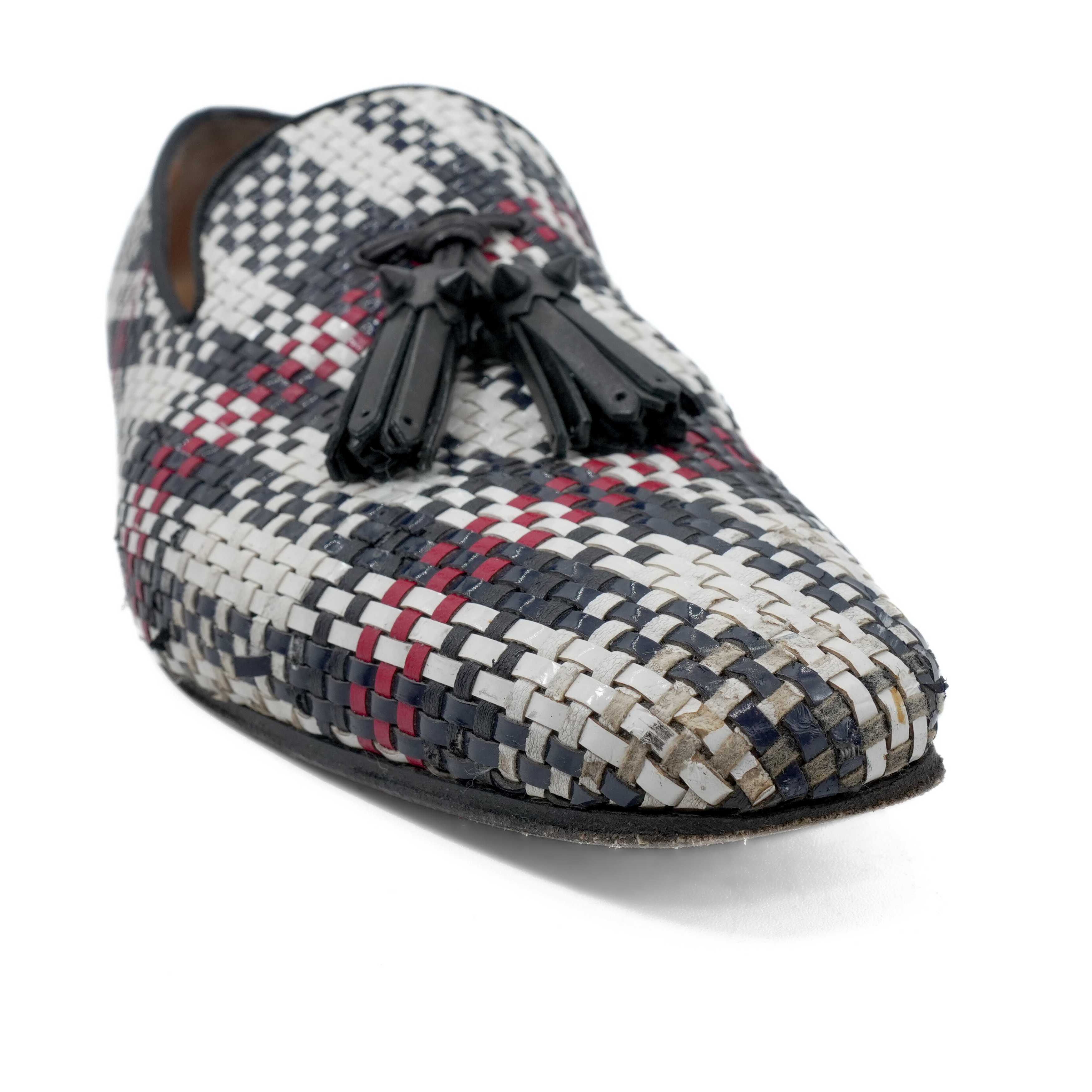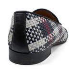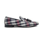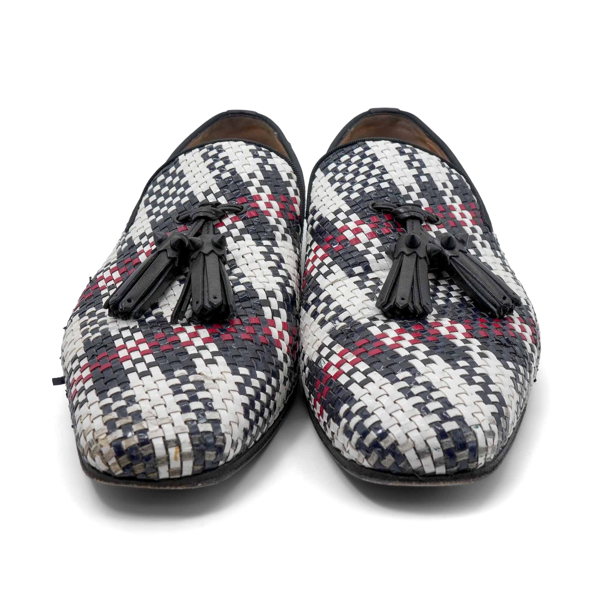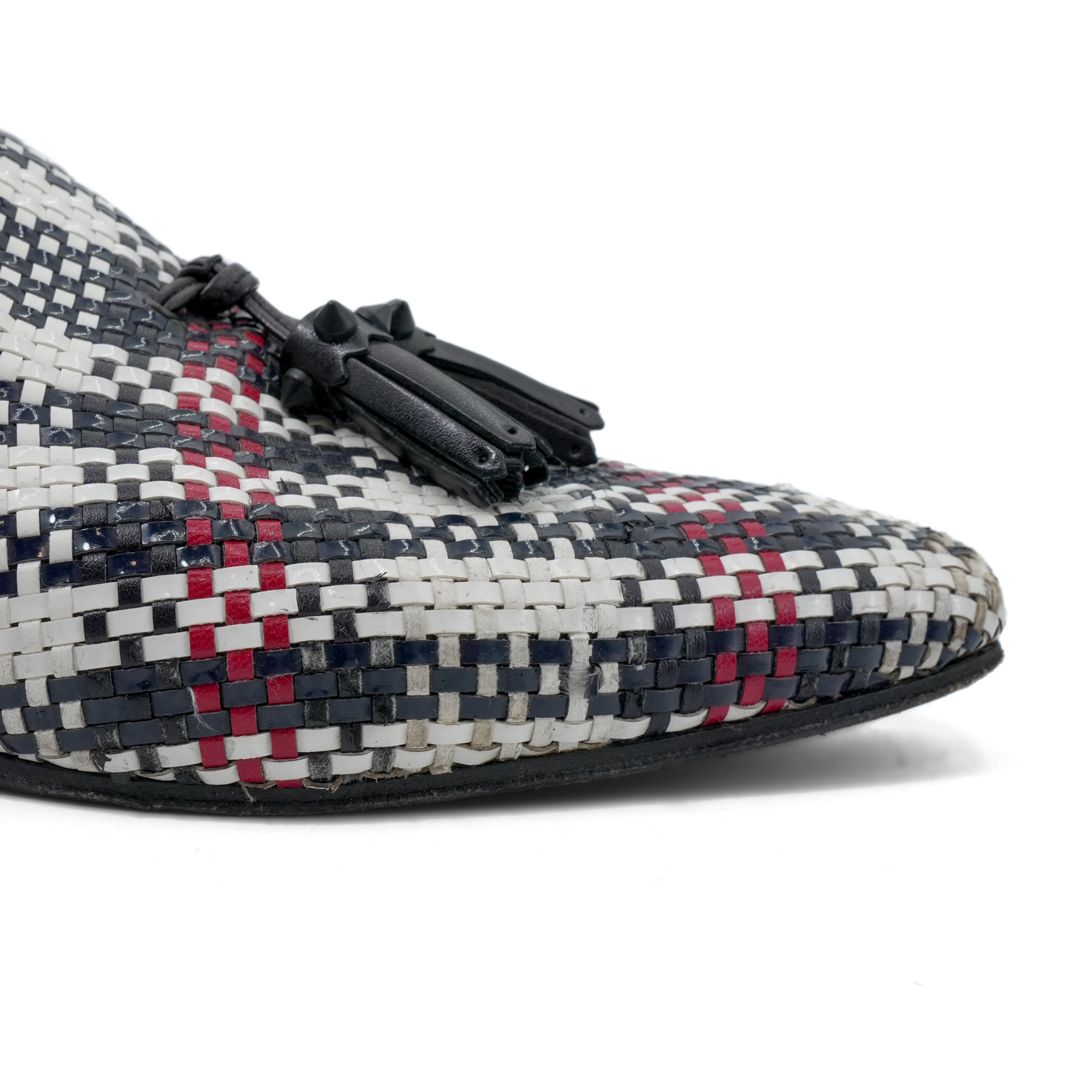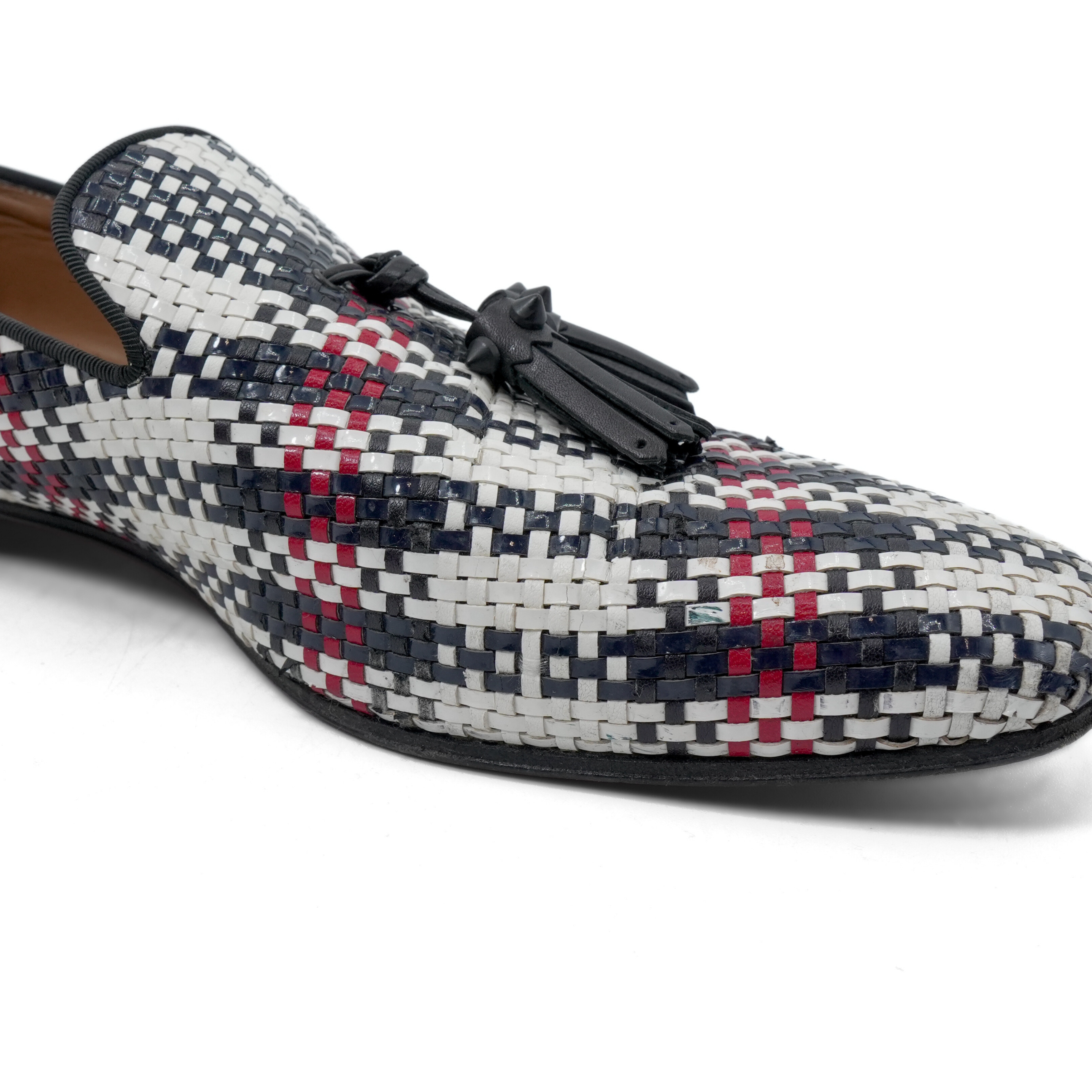 Christian Louboutin 'Dada' loafers in white, red, black, and navy woven leather with a black leather tassel on the toes.