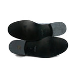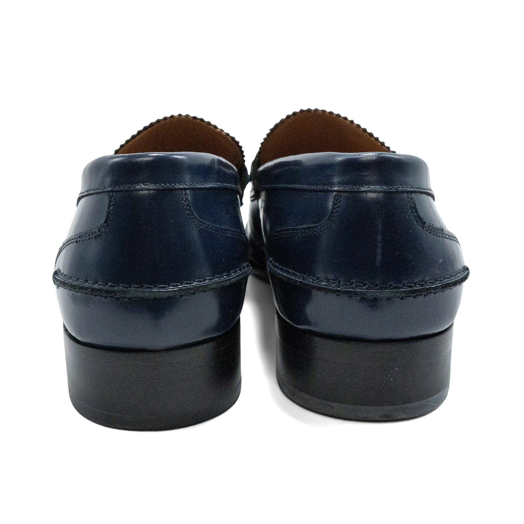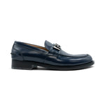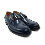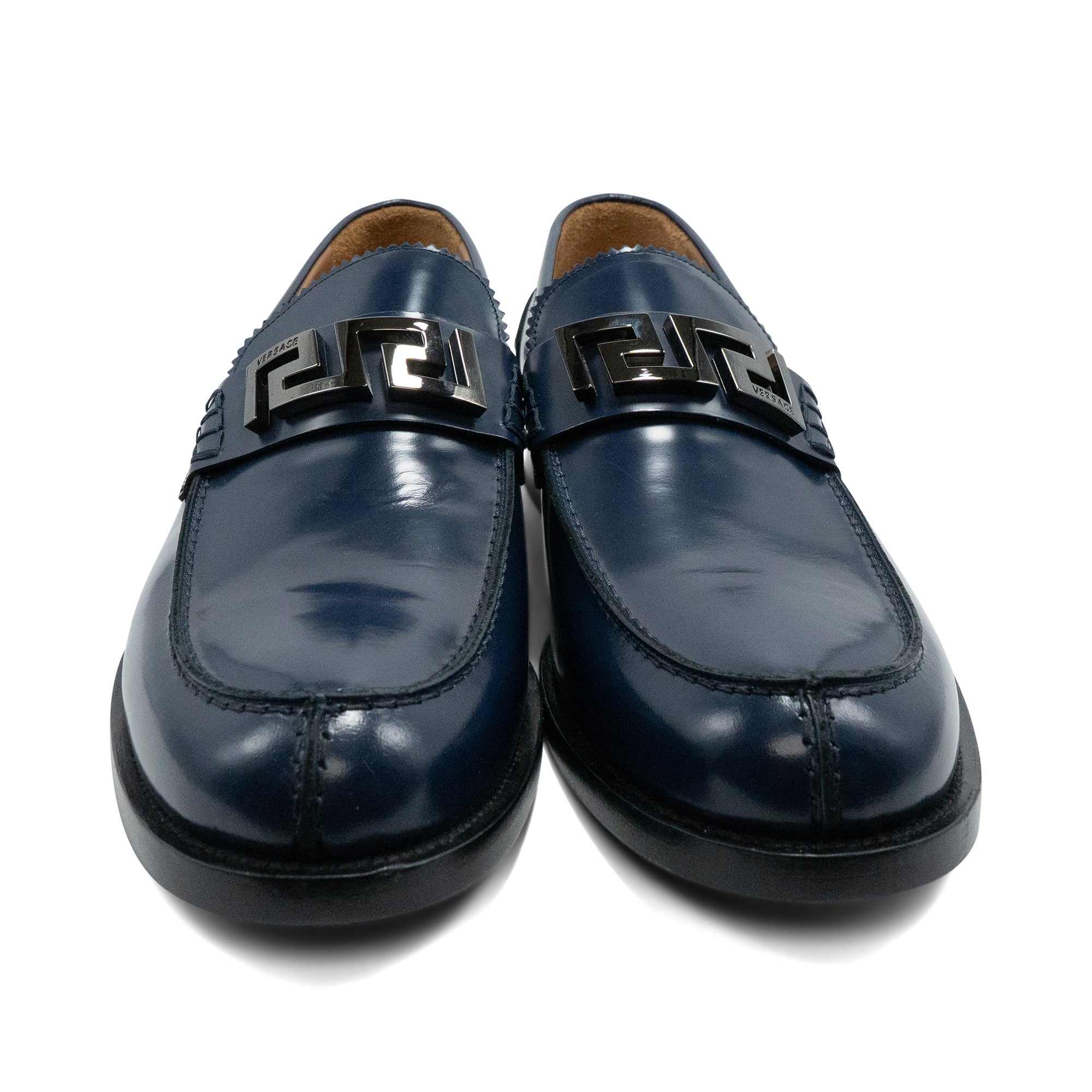 Versace navy blue, shiny leather loafers with a gunmetal greca plaque across the front. Features a black sole, tonal stitching, and a scalloped tongue.