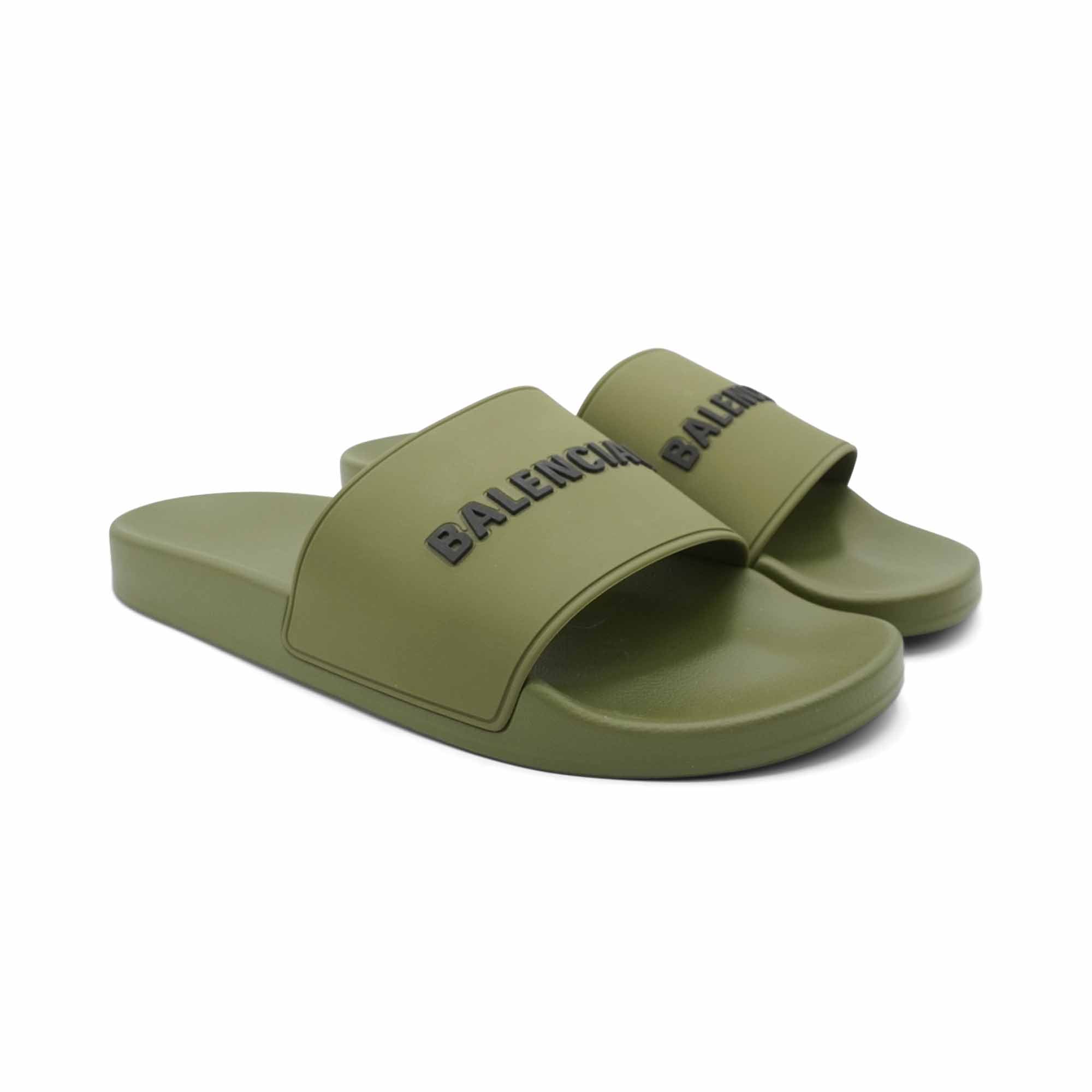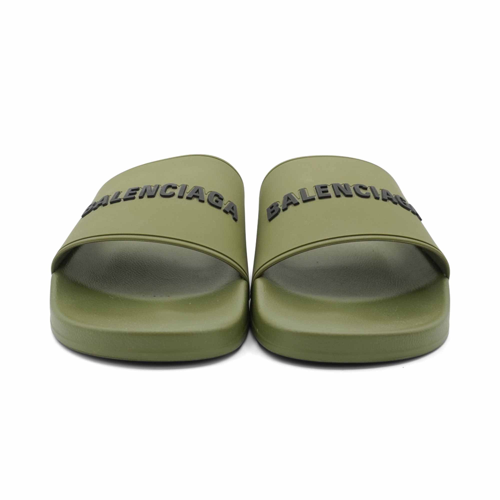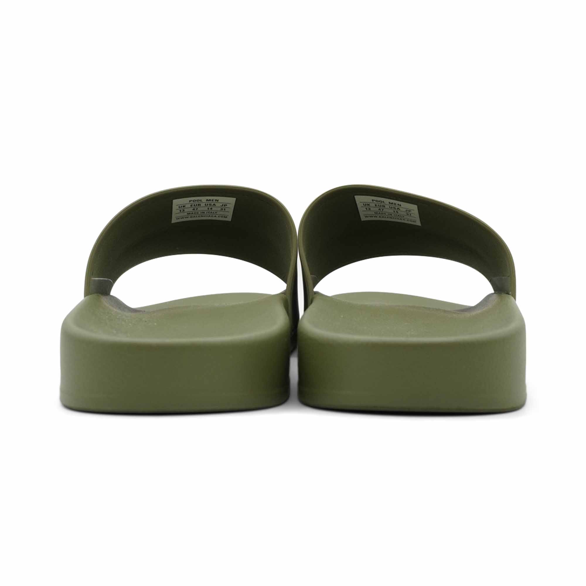 Balenciaga 'Pool Slide' sandals in olive green rubber with black logo text on the straps.