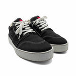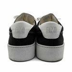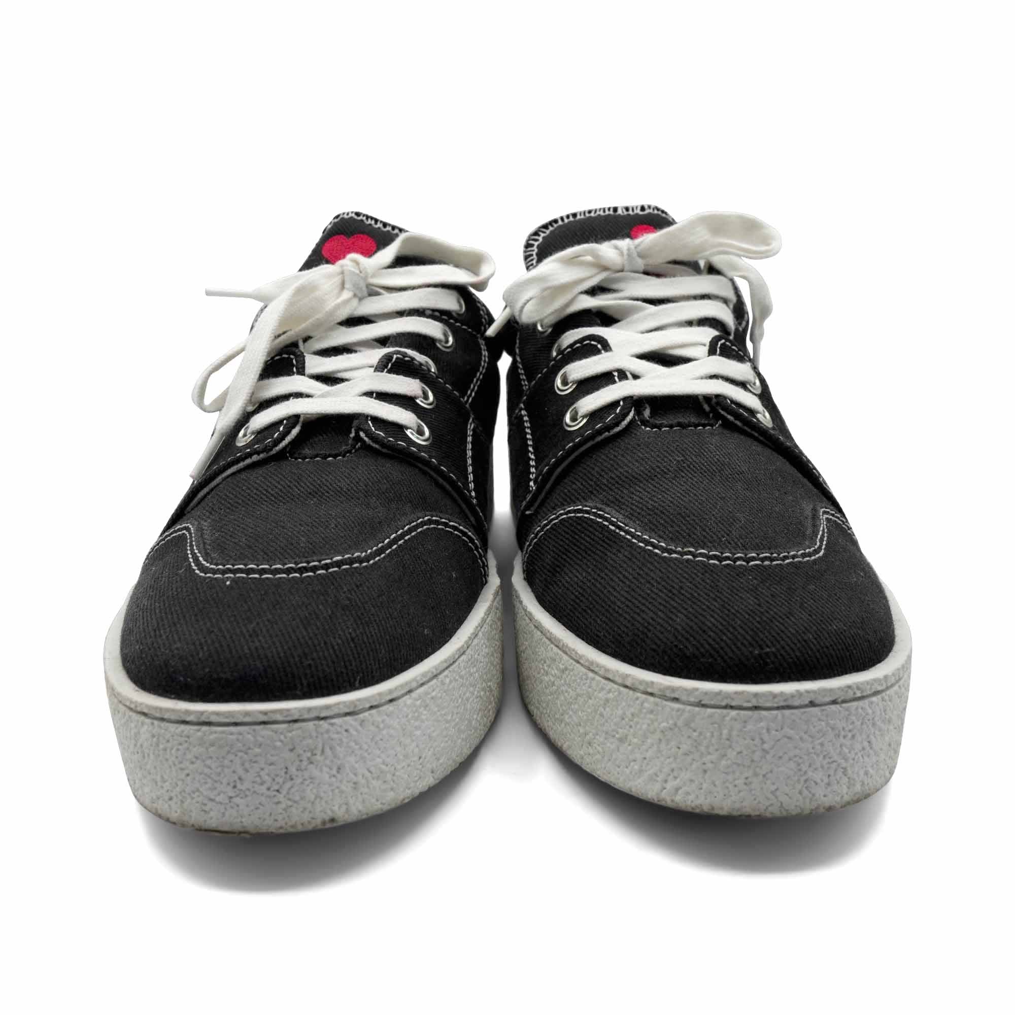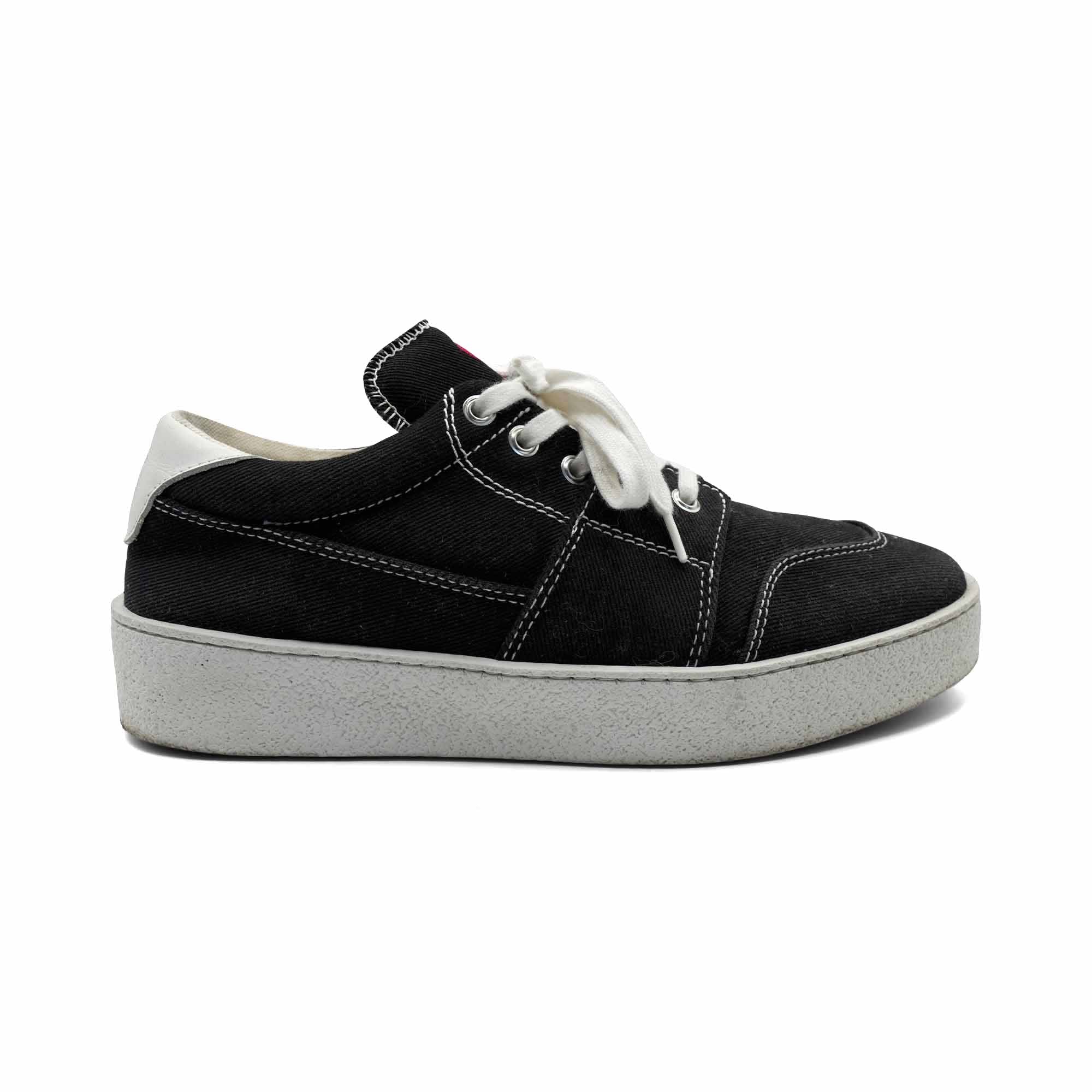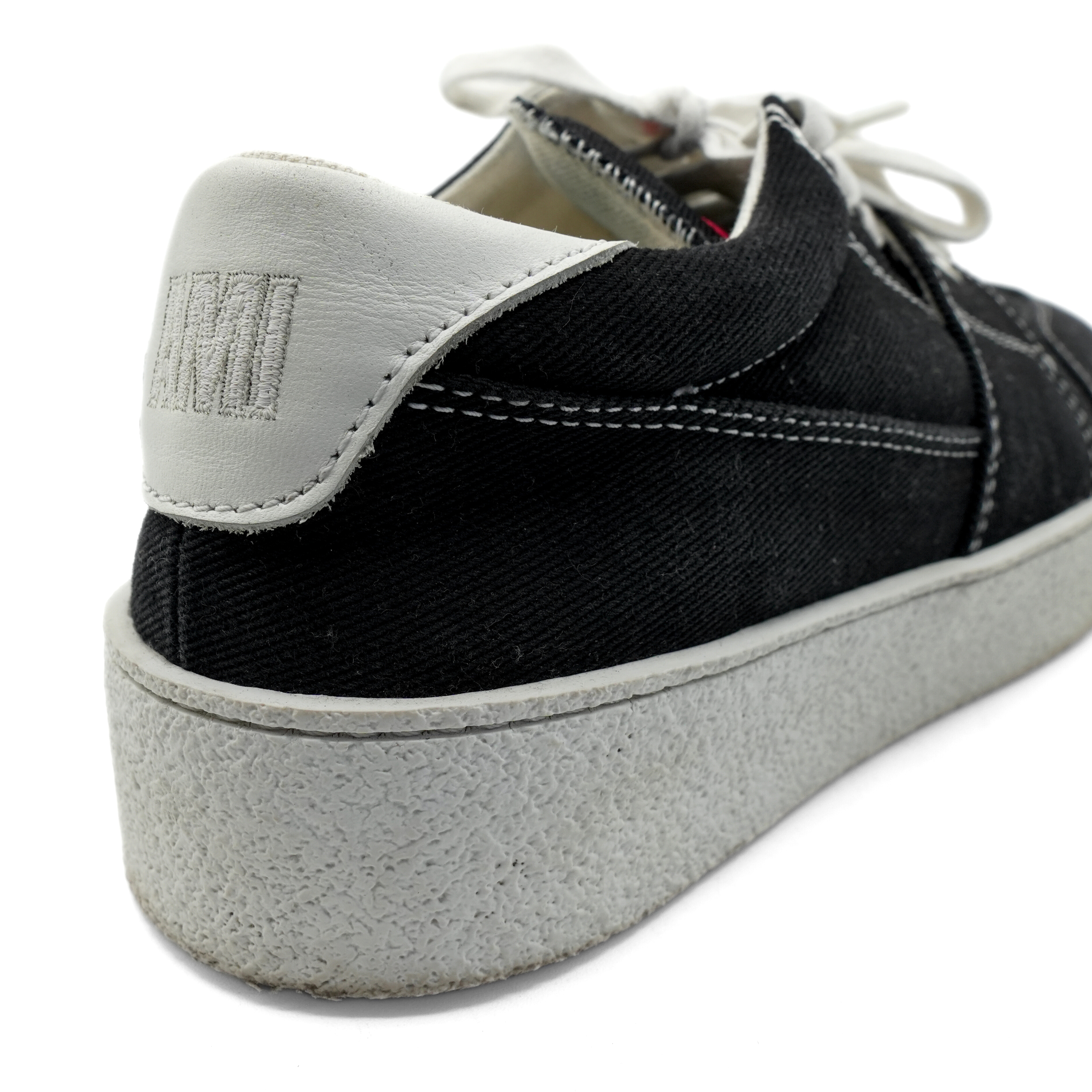 Ami 'De Coeur' low-top sneakers in black canvas with a white chunky sole, white contrast stitching and a red heart embroidery on the tongue.
