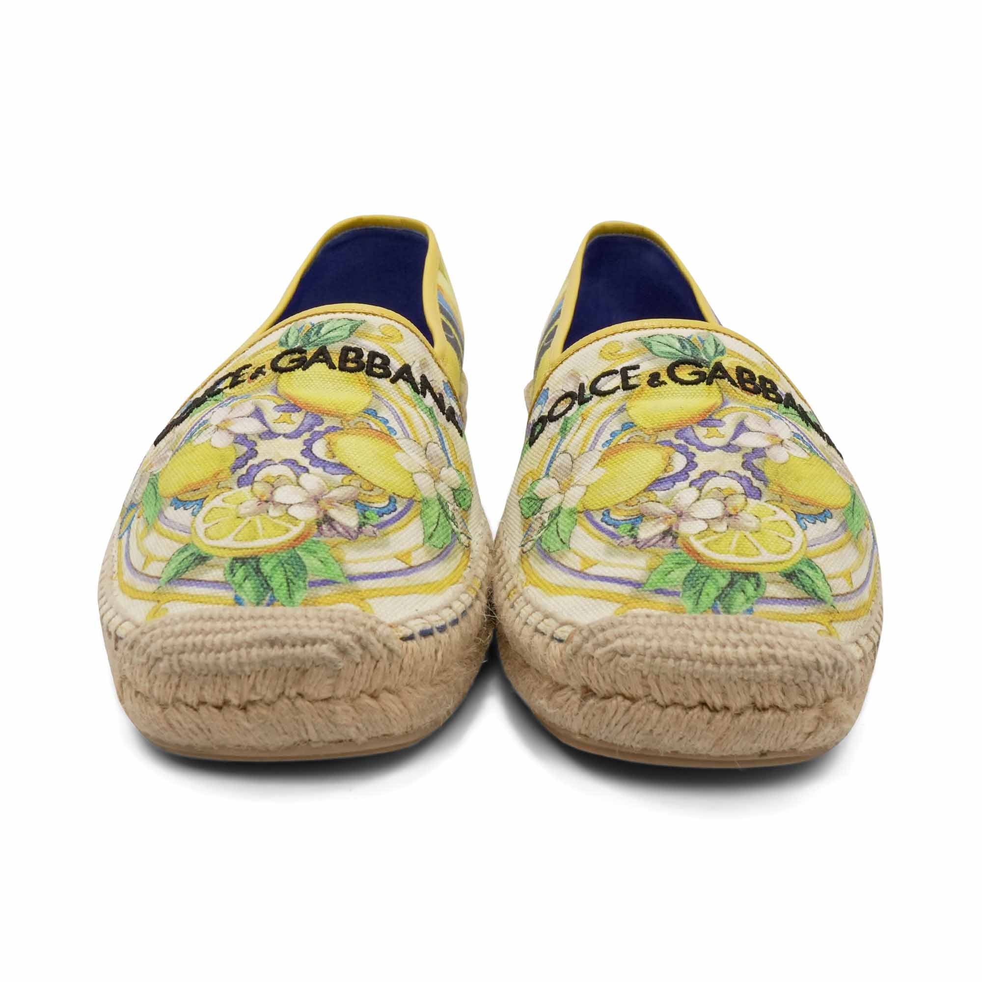 Dolce & Gabbana 'Lemon' espadrilles in cream, yellow and blue canvas with an all-over lemon tile print, yellow leather trim, and a woven sole.