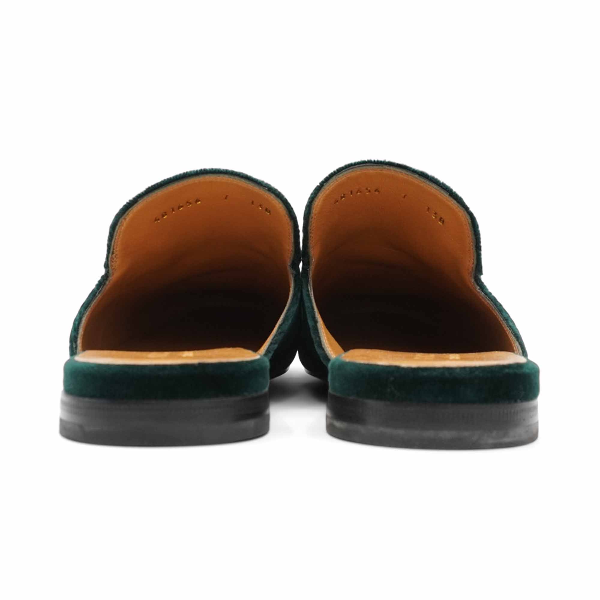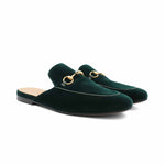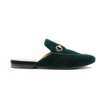 Gucci 'Princetown' mules in dark green velvet with a gold horsebit buckle detail.