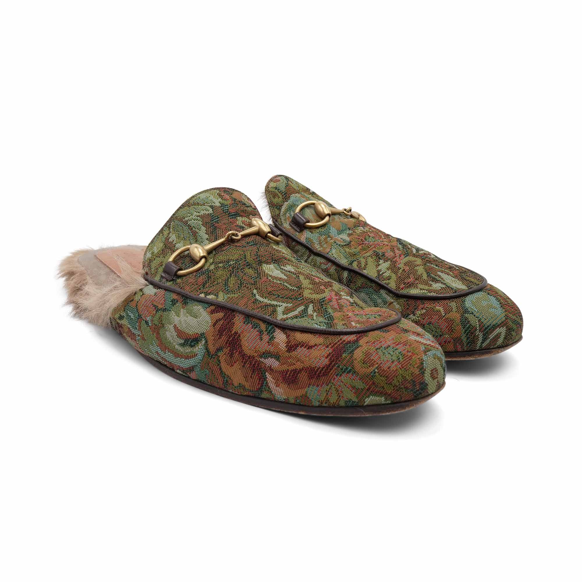 Gucci 'Princetown' loafers in brown and green floral tapestry jacquard with brown leather trim, a fur trim around the heels, and a brush gold horsebit buckle.