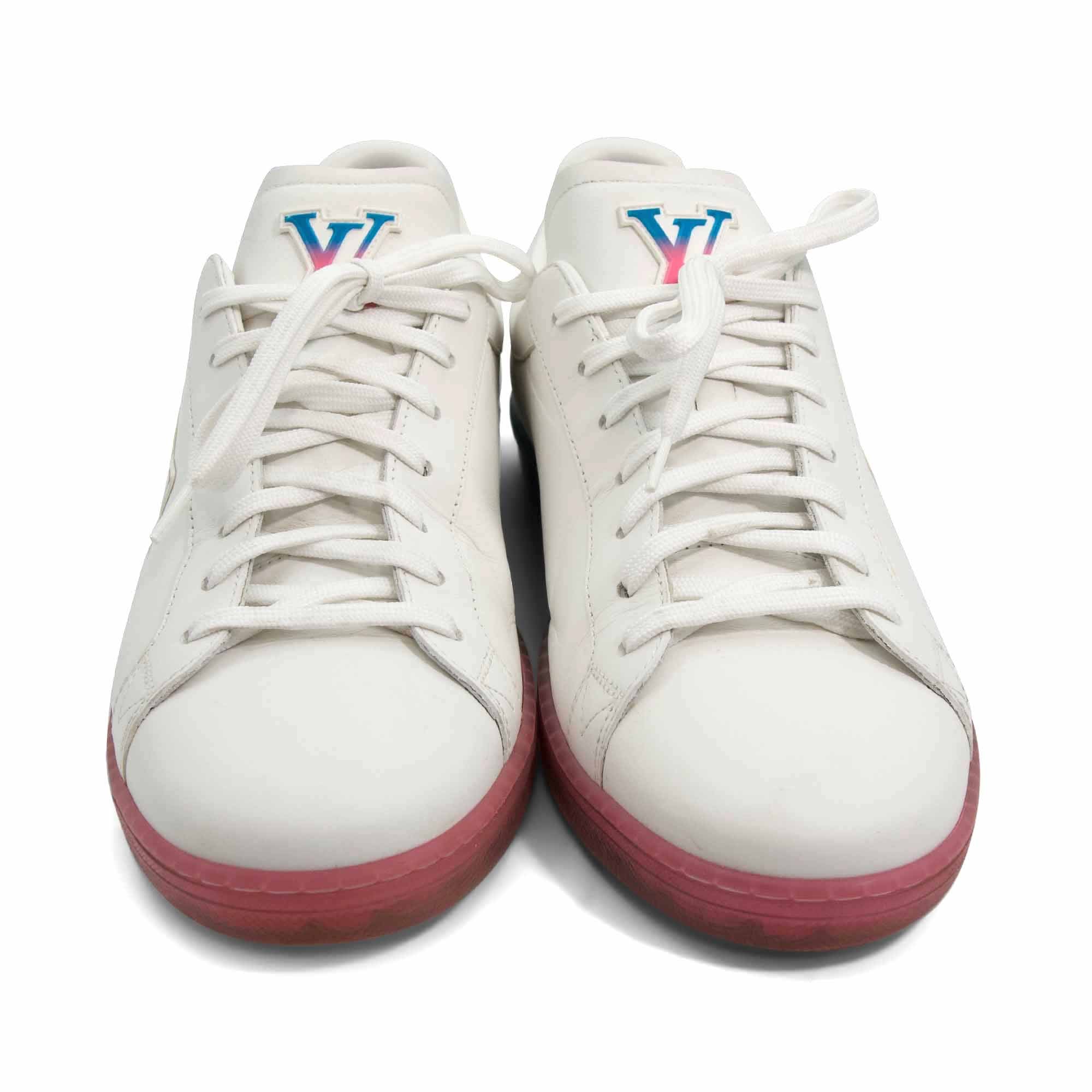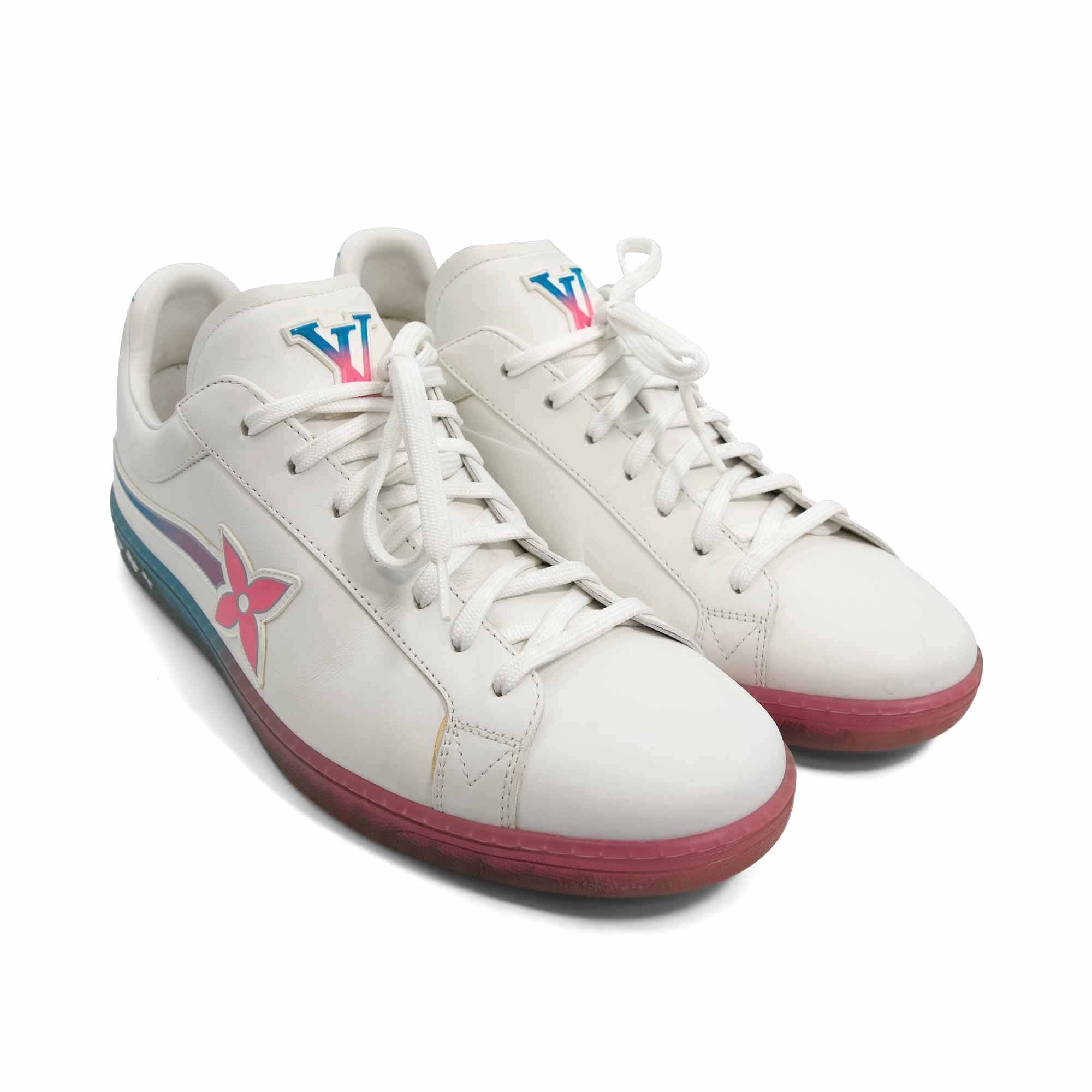 Louis Vuitton 'Luxembourg' low-top sneaker in white leather with a blue, purple and pink gradient flower swoosh on the side, blue halftone monogram on heels and gradient logo on front tongue. Featuring a rubber blue to pink gradient sole with Fleur detailing and flat lace