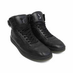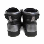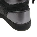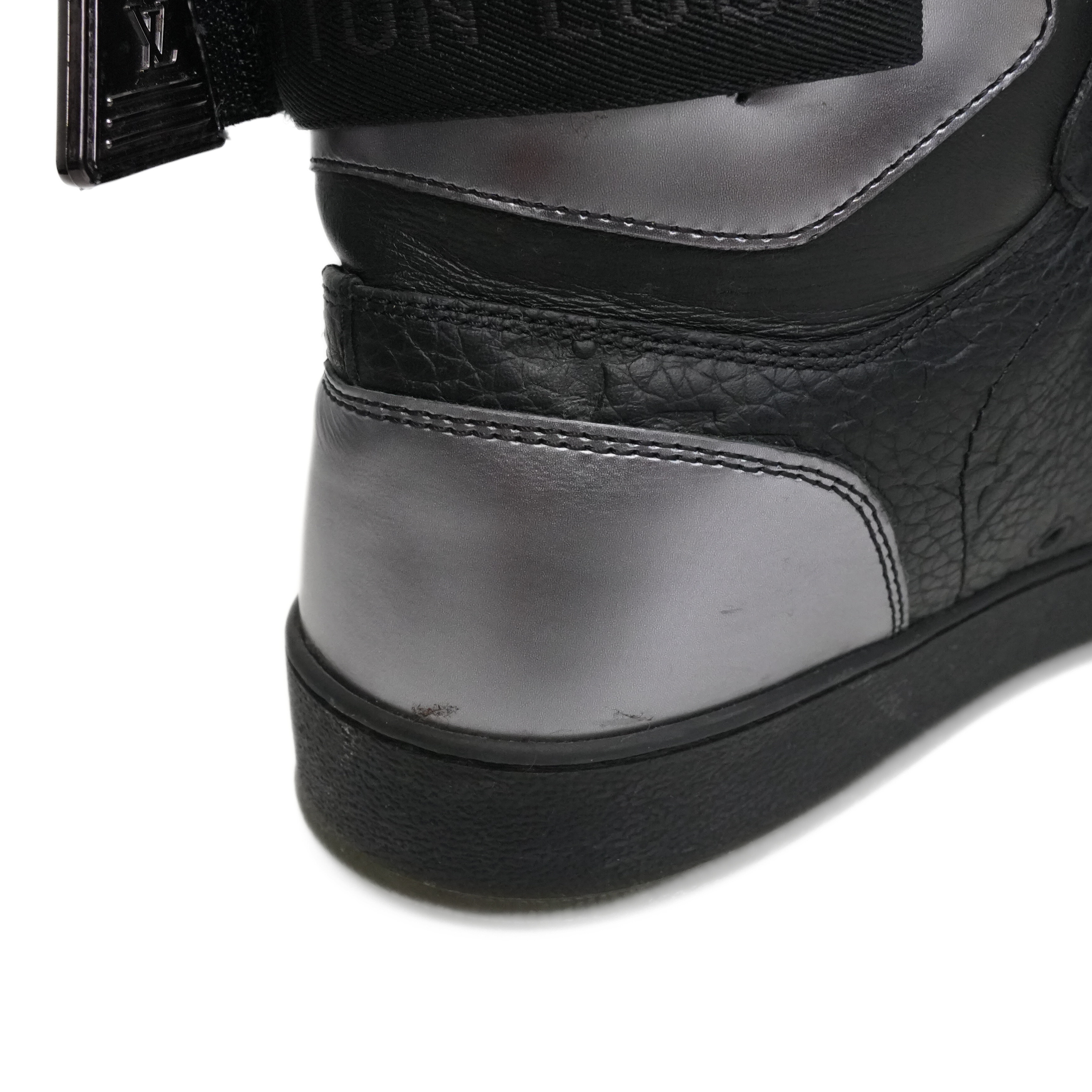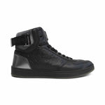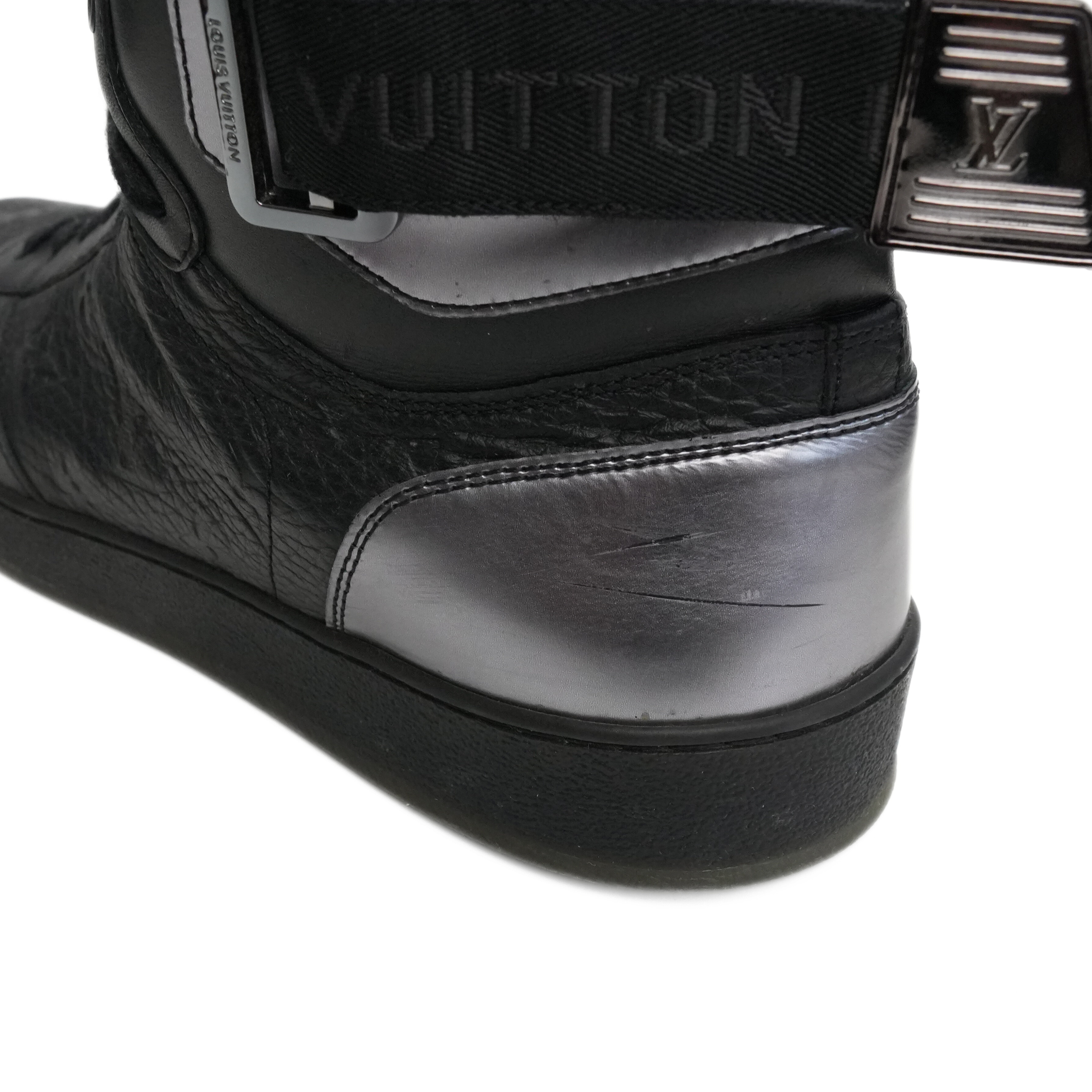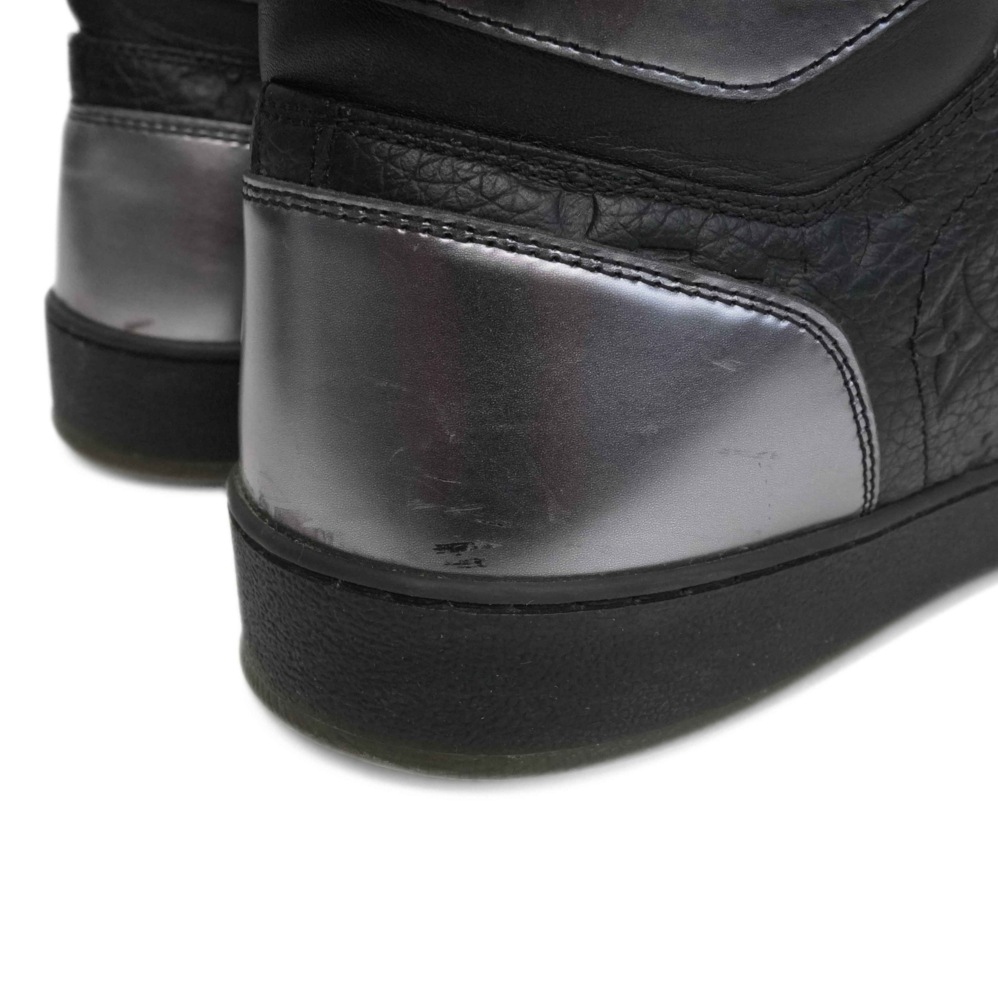 Louis Vuitton high top sneakers with monochrome mini-monogram pattern embossed all over black leather body. Features silver LV initials on tongue, a black velcro strap on back with the logo, silver heel and collar, and transparent rubber outer sole.