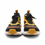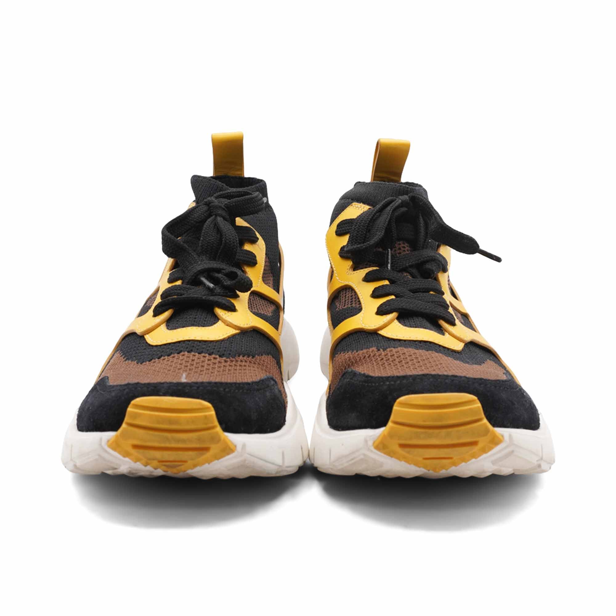 Valentino 'Sound High' mid-top sneakers in black and brown mesh with yellow leather detailing, black suede toe and heel panels and a white chunky sole. Featuring a subtle 3M underlay panel on the heel and a gunmetal rockstud on the back pull tab.