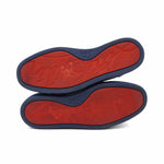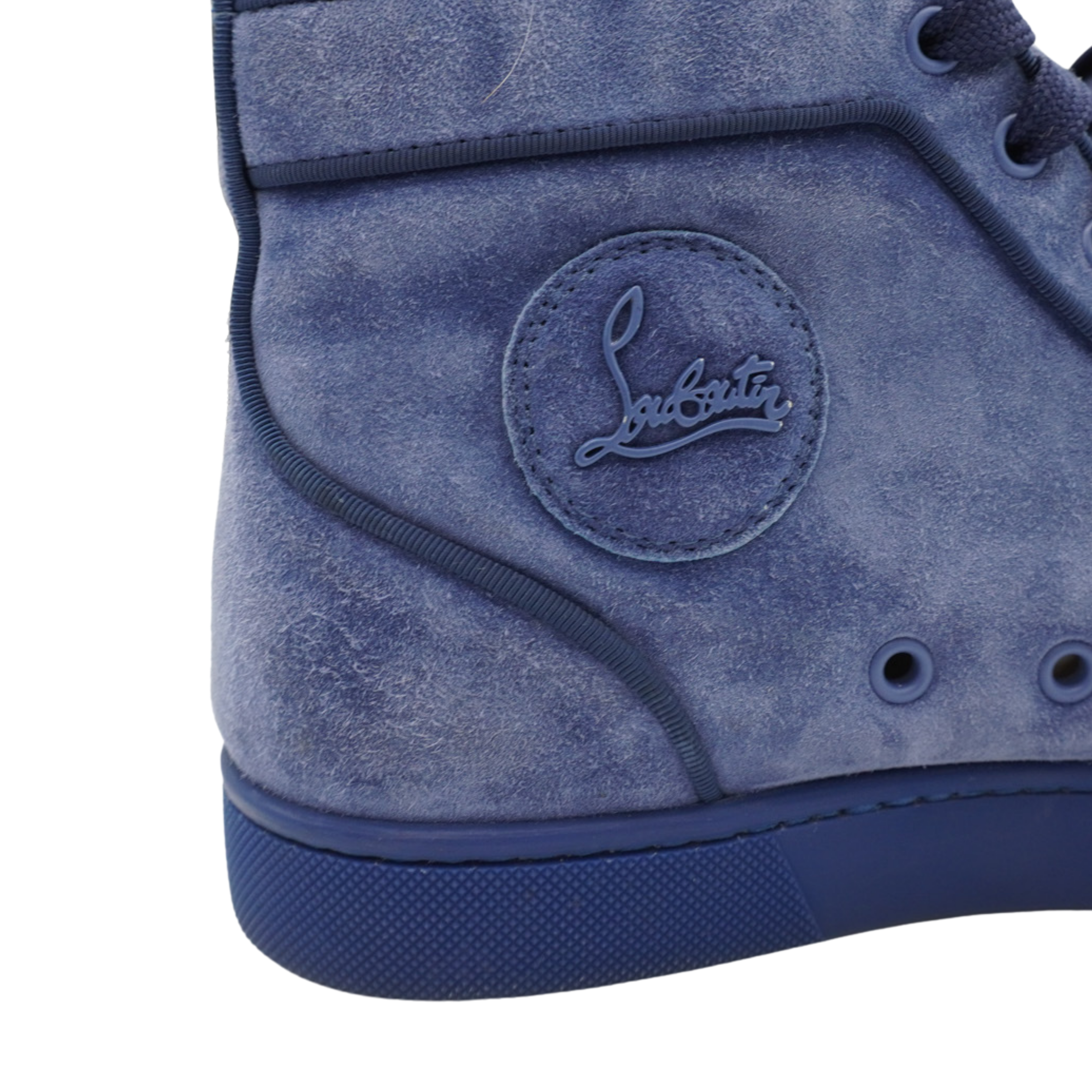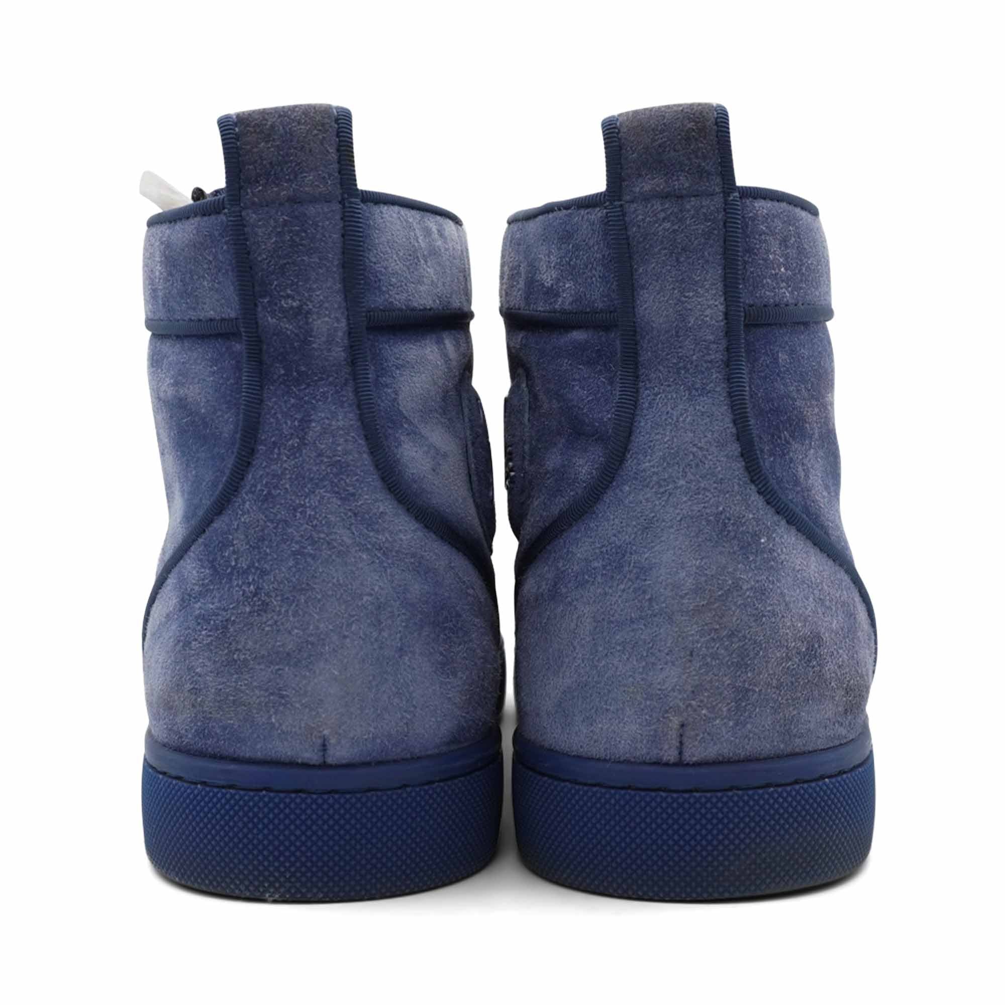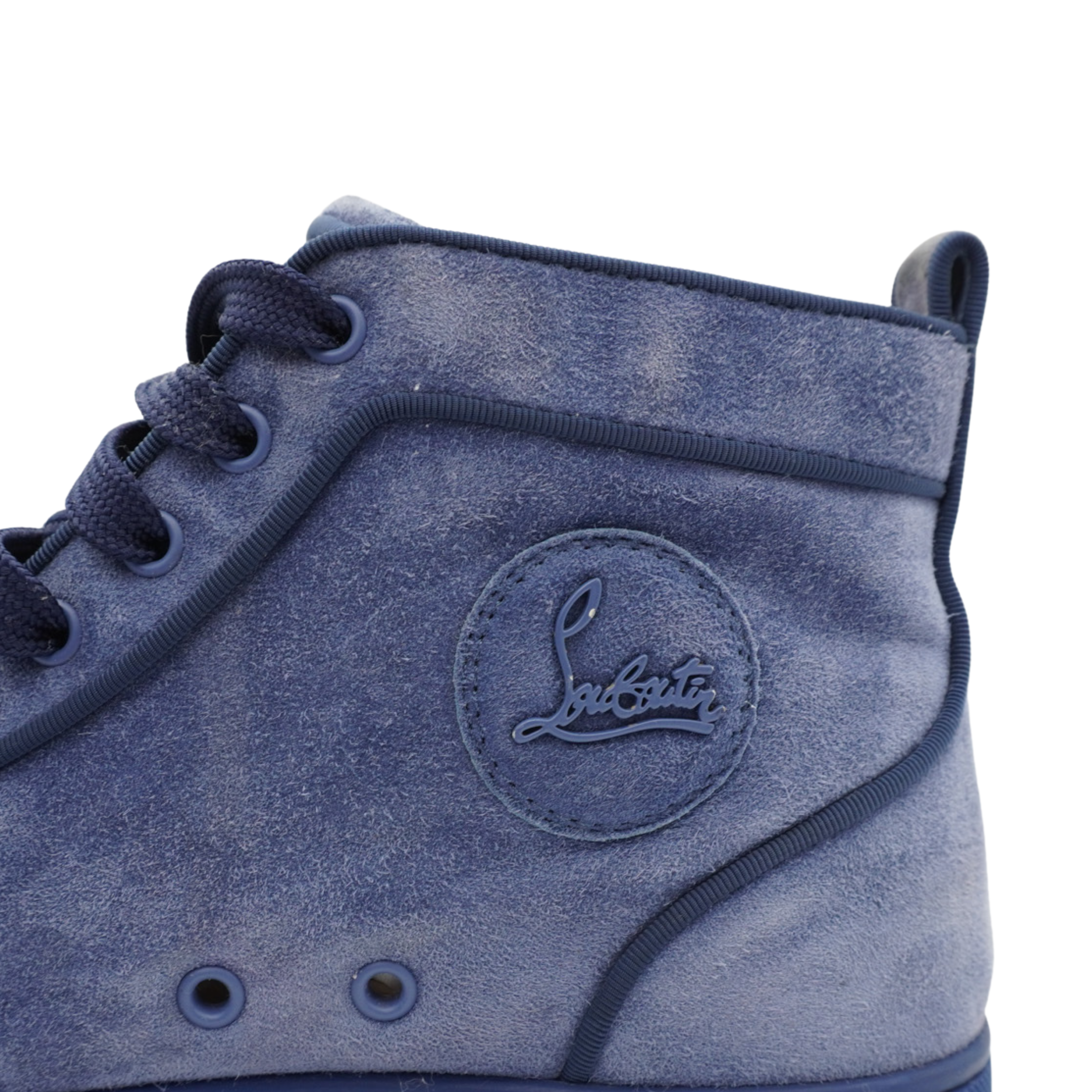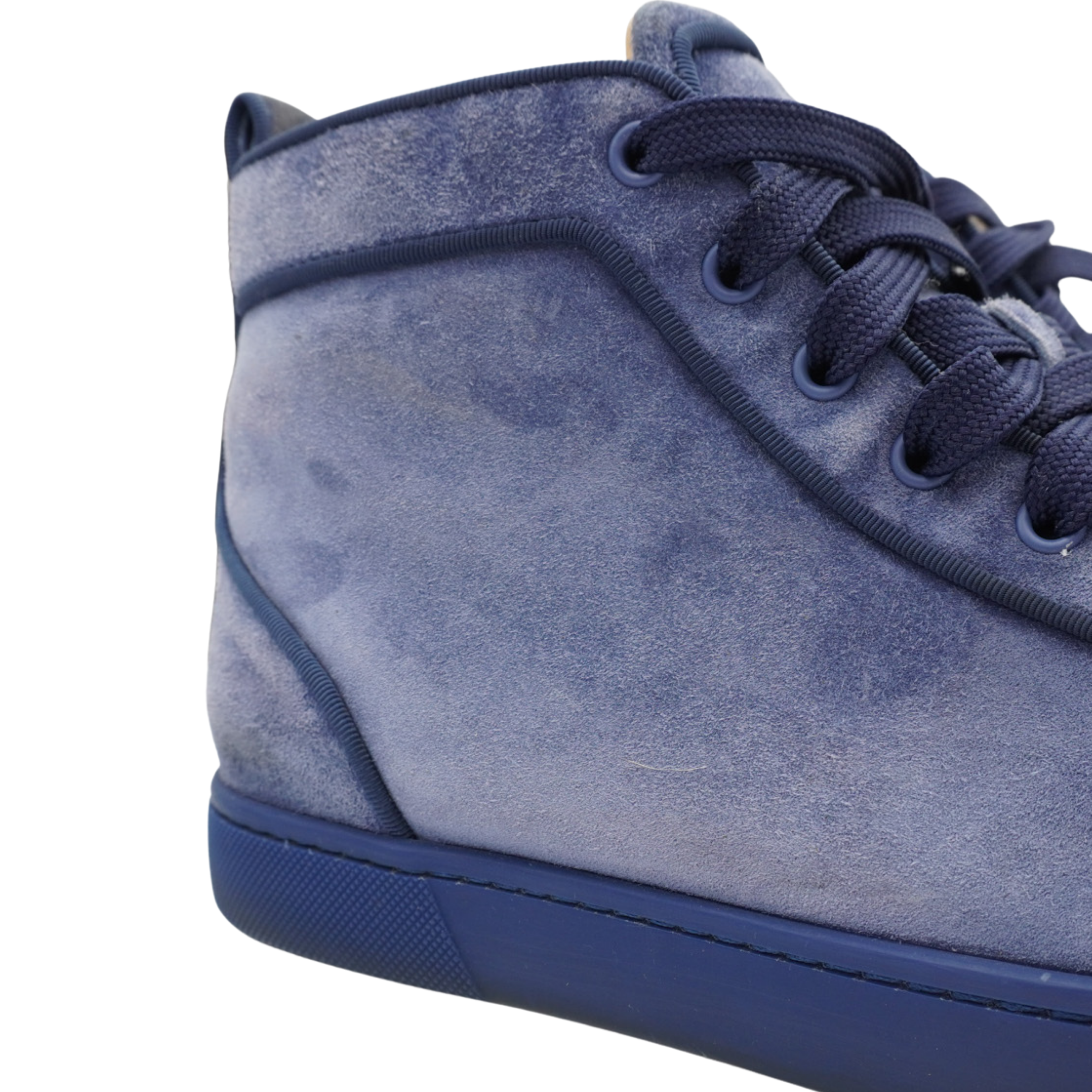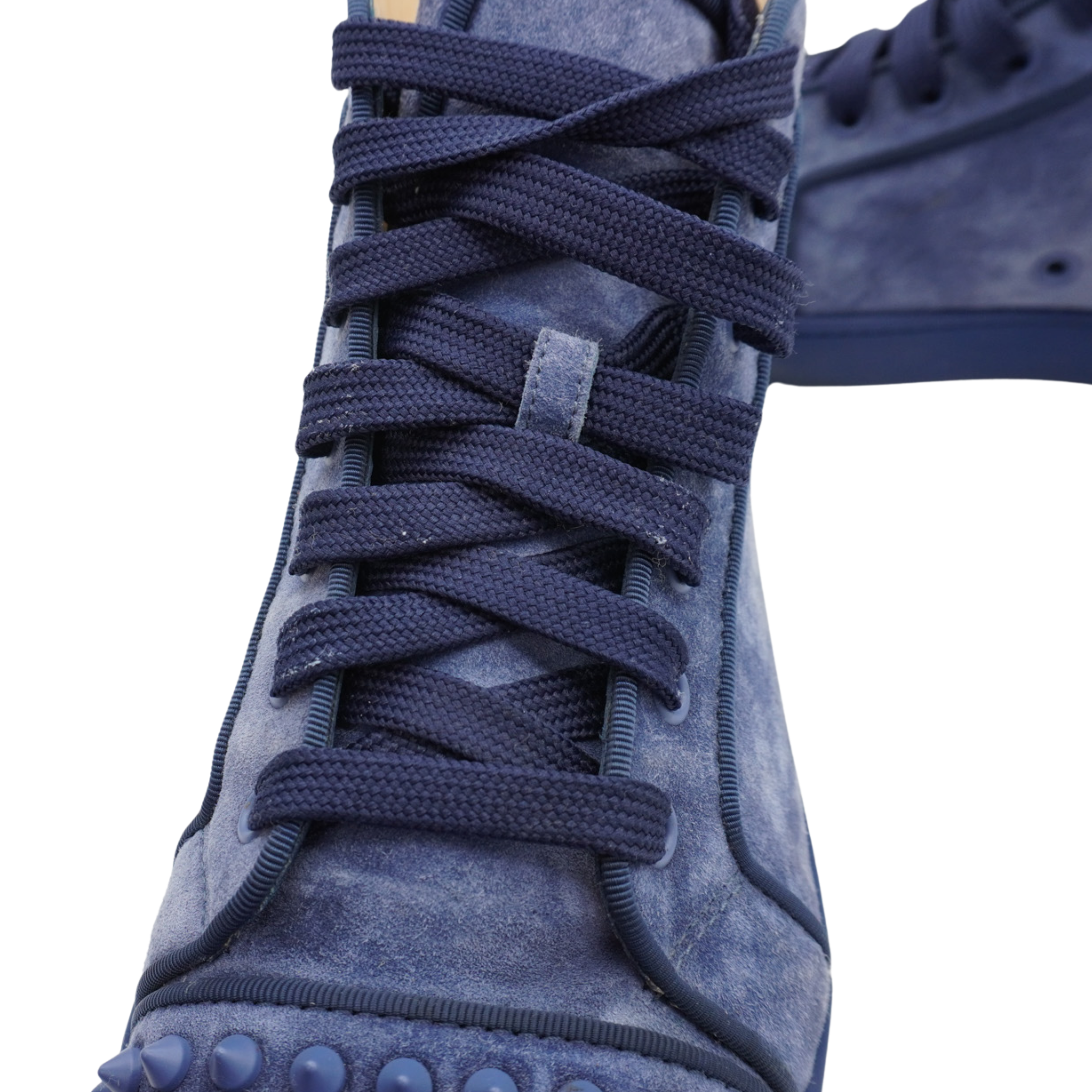 Christian Louboutin 'Louis Spike' high-top sneakers in blue suede with navy laces, an enamel logo on the sides, and tonal rubber spikes on the toe.