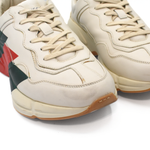 Gucci 'Rhyton' chunky low-top sneakers in cream leather with white rubber sole and red and green stripe graphic on the outer sides. Features cream flat laces, white logo tab on the tongue, and tan rubber undersole.