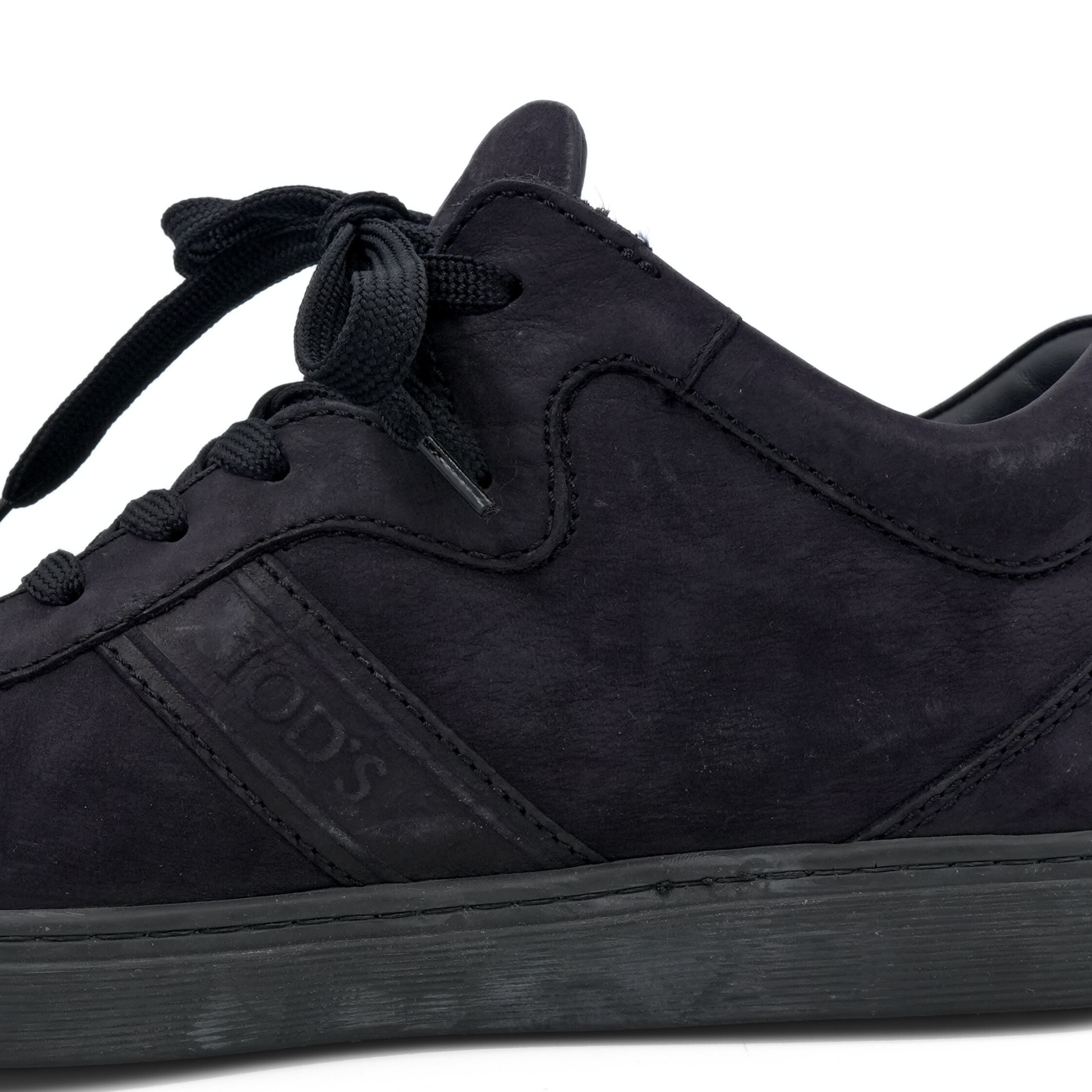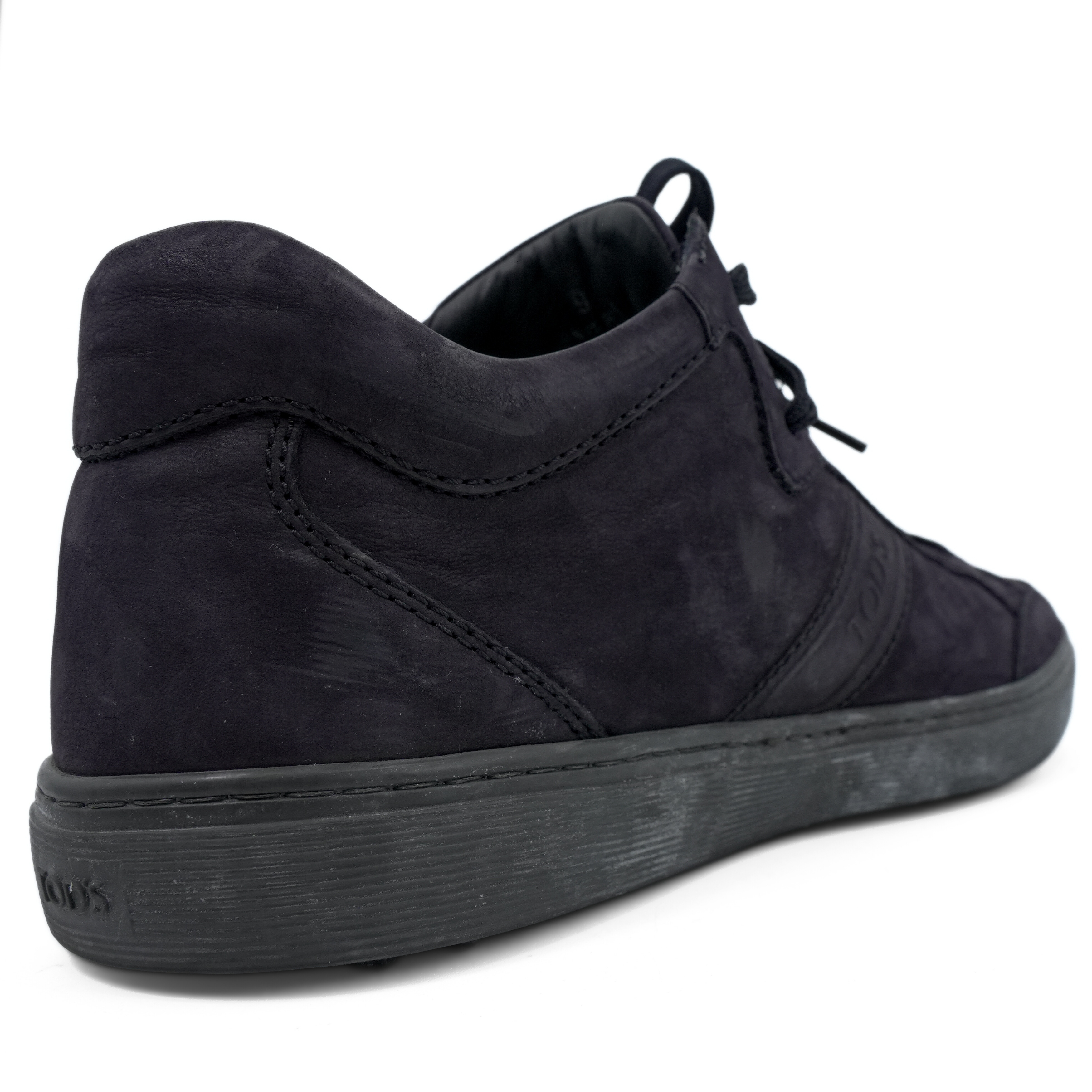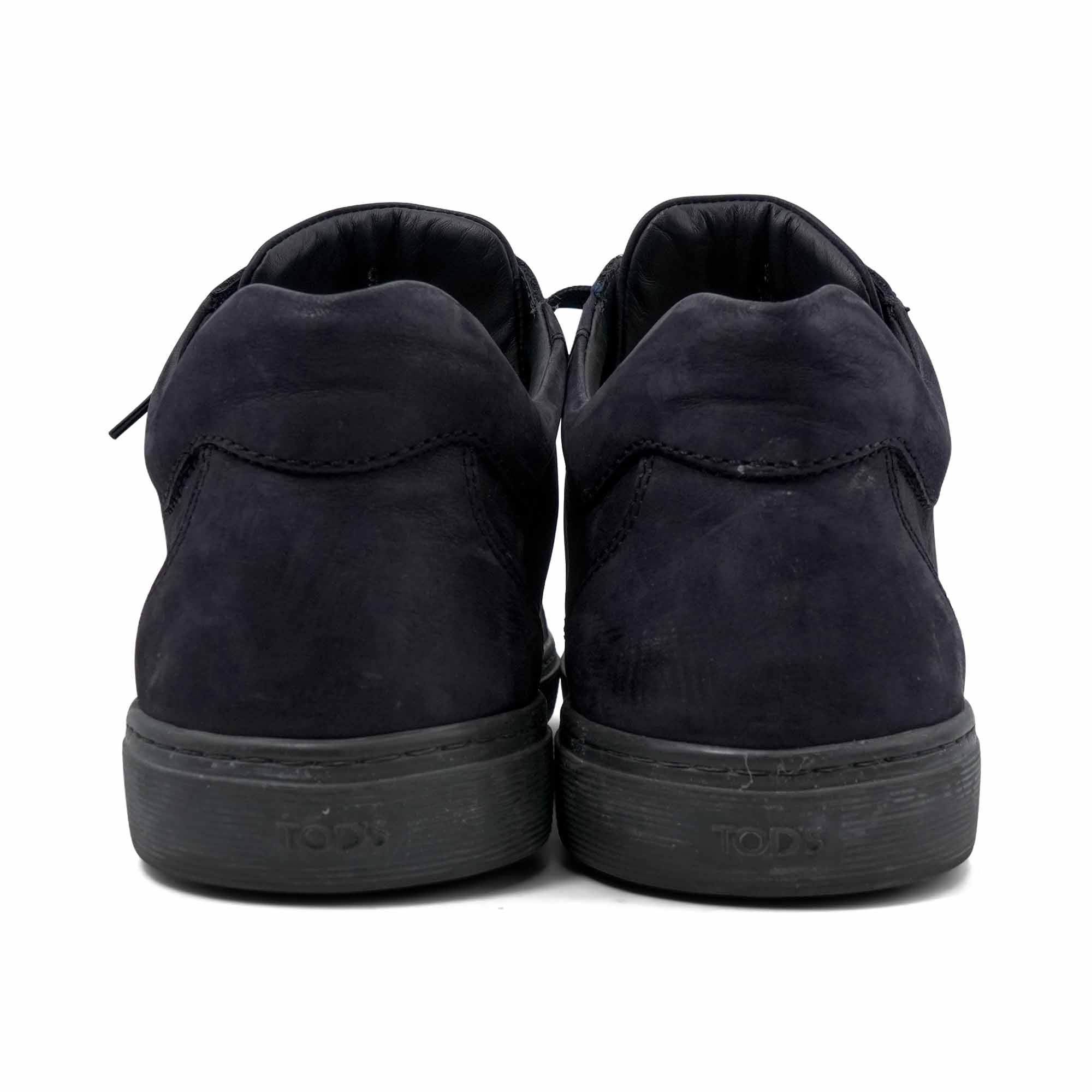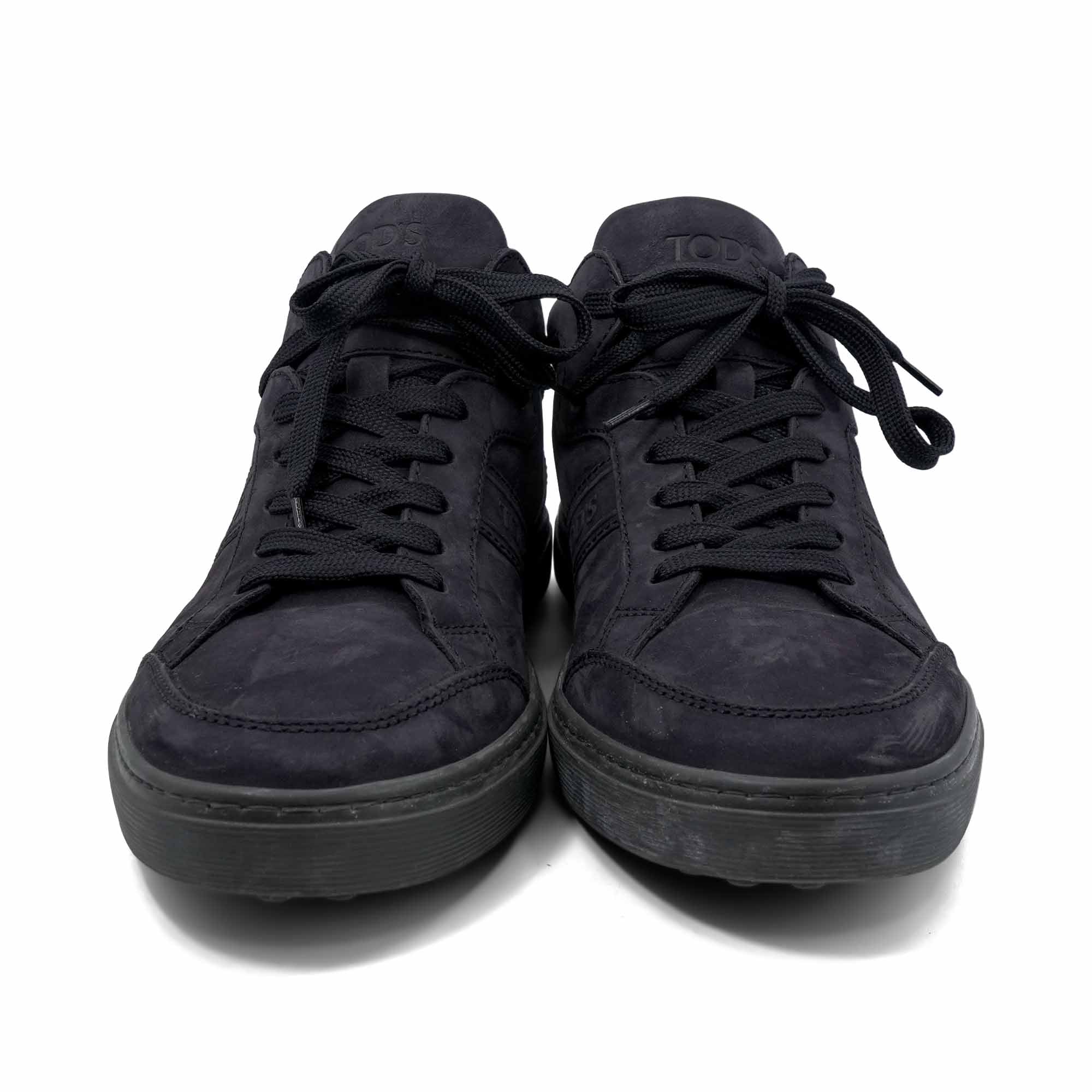 Tod's low top sneakers in navy suede with embossed logo detail, tonal laces, and dark grey rubber soles.