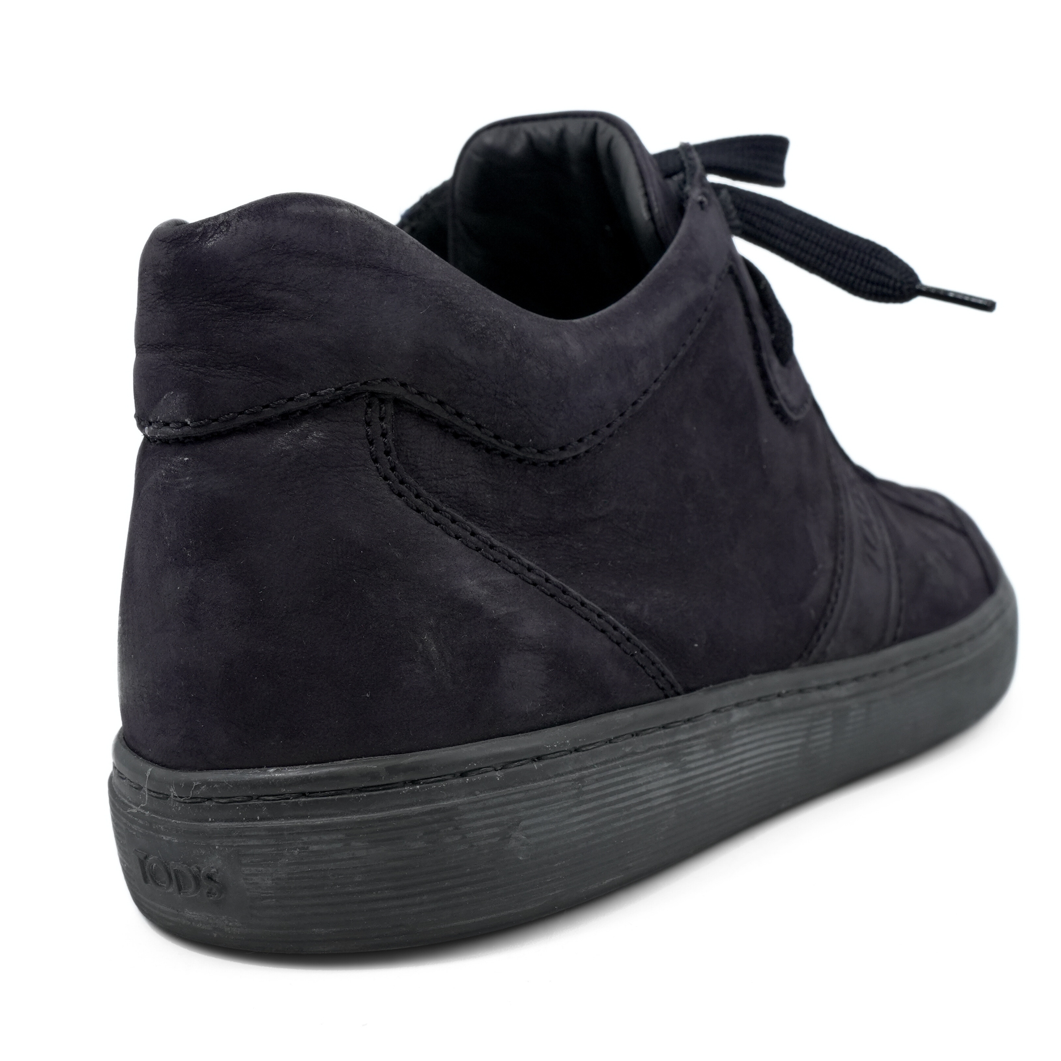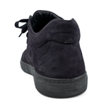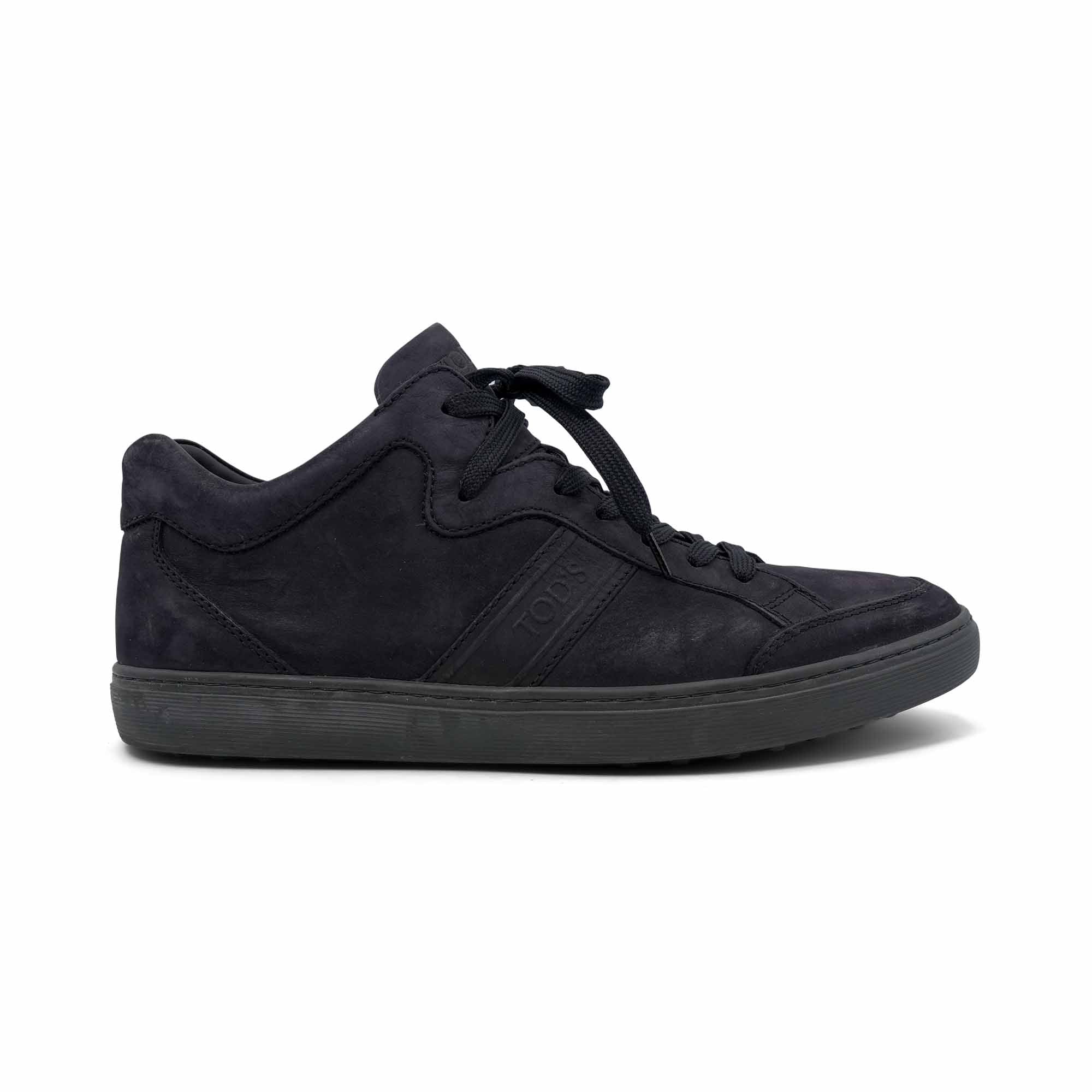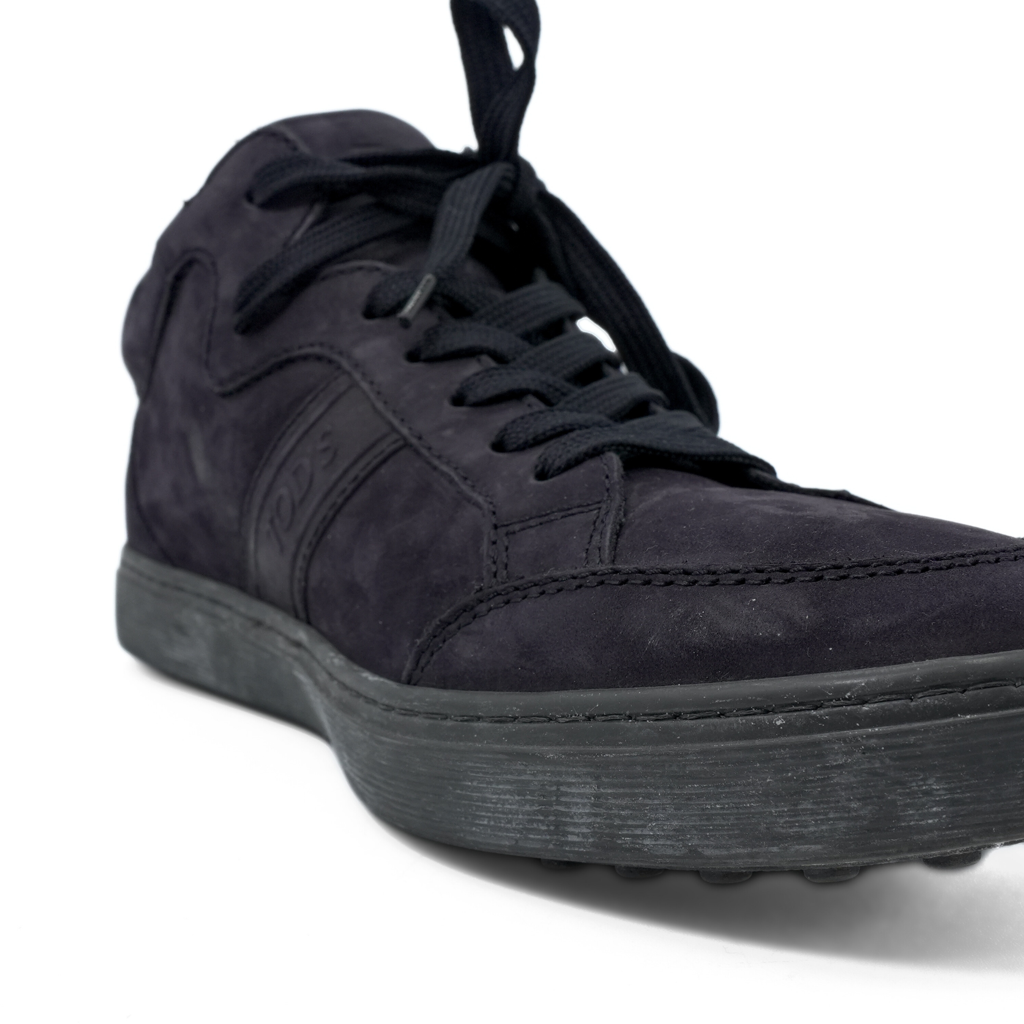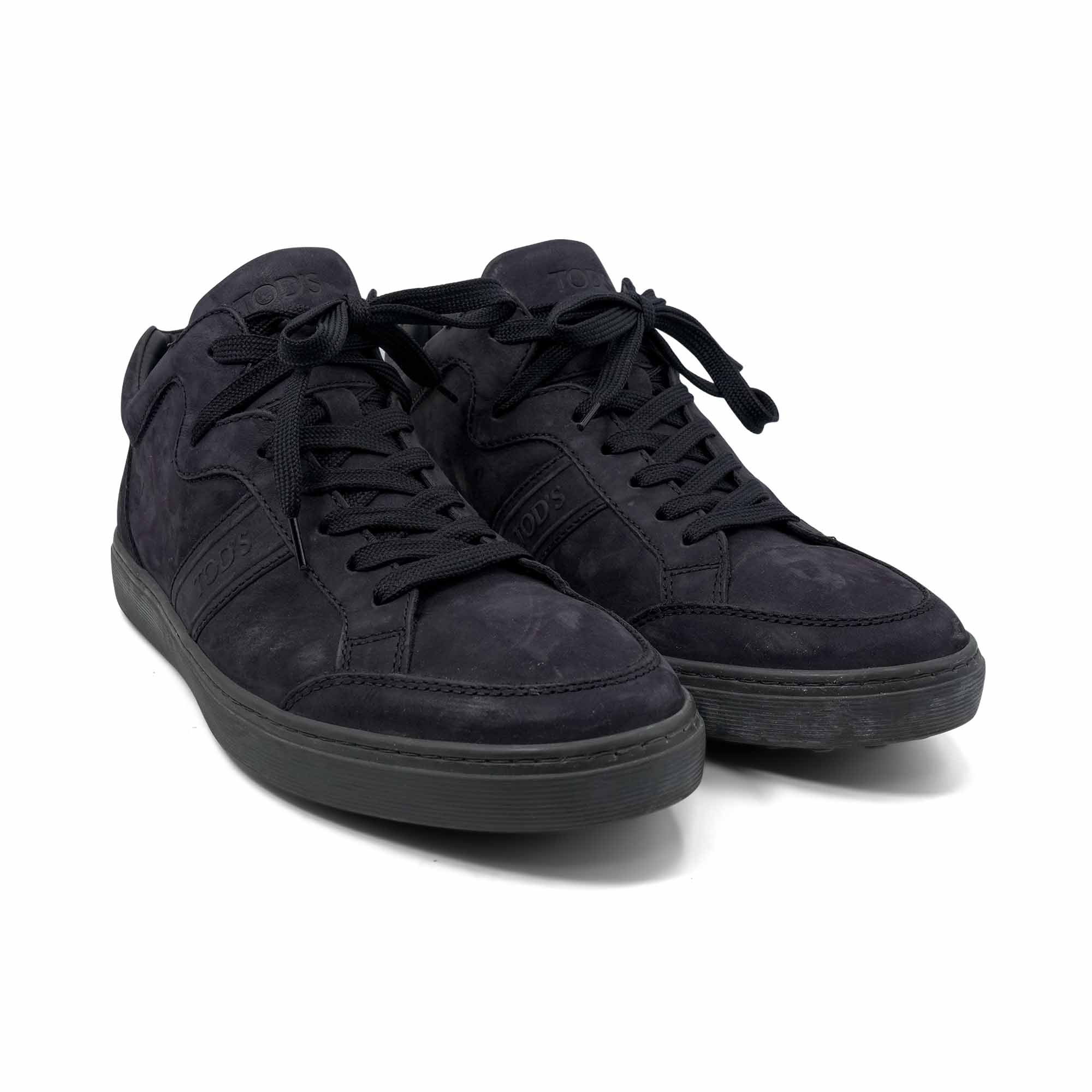 Tod's low top sneakers in navy suede with embossed logo detail, tonal laces, and dark grey rubber soles.