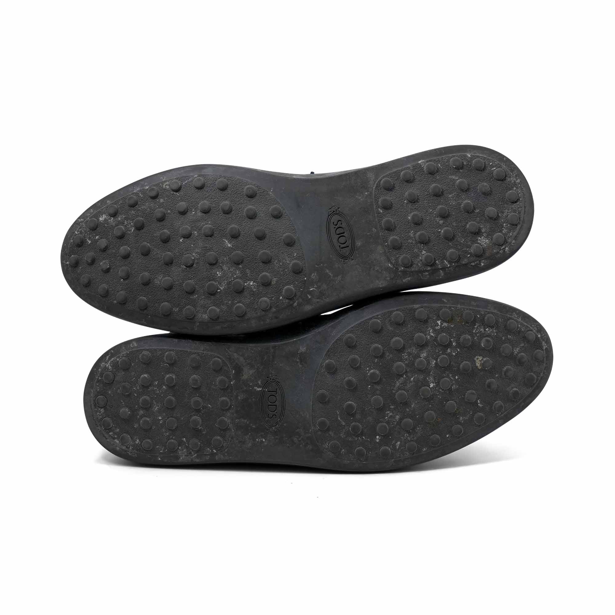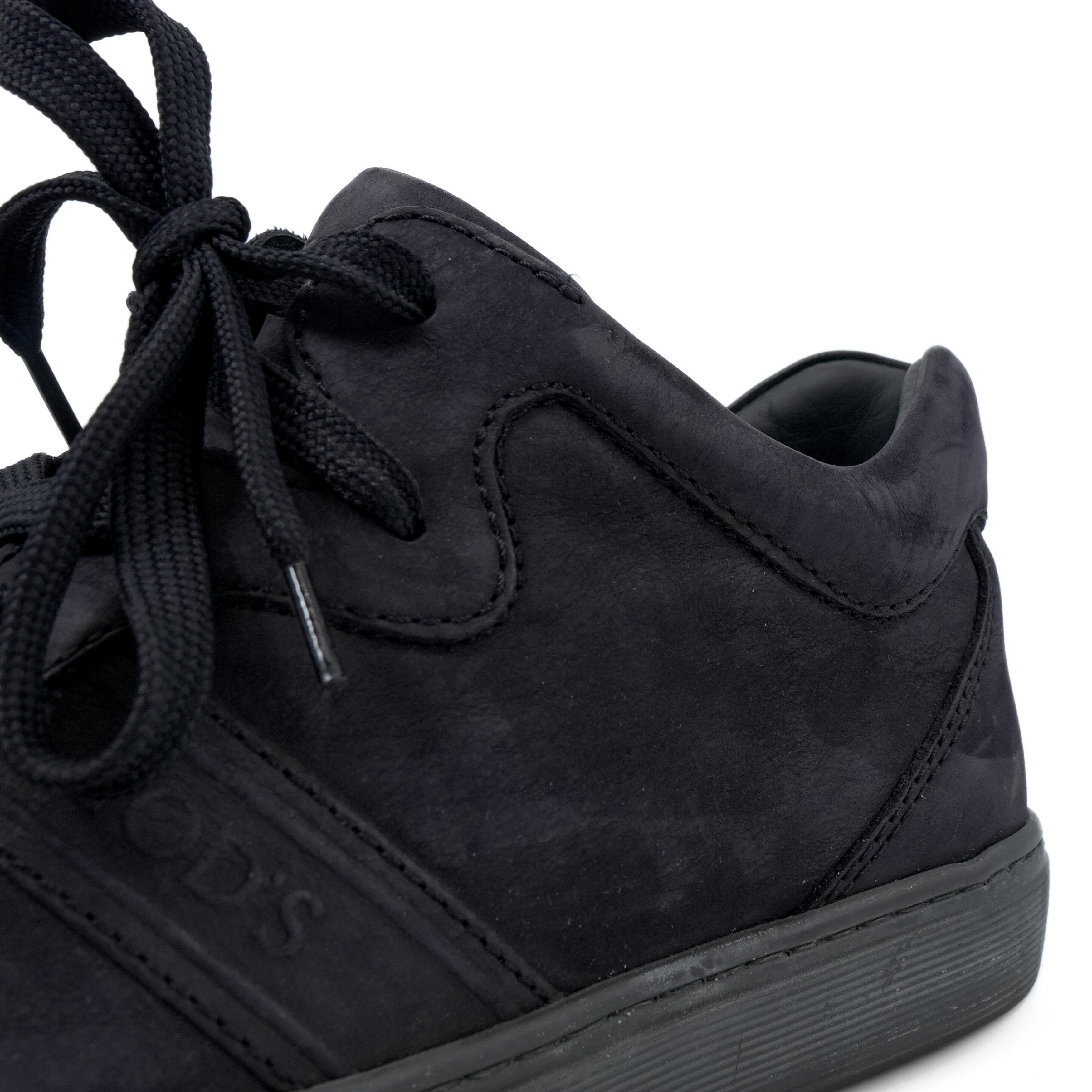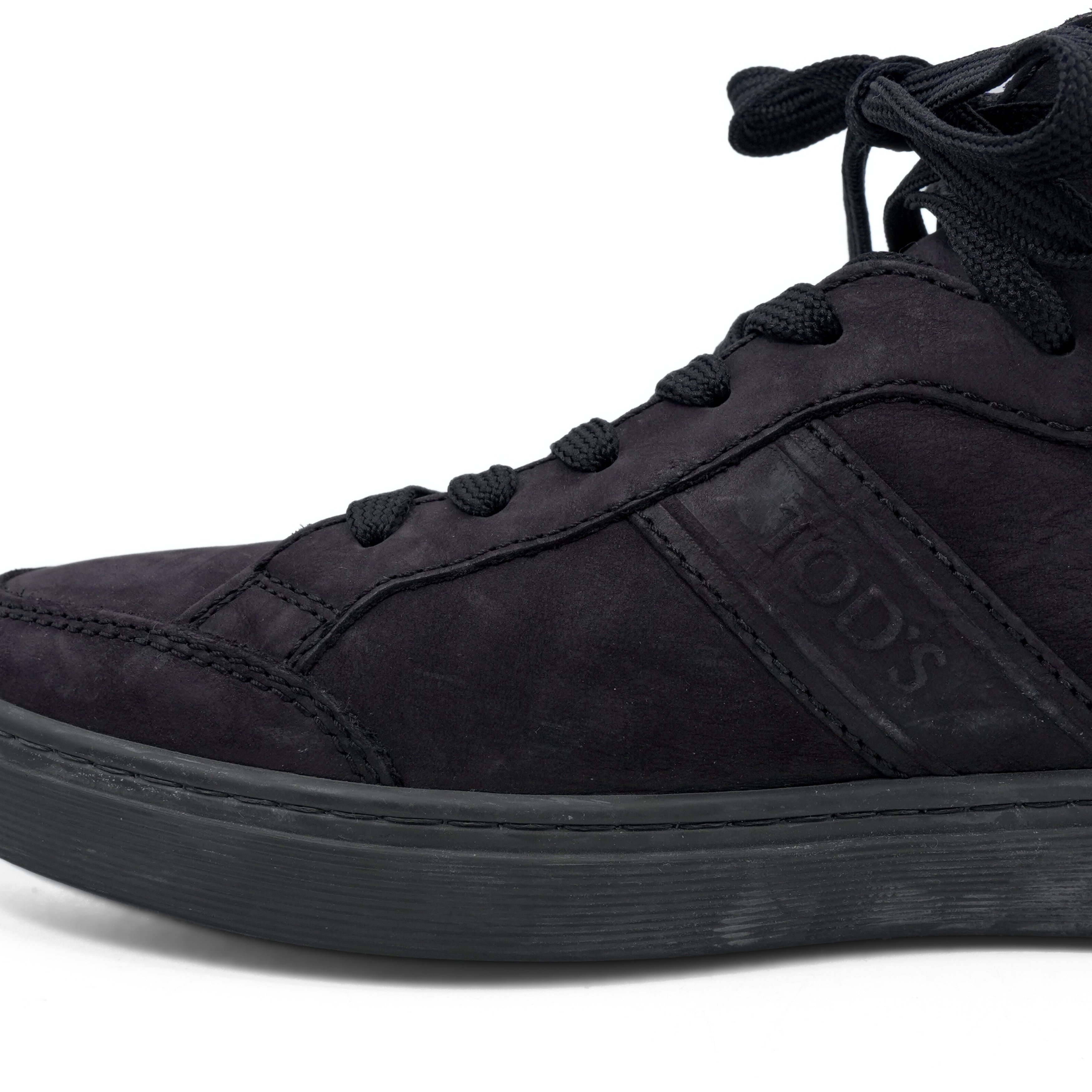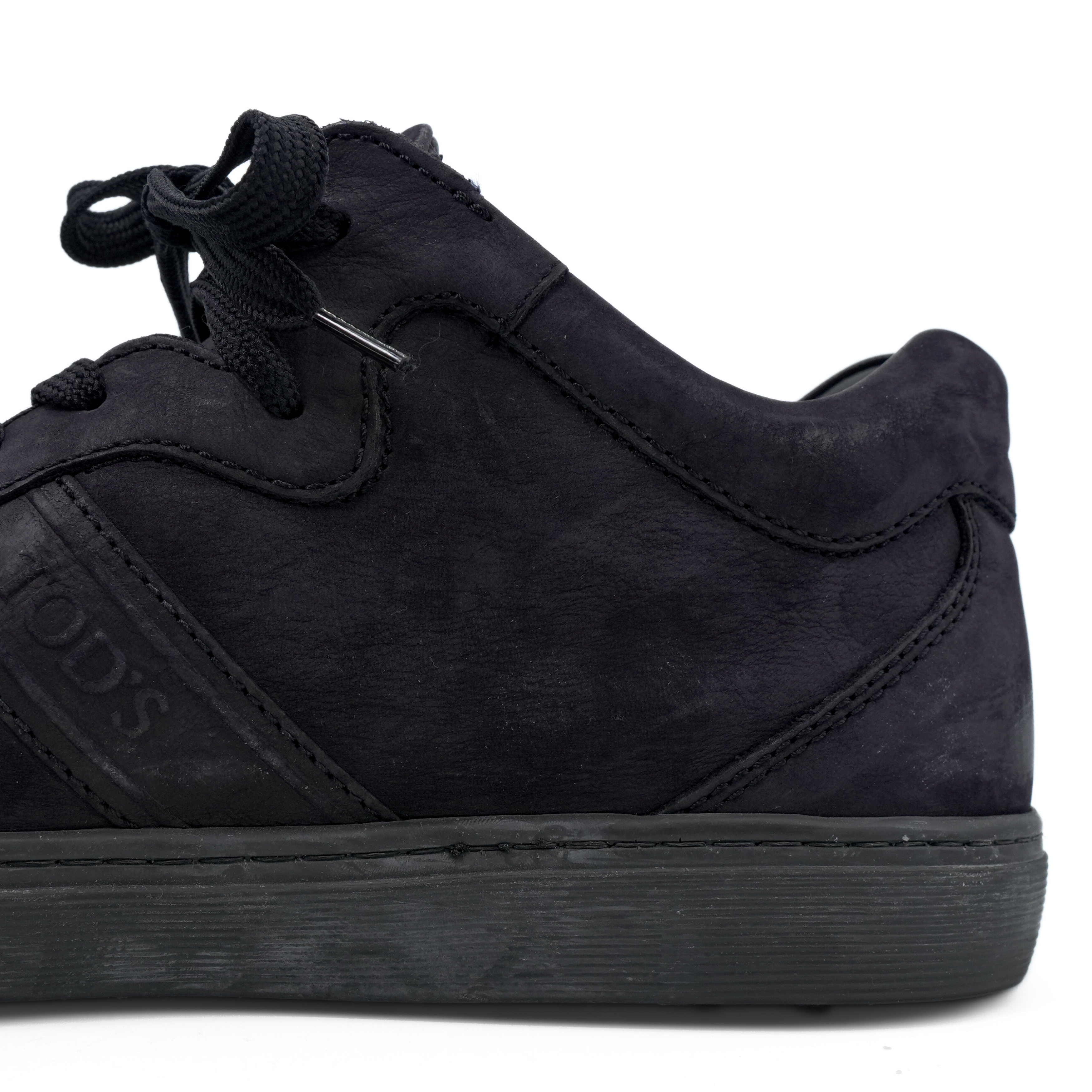 Tod's low top sneakers in navy suede with embossed logo detail, tonal laces, and dark grey rubber soles.