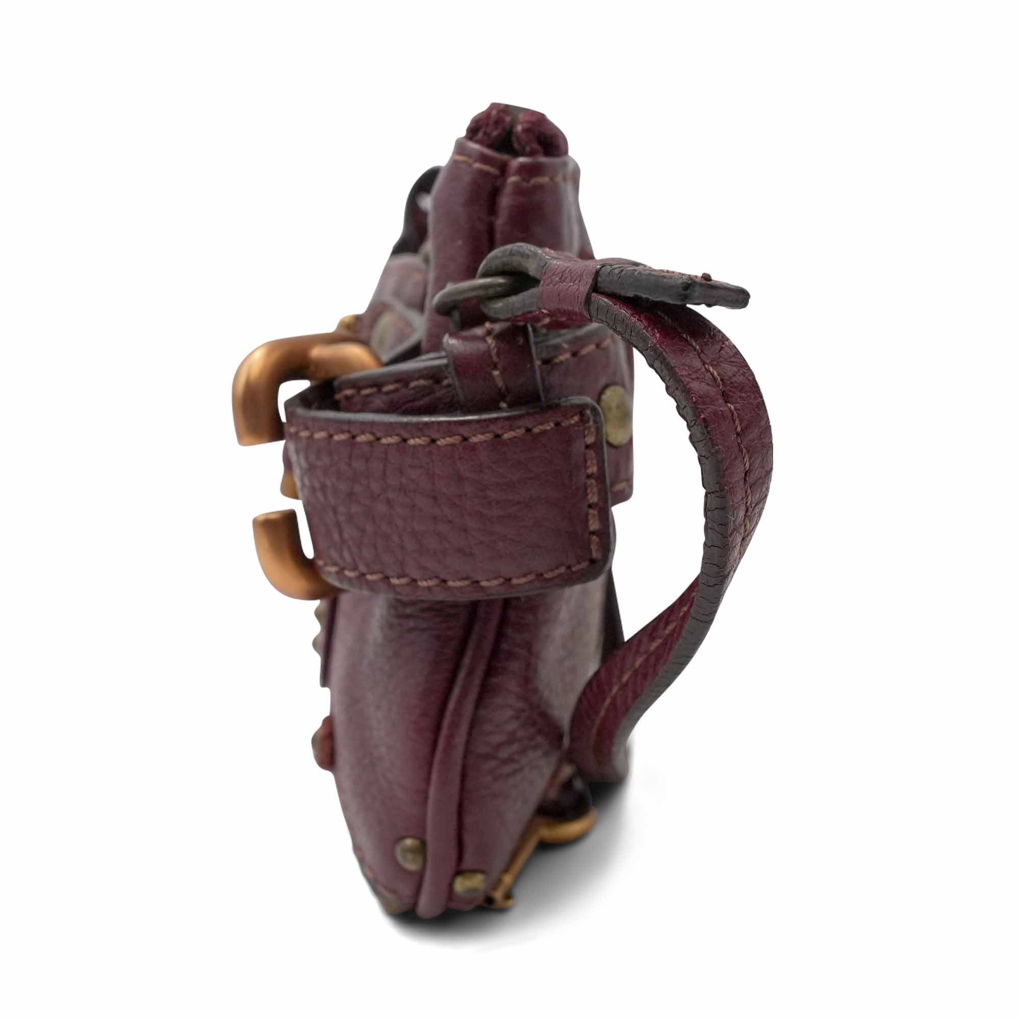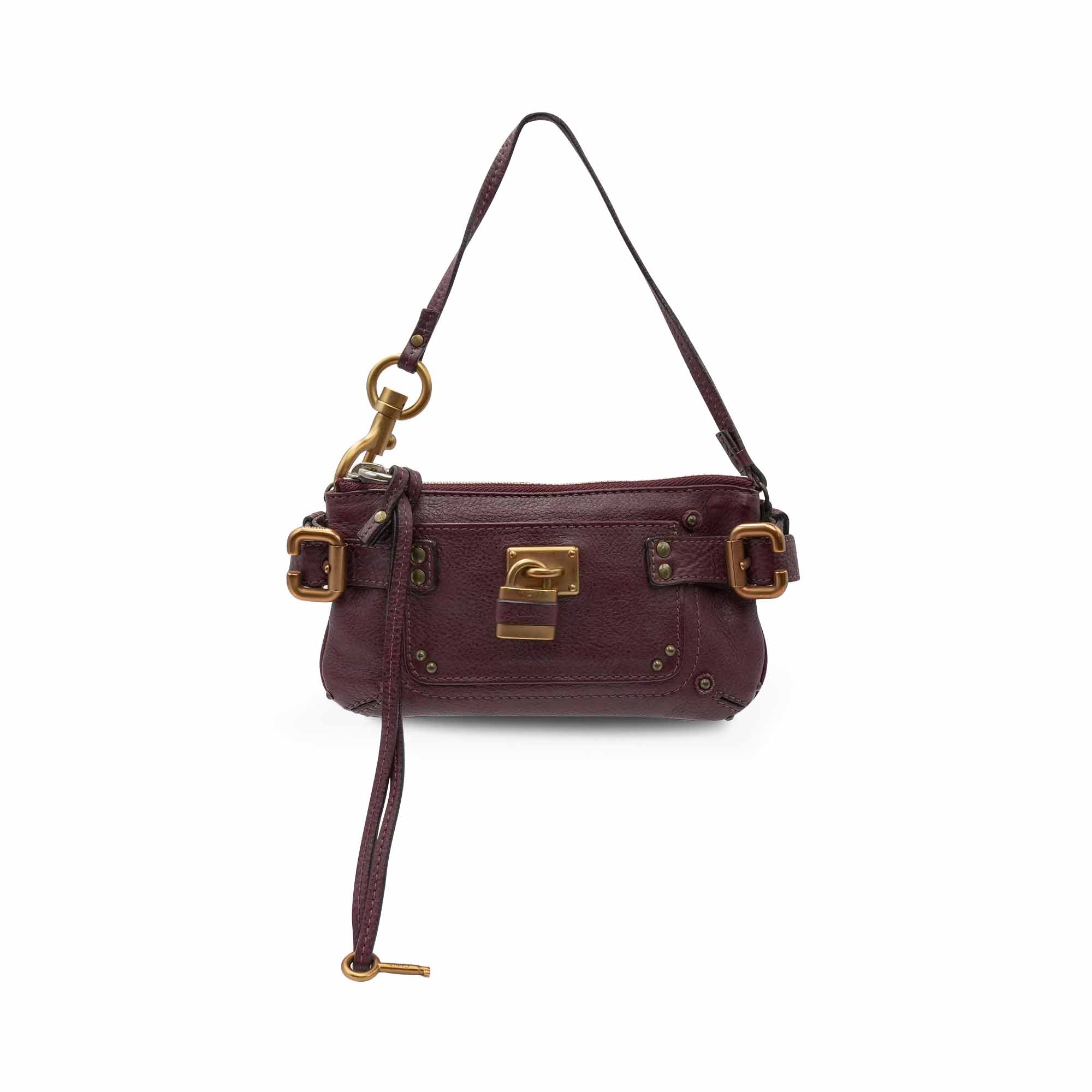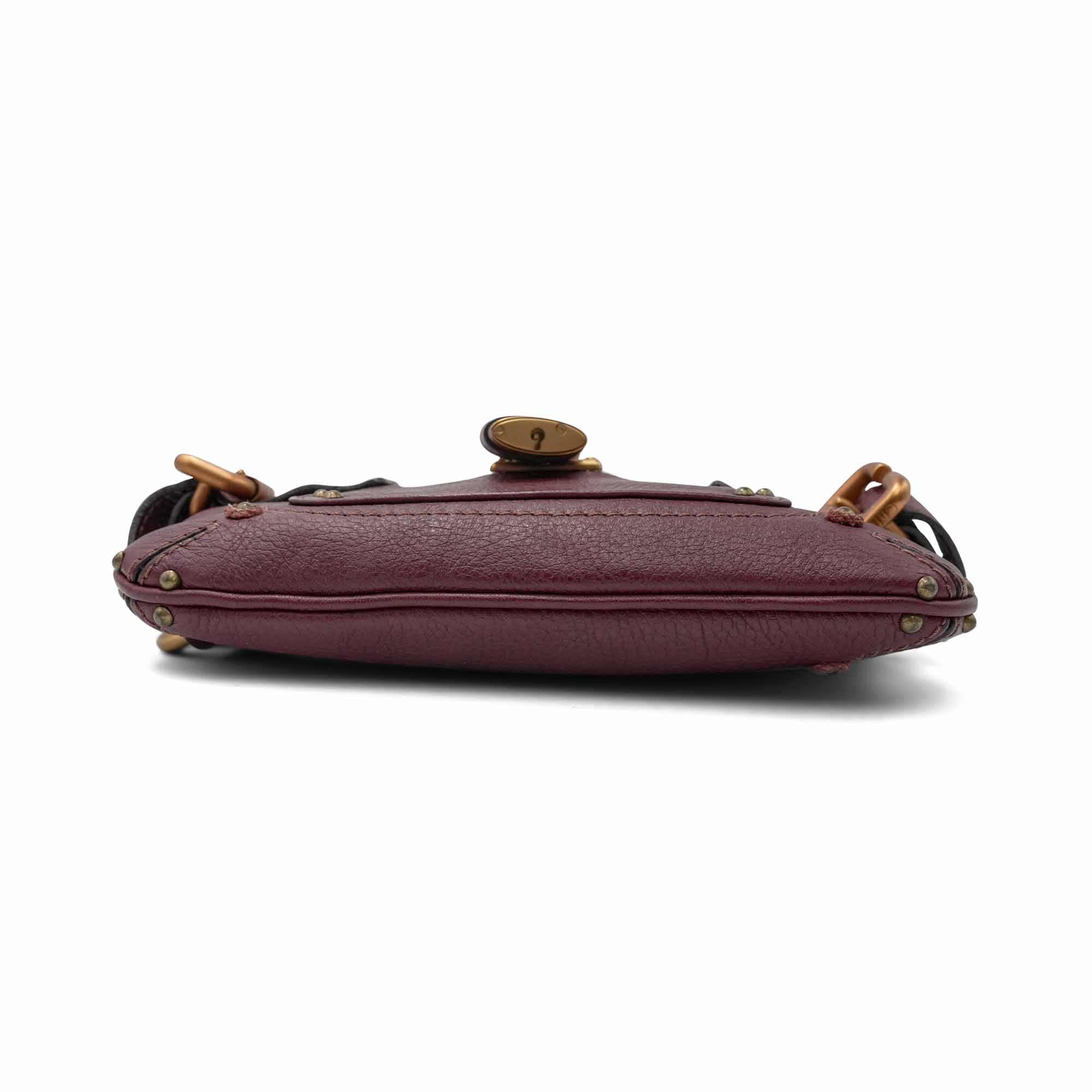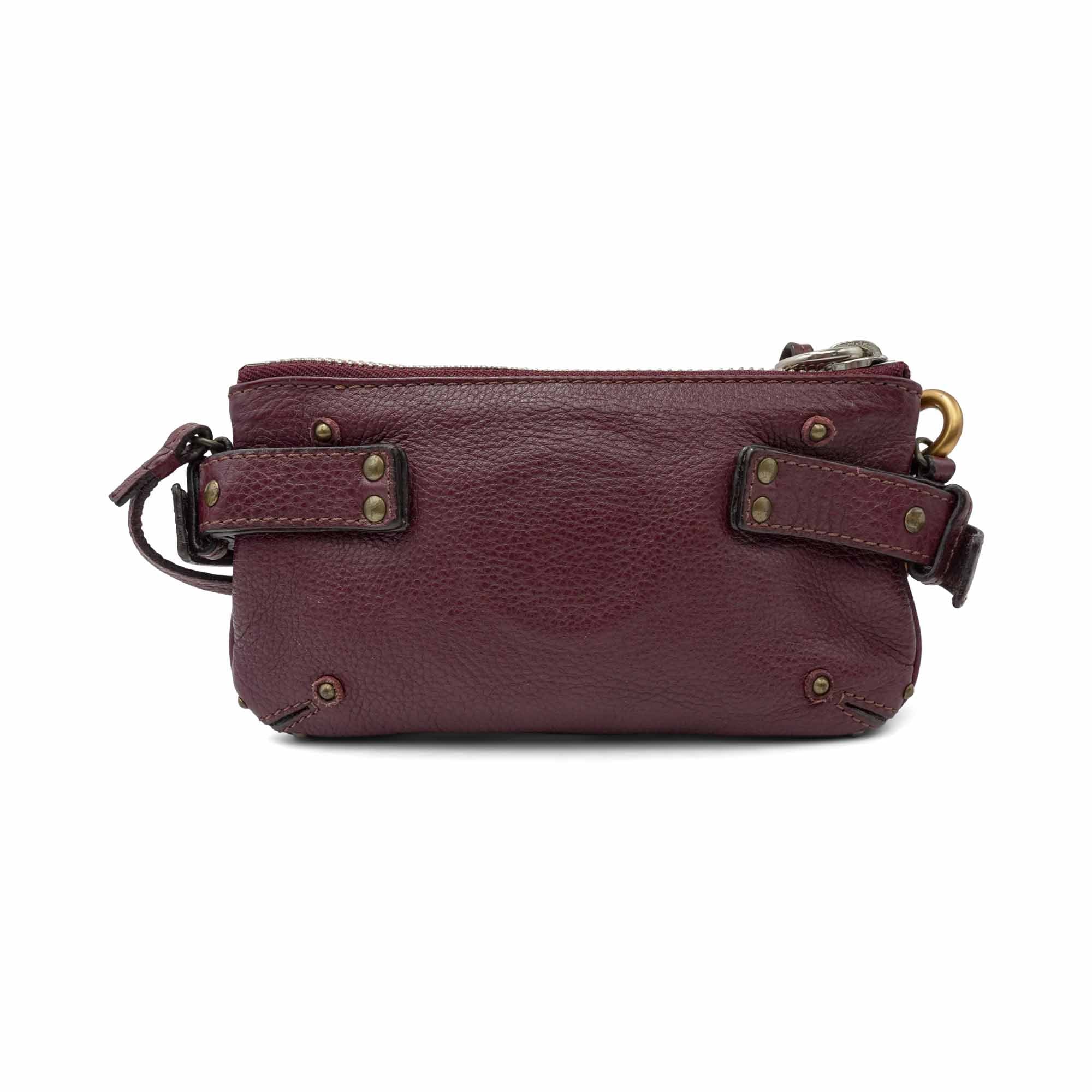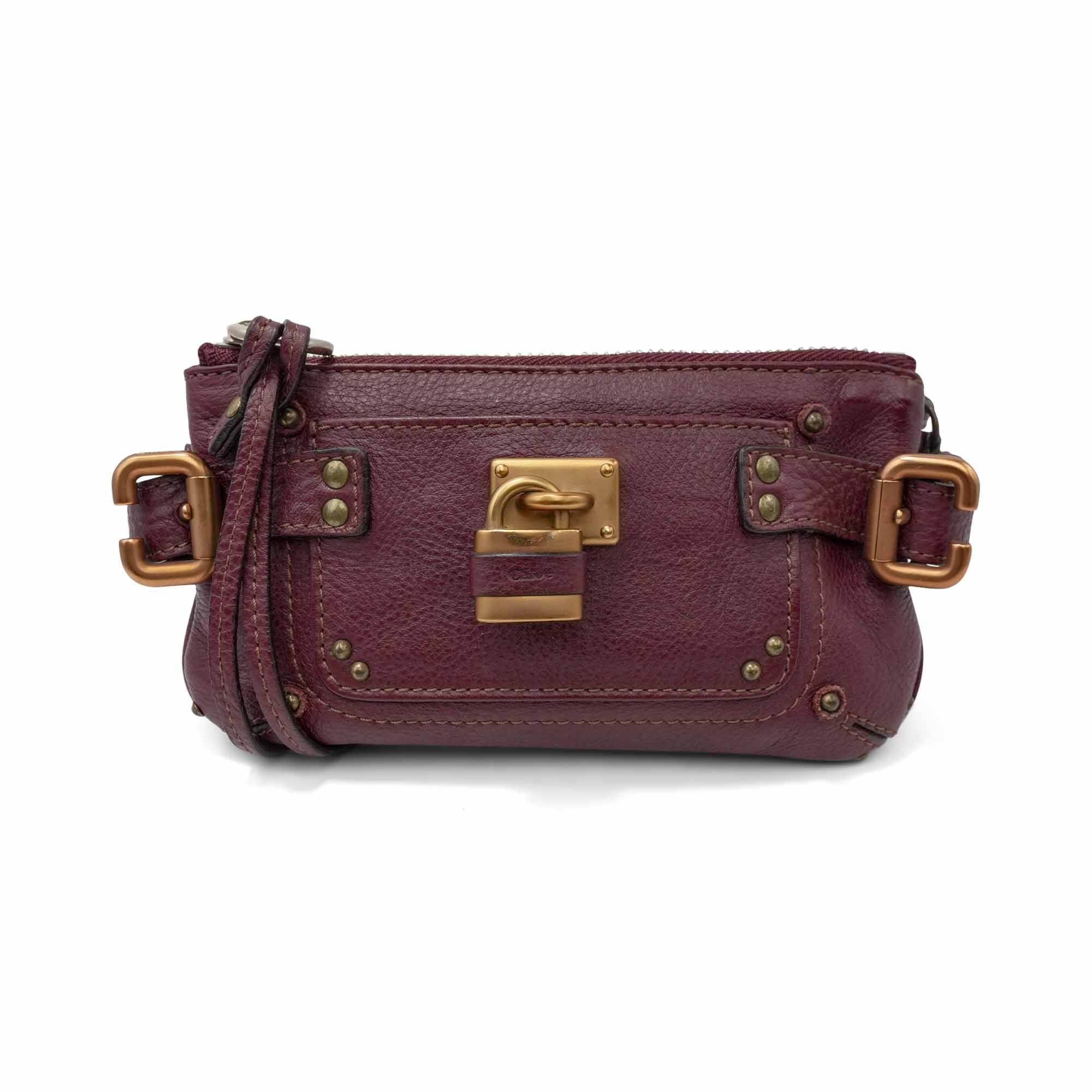 Chloe 'Paddington' wristlet pouch in burgundy grained leather with gold stud details throughout, a signature padlock charm on the front, and side buckle accents. The bag has a top zip opening in silver hardware revealing a brown canvas interior lining. The wristlet strap is able to be buckled across the bag to turn into a short shoulder strap.