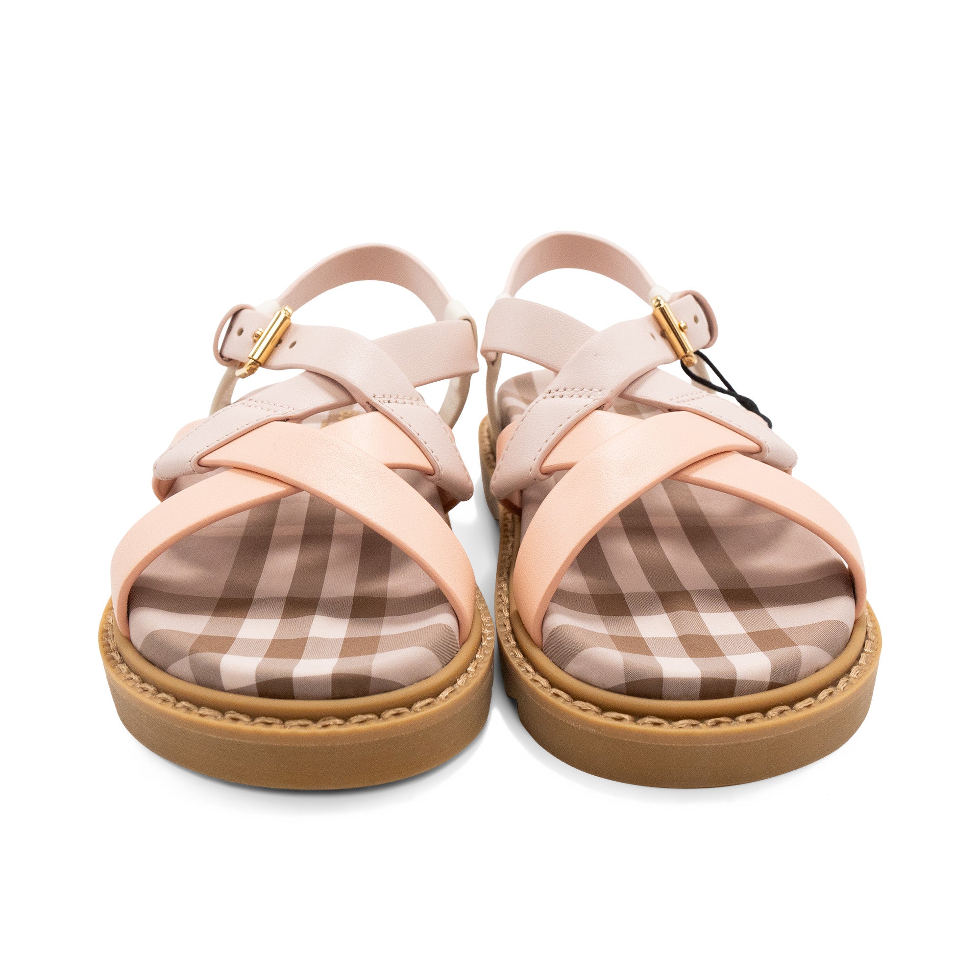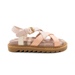 Burberry Kid's 'New Perth' espadrilles in pastel pink and purple leather. Features criss-cross straps over foot with a gold buckle, purple plaid insoles, light brown rubber soles.