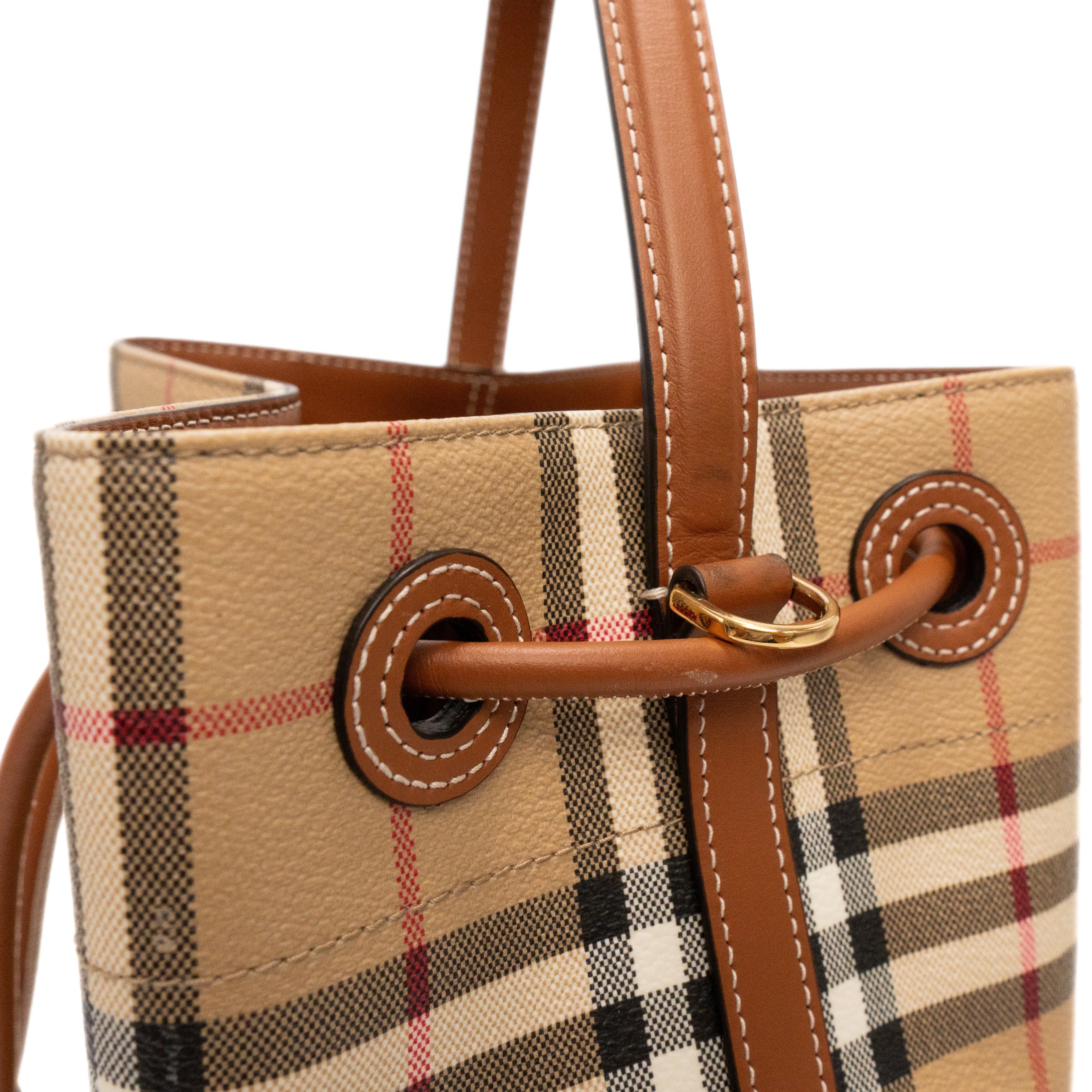 Burberry 'Mini TB Bucket Bag' in beige novacheck coated canvas. Features brown leather top handle, trim, drawstring and detachable shoulder strap, gold tone hardware, and one inner slip pocket.