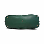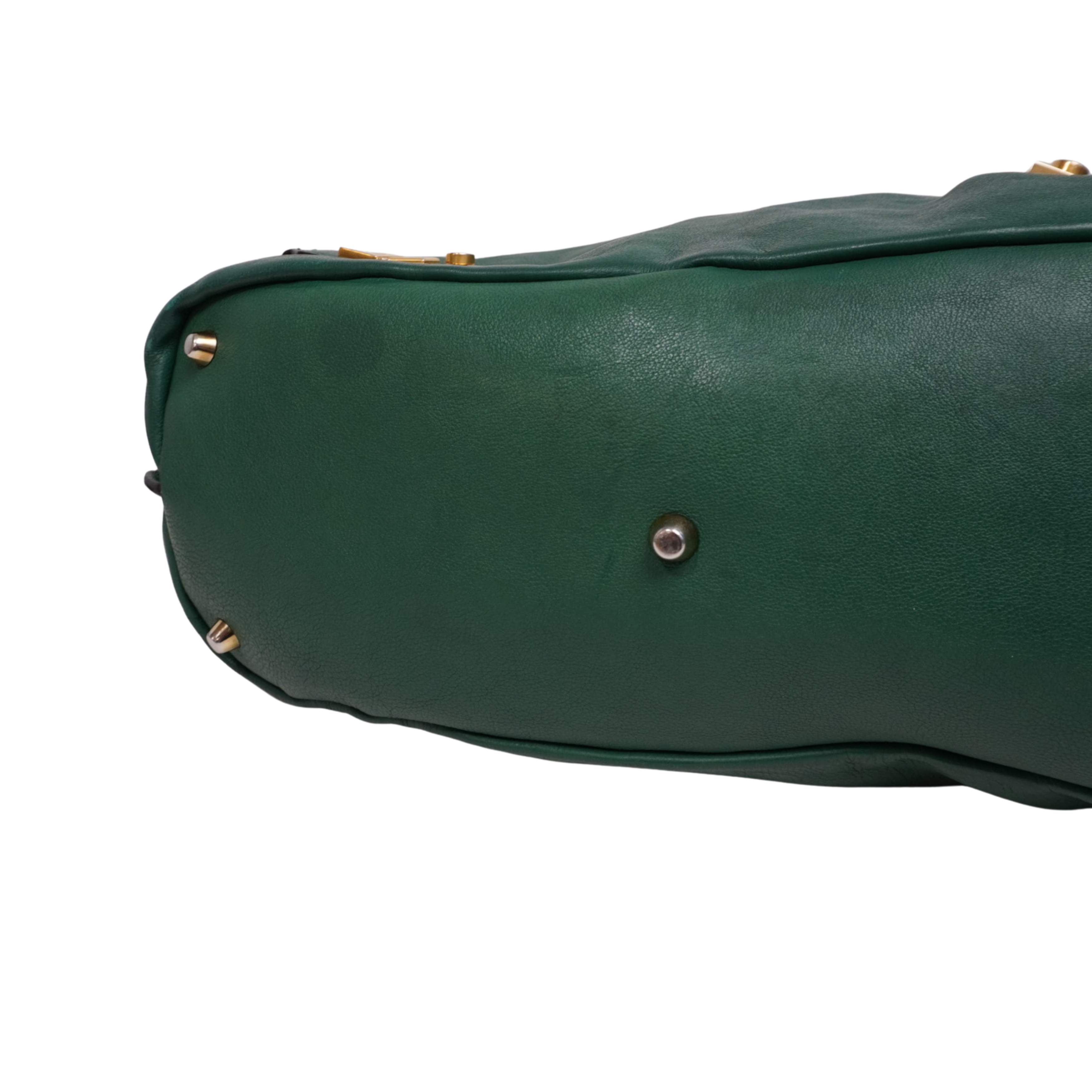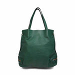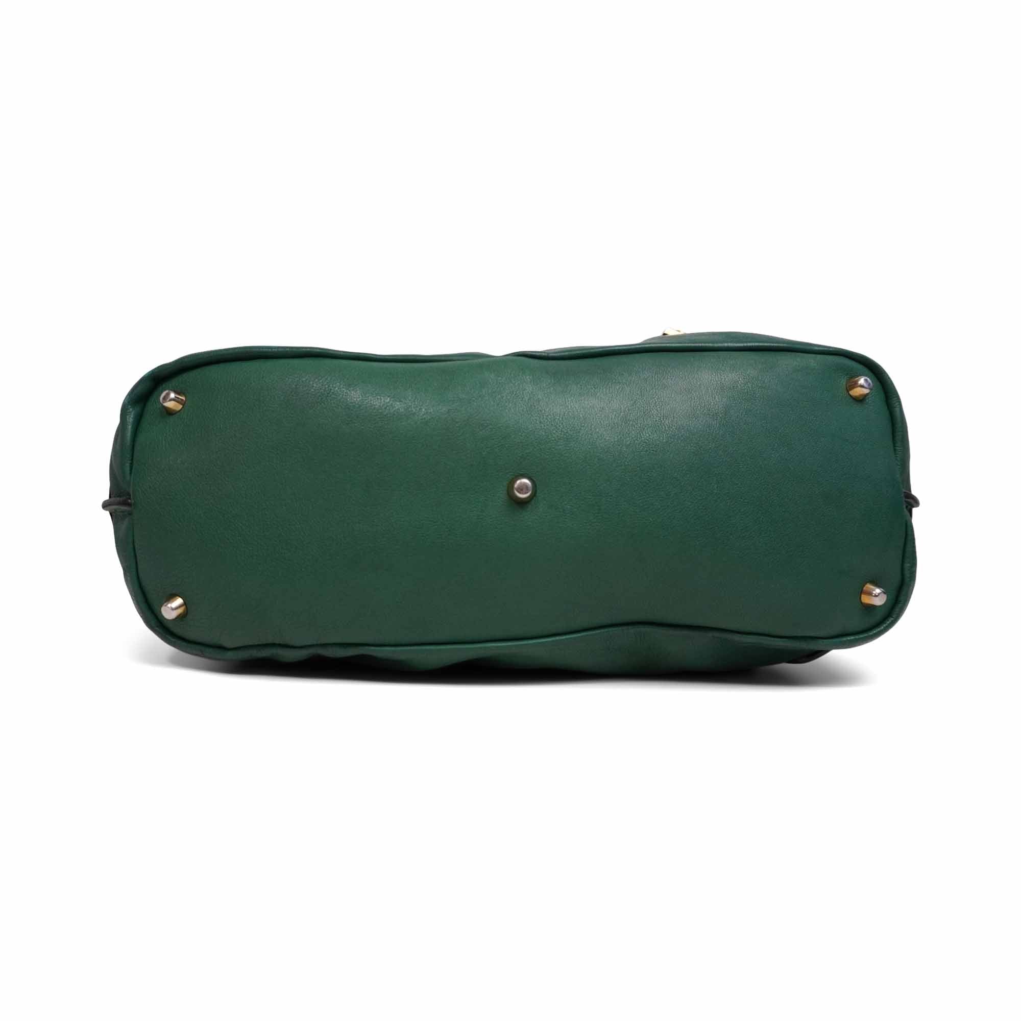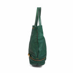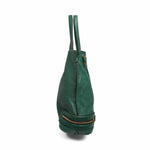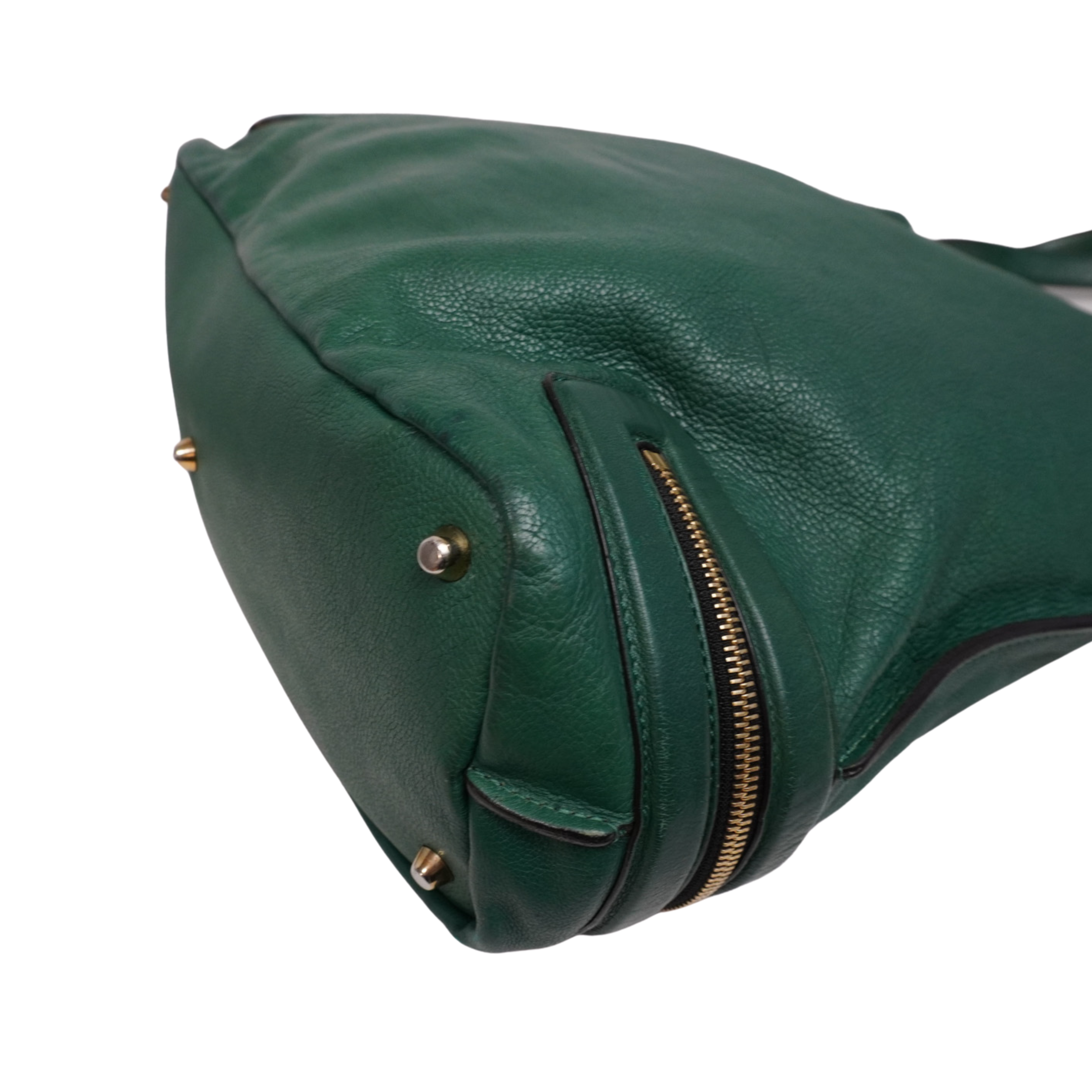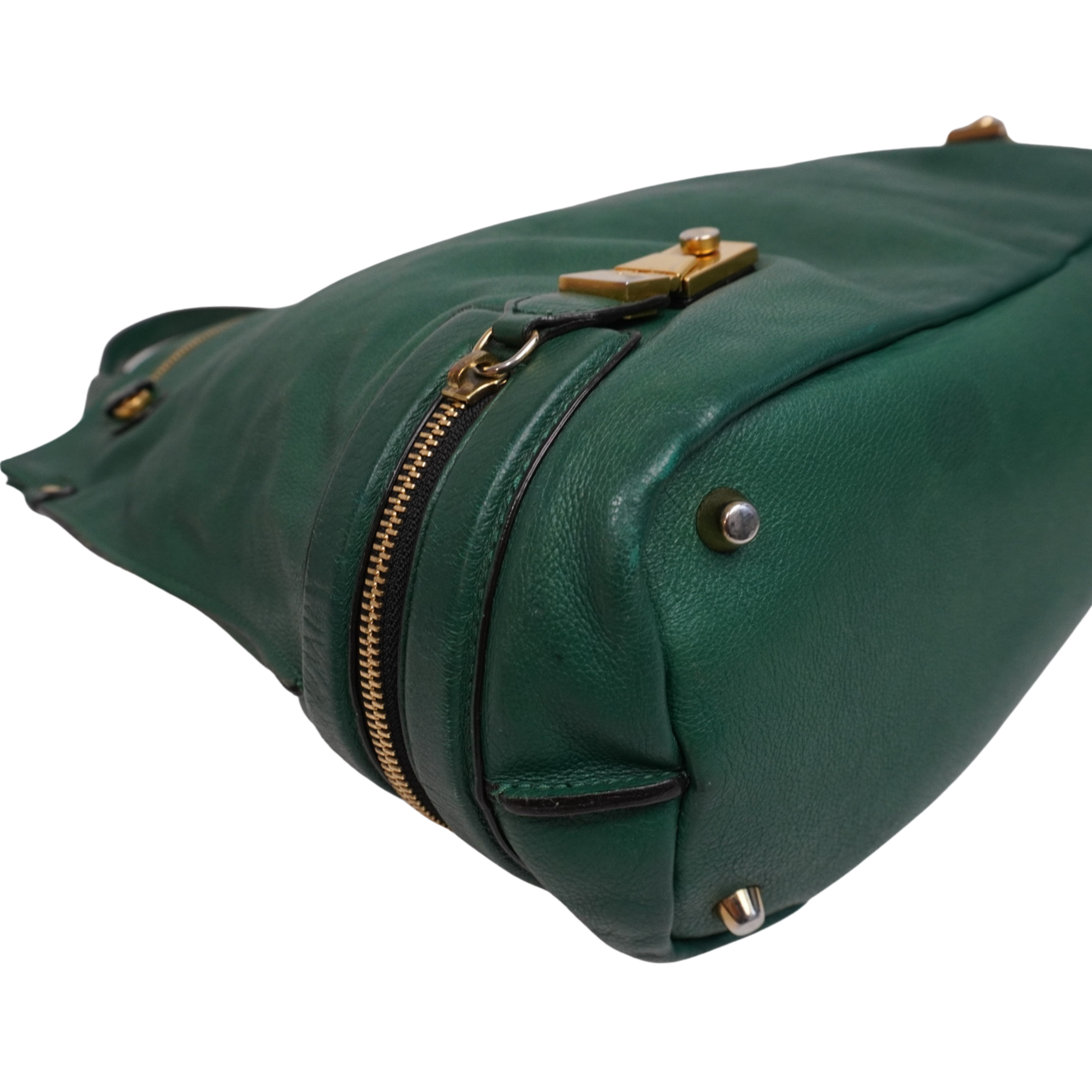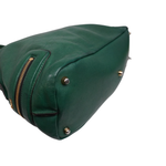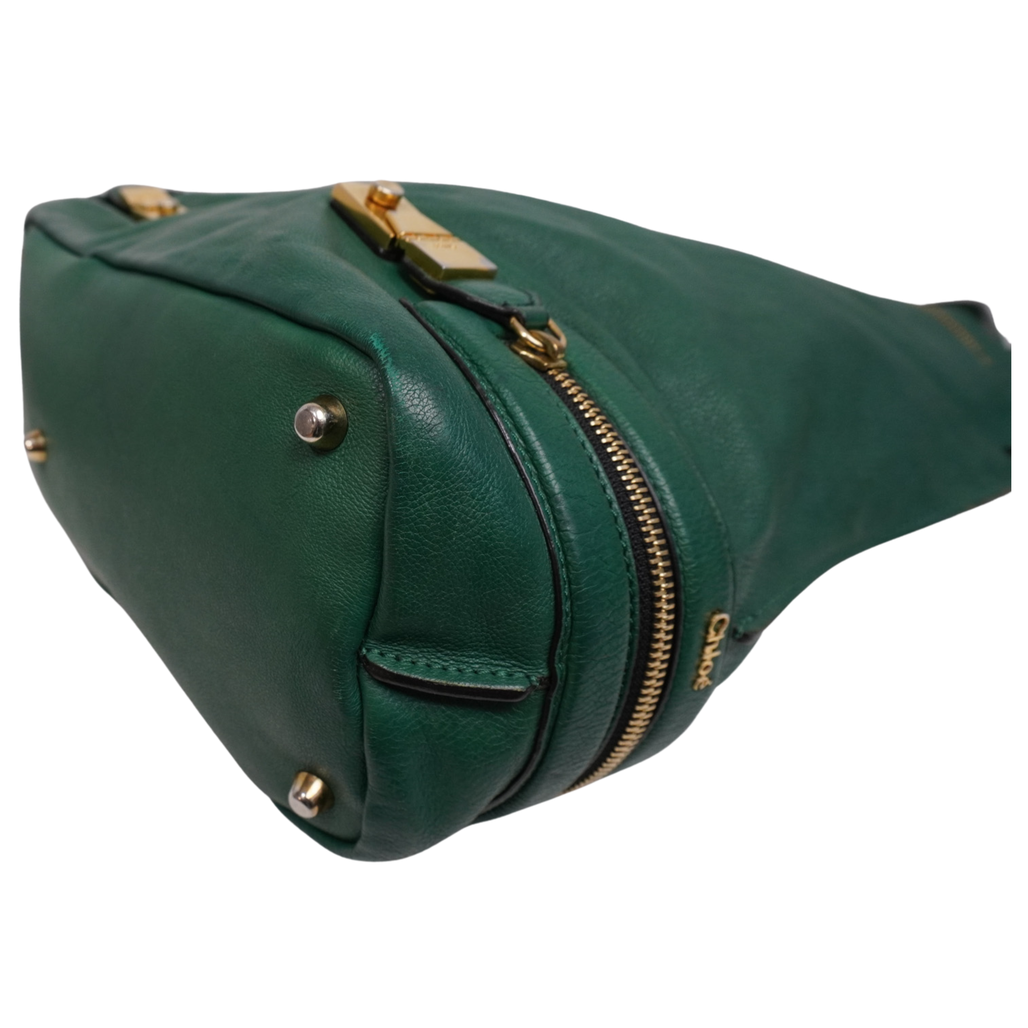 Chloe 'Cary Tote' bucket bag in a dark green leather with gold hardware. Features an outer zip pocket, two small zip compartments on bottom corners, a magnetic snap closure, an inner slip pocket, and protective feet on the bottom.