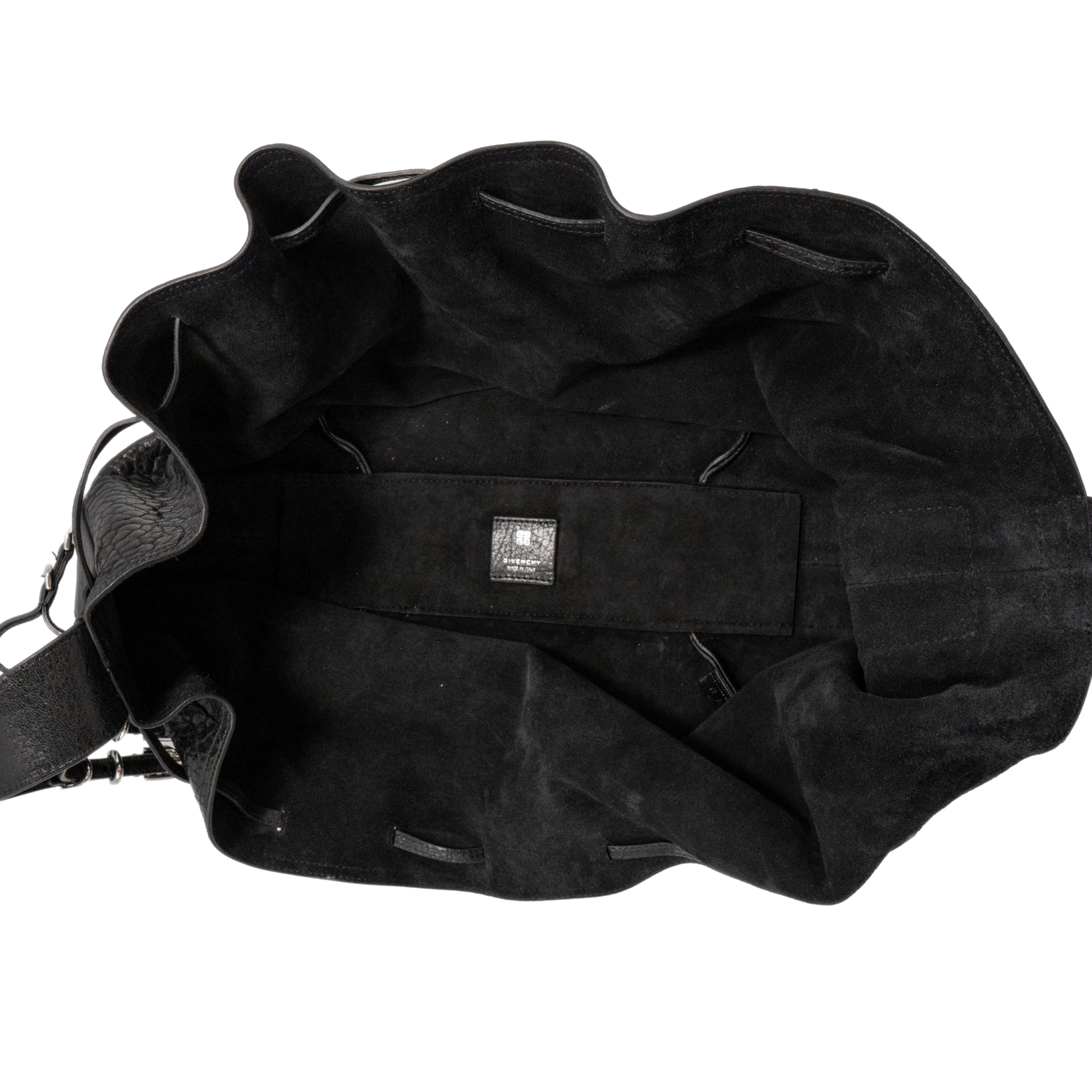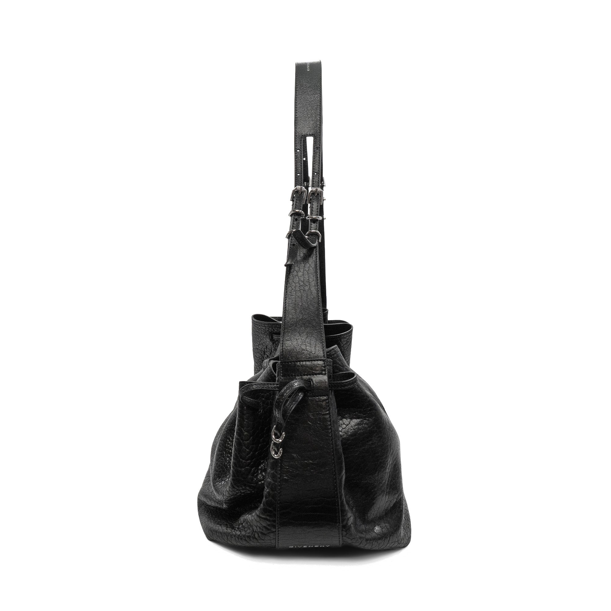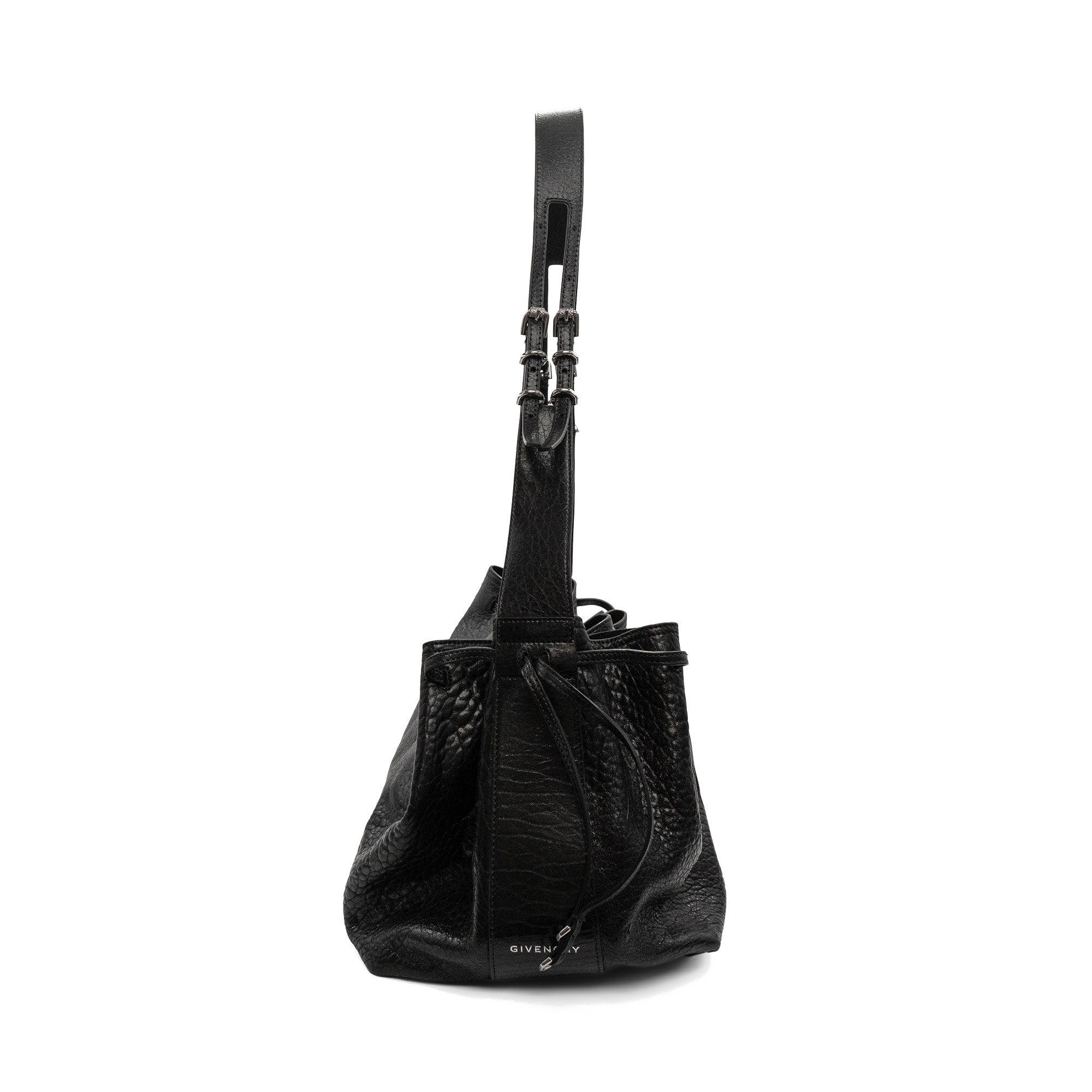 Givenchy 'Pumpkin' handbag in black pebbled leather with a thick adjustable strap with silver buckle hardware, a drawstring closure around the top, and a suede interior lining.