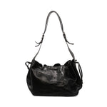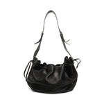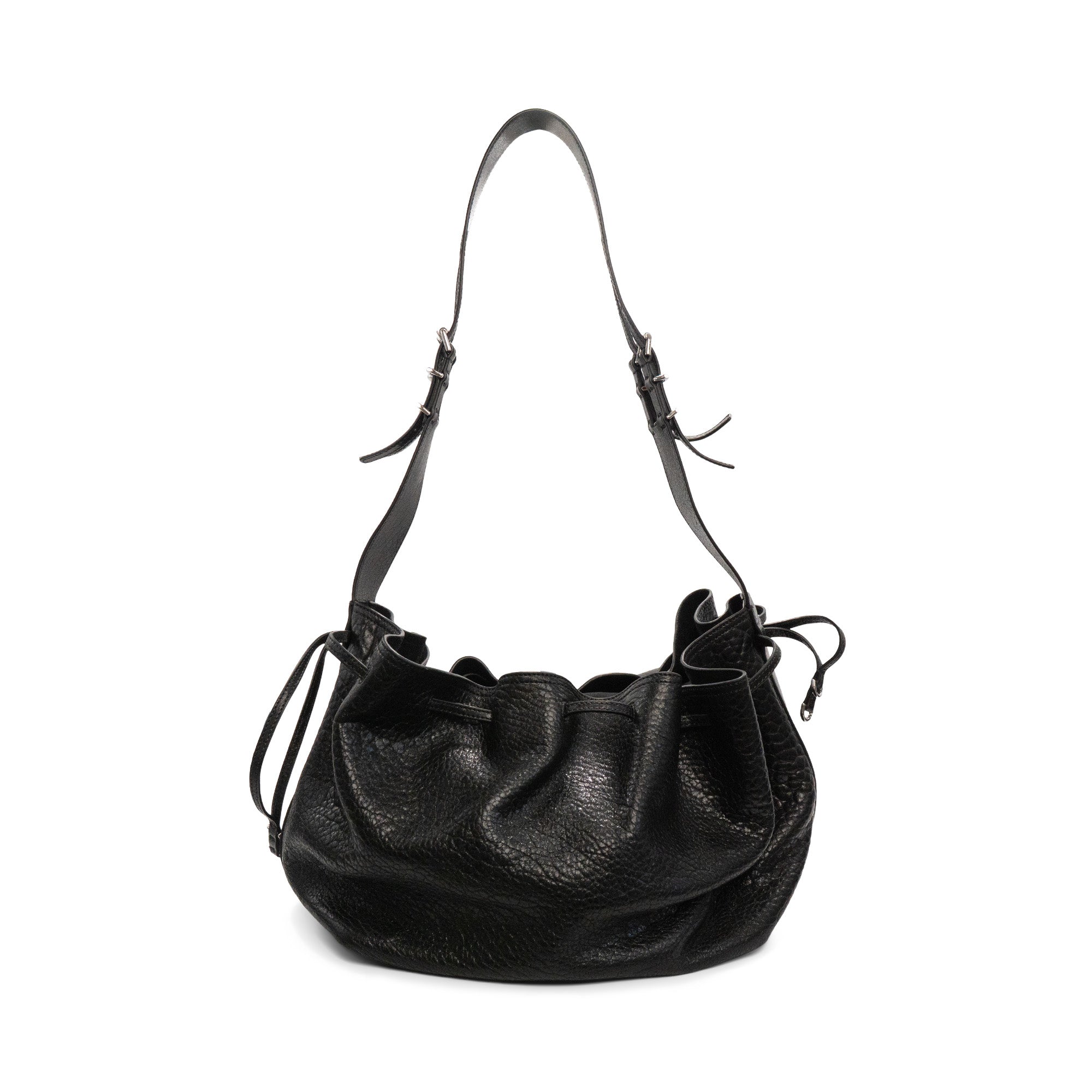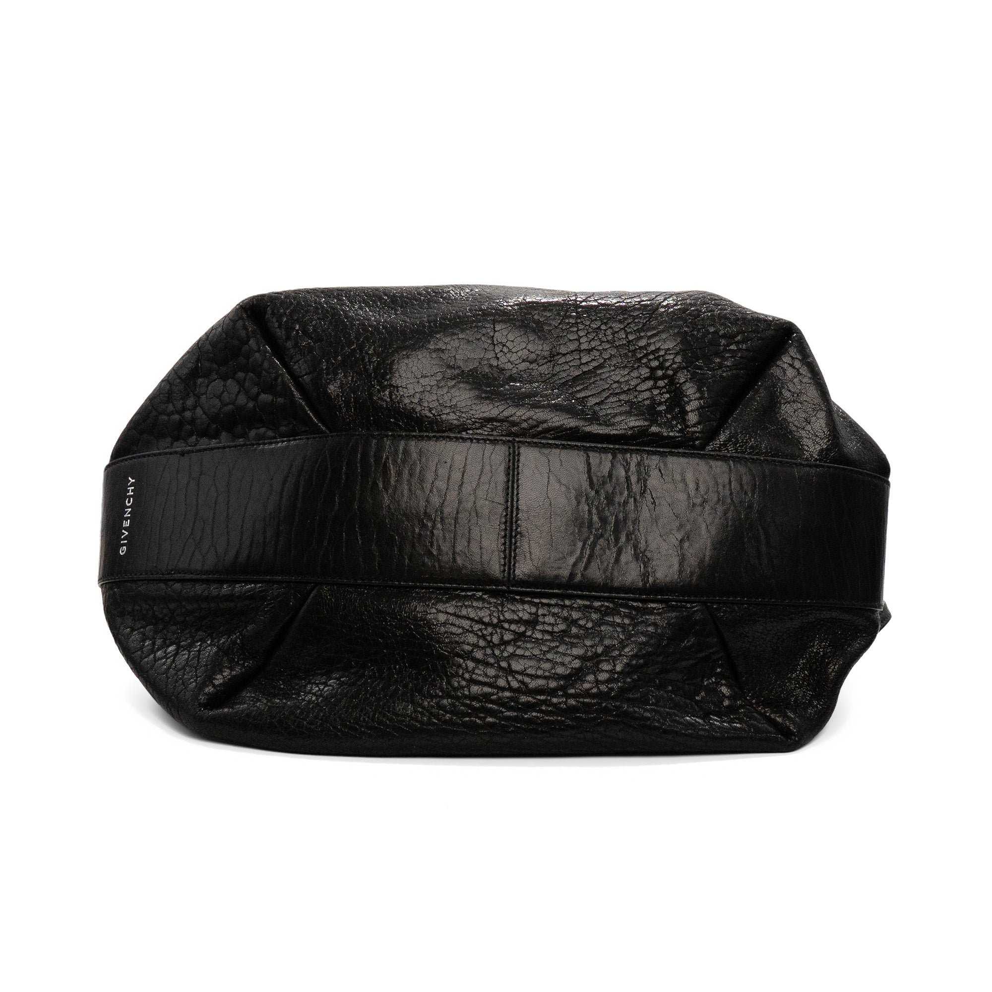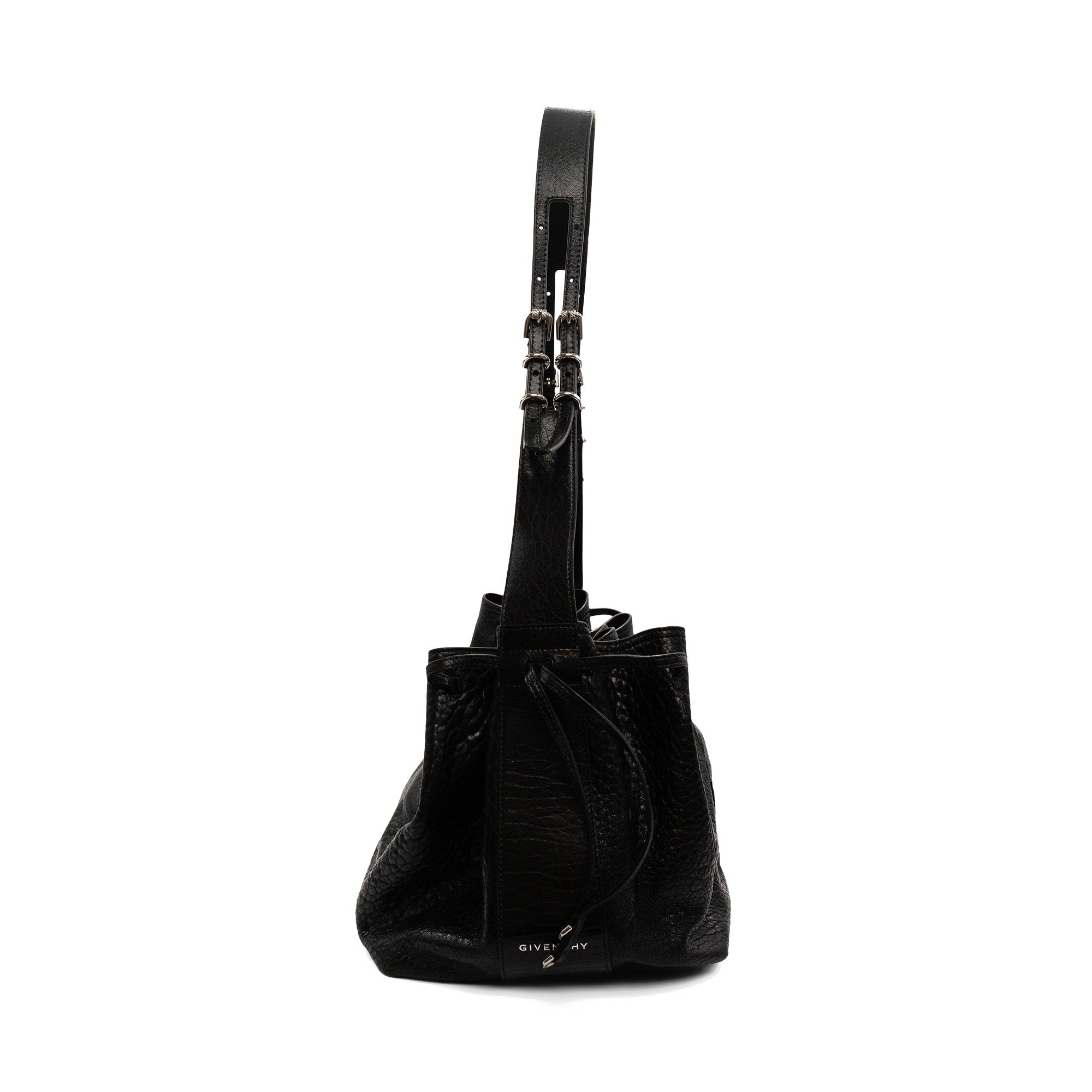 Givenchy 'Pumpkin' handbag in black pebbled leather with a thick adjustable strap with silver buckle hardware, a drawstring closure around the top, and a suede interior lining.
