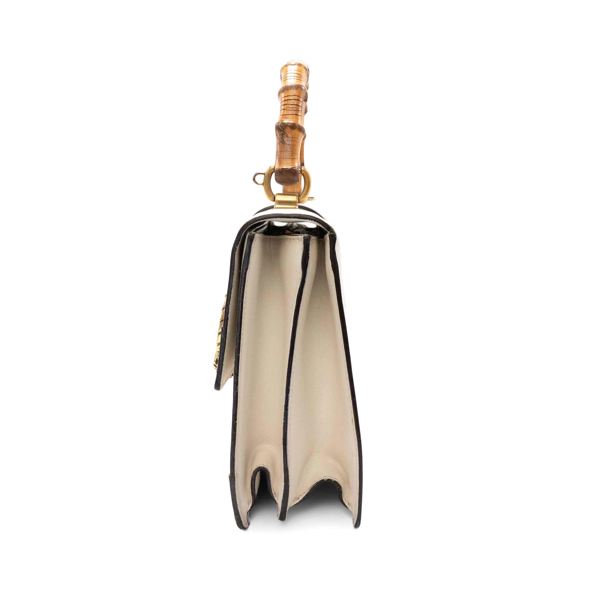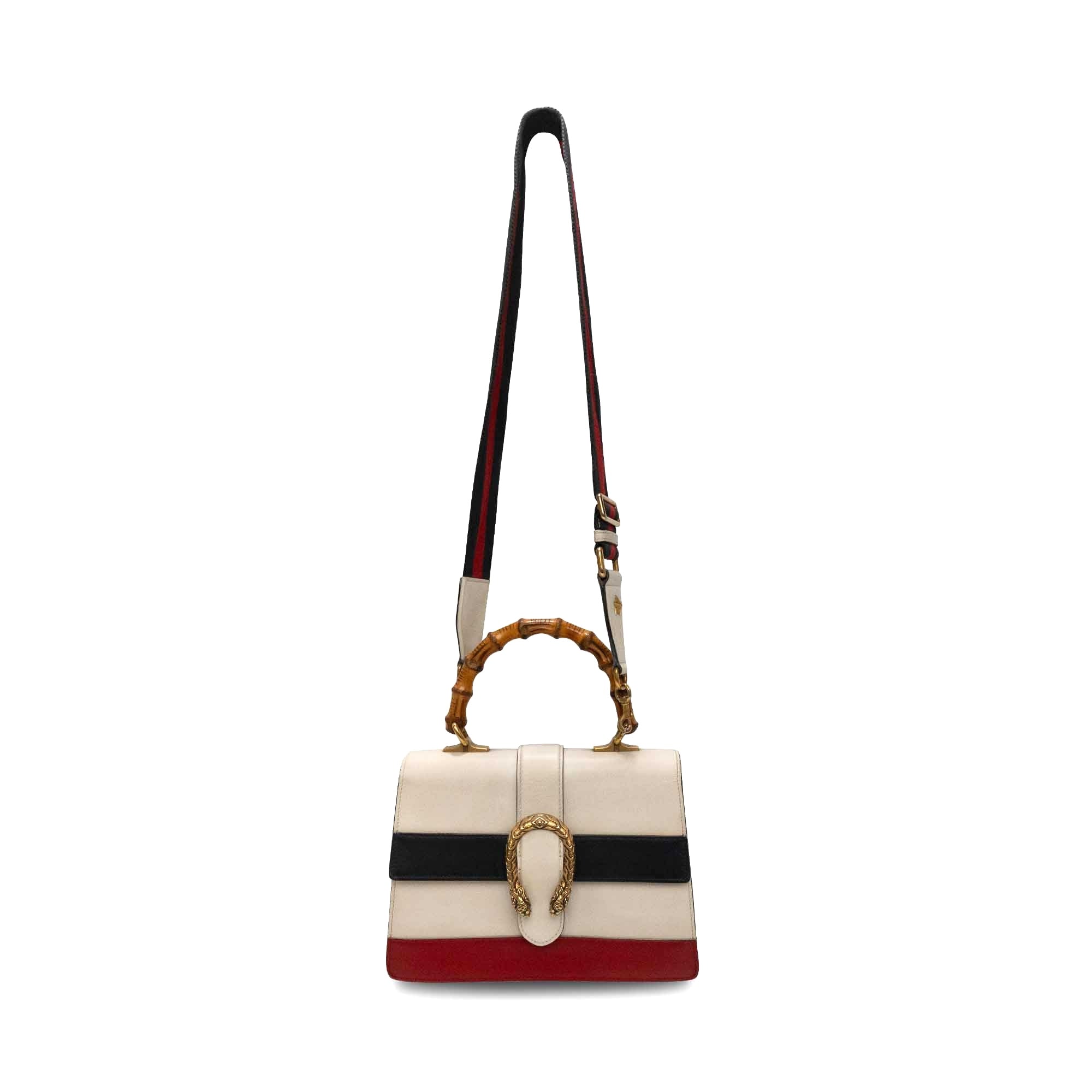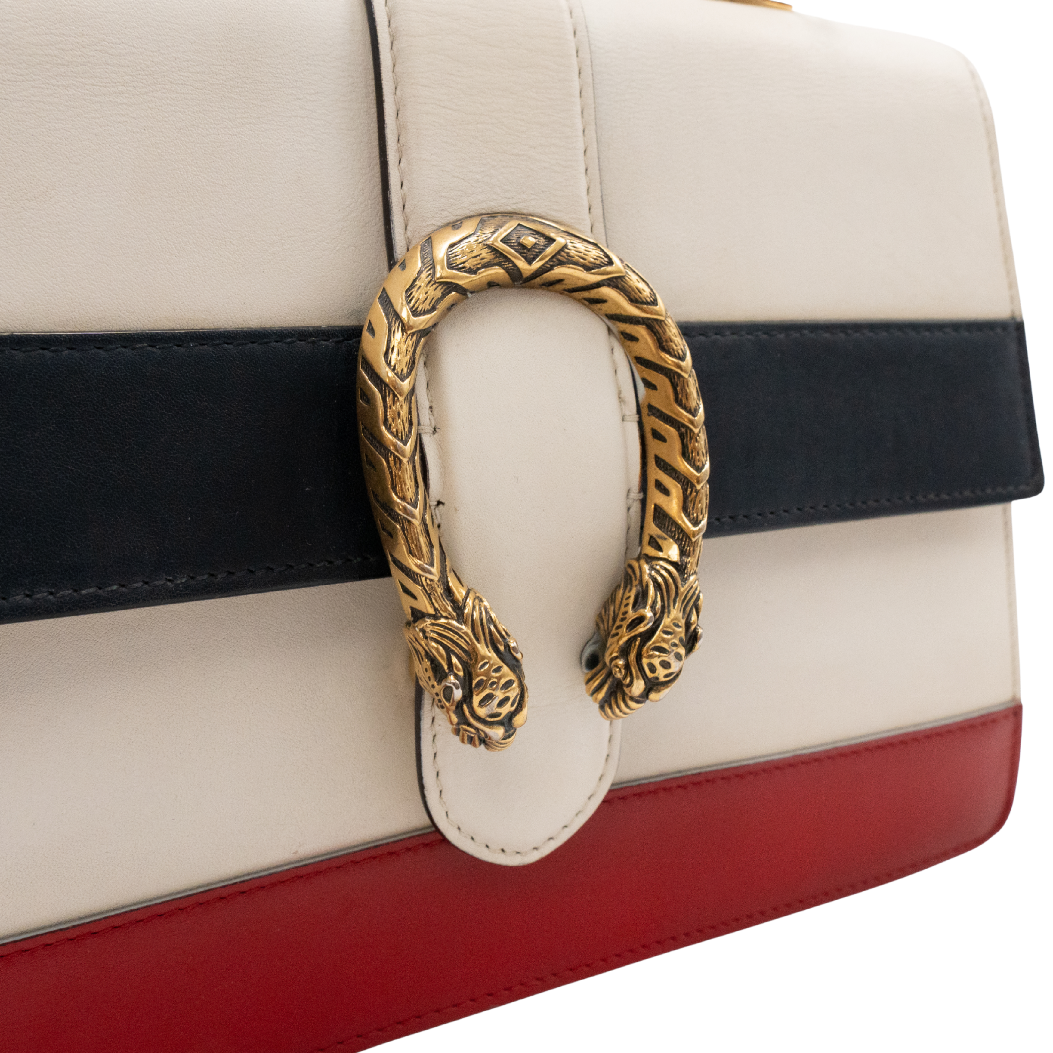 Gucci 'Bamboo Medium Dionysus' top handle bag in white calfskin leather with navy and red panels and a bamboo top handle. Features gold Dionysus buckle on the front flap, gold hardware on handle, a detachable and adjustable canvas crossbody strap with gold star details, and a canvas interior with two slip pockets and one zipper compartment.