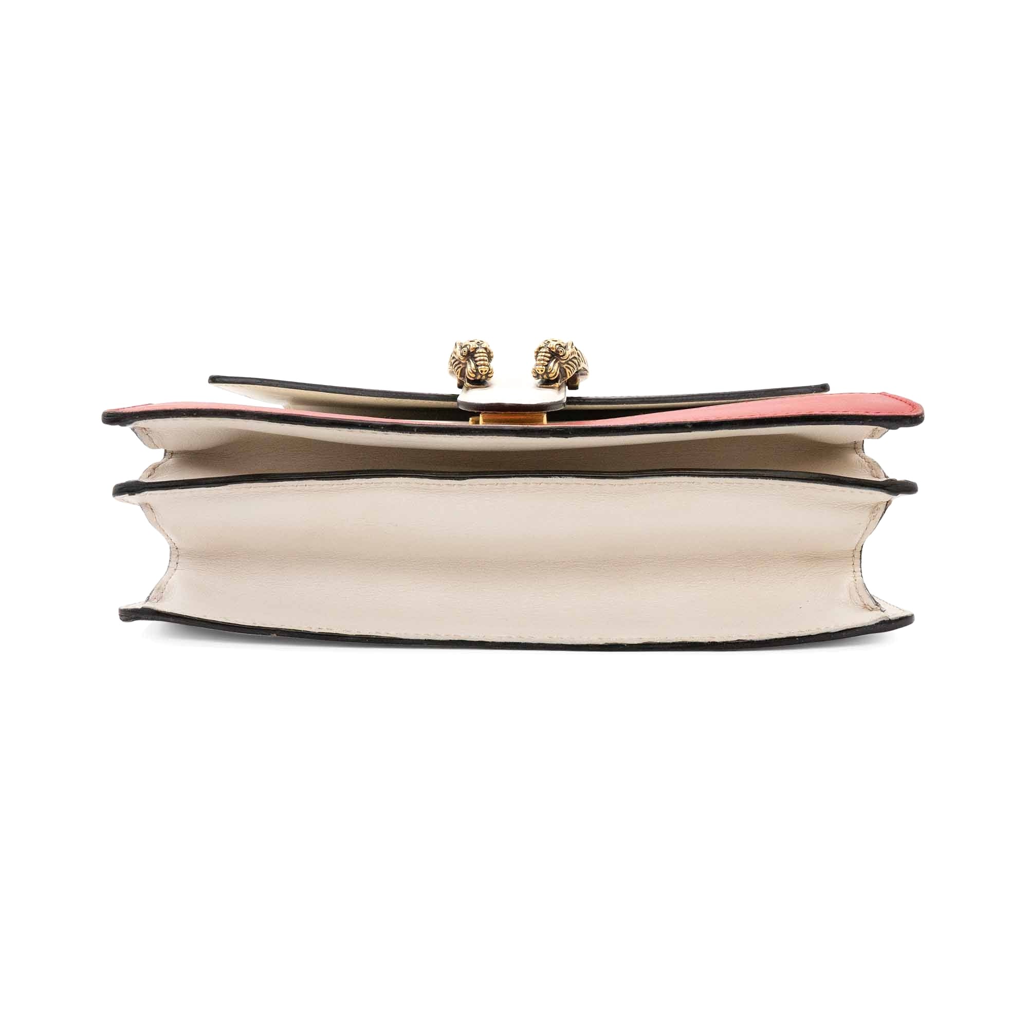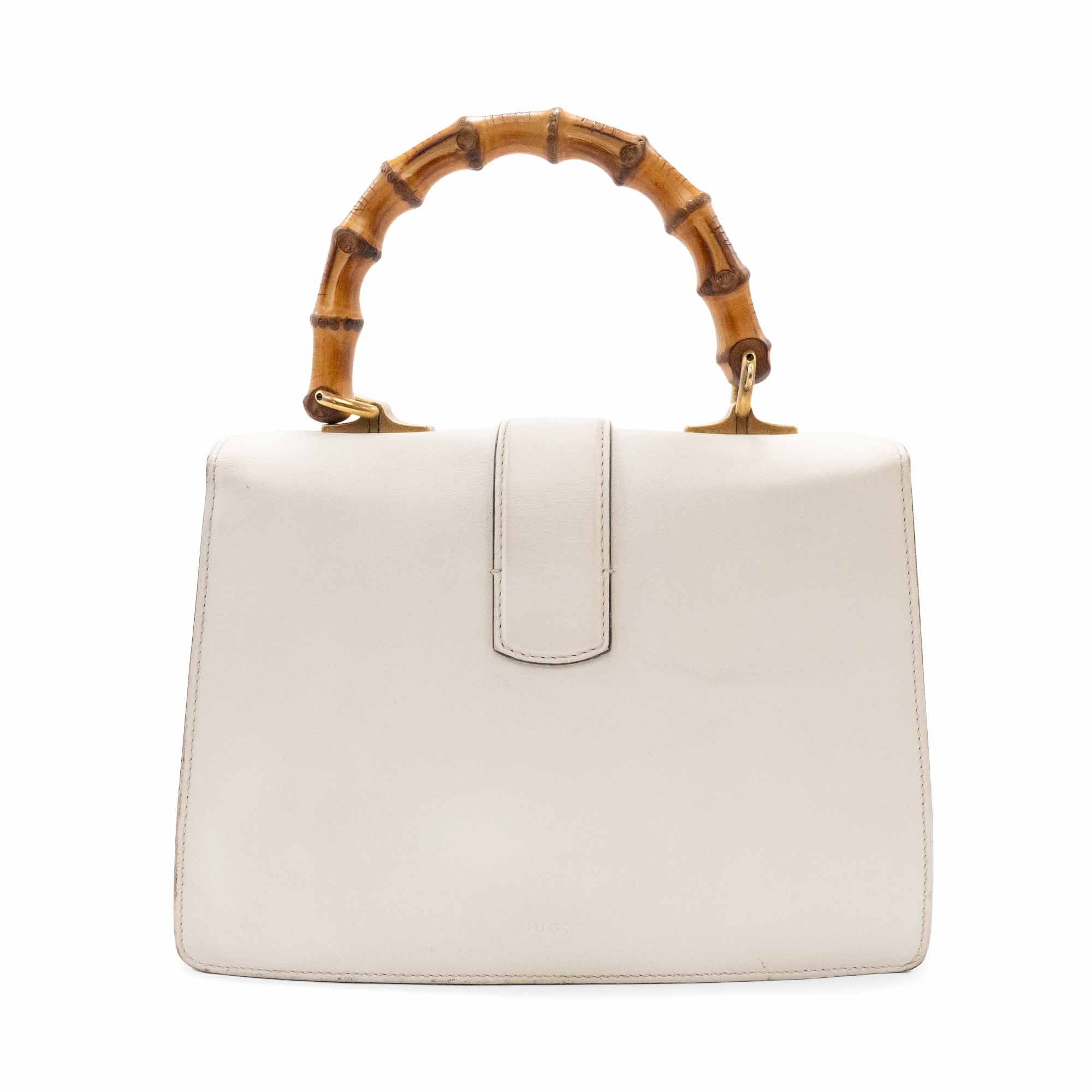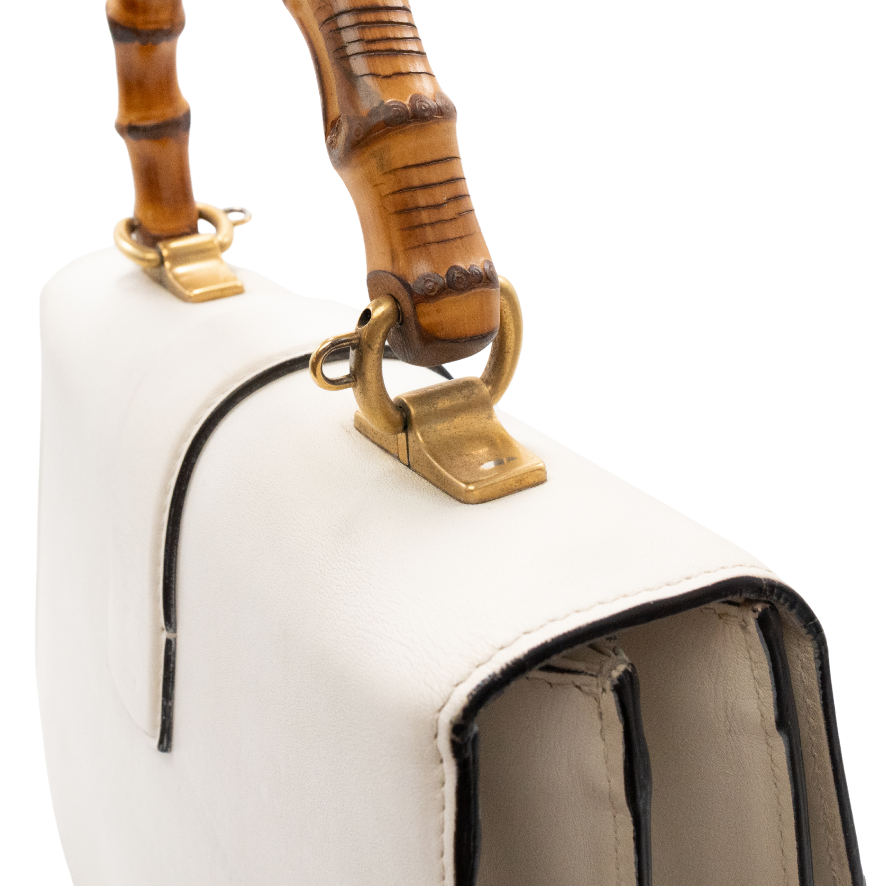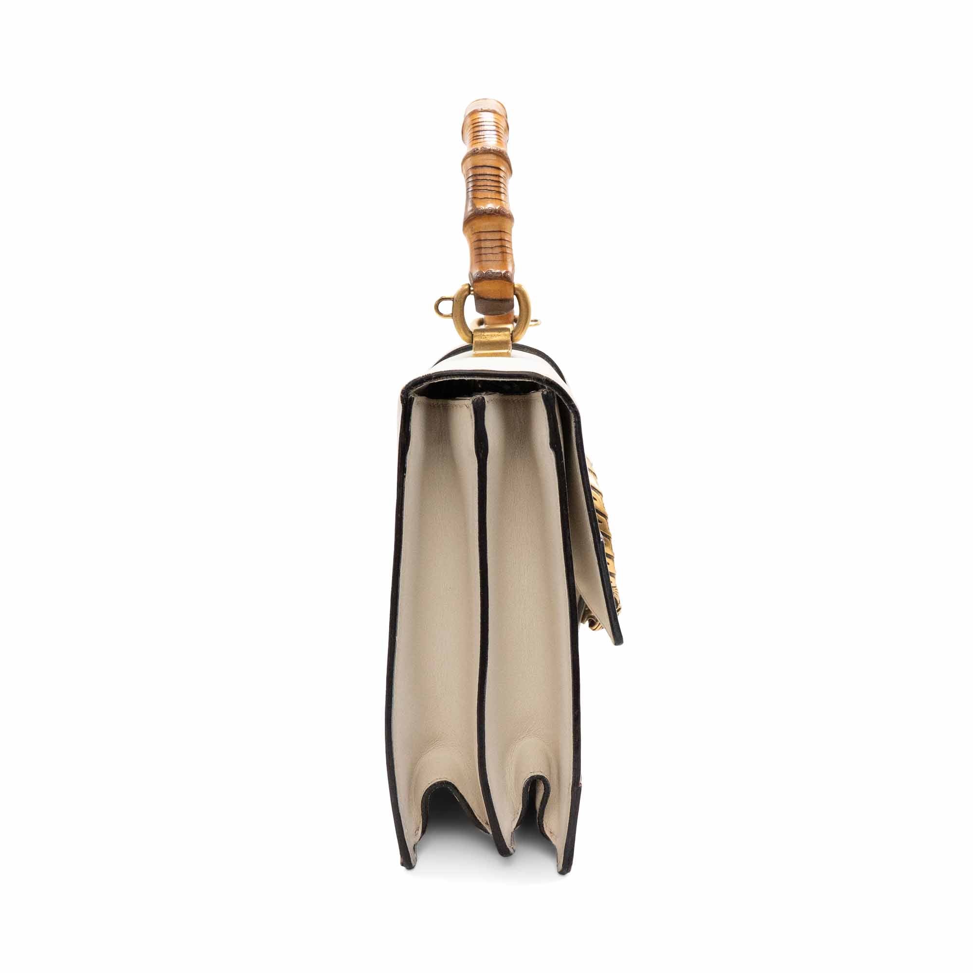 Gucci 'Bamboo Medium Dionysus' top handle bag in white calfskin leather with navy and red panels and a bamboo top handle. Features gold Dionysus buckle on the front flap, gold hardware on handle, a detachable and adjustable canvas crossbody strap with gold star details, and a canvas interior with two slip pockets and one zipper compartment.