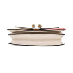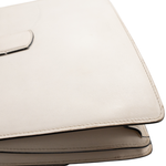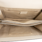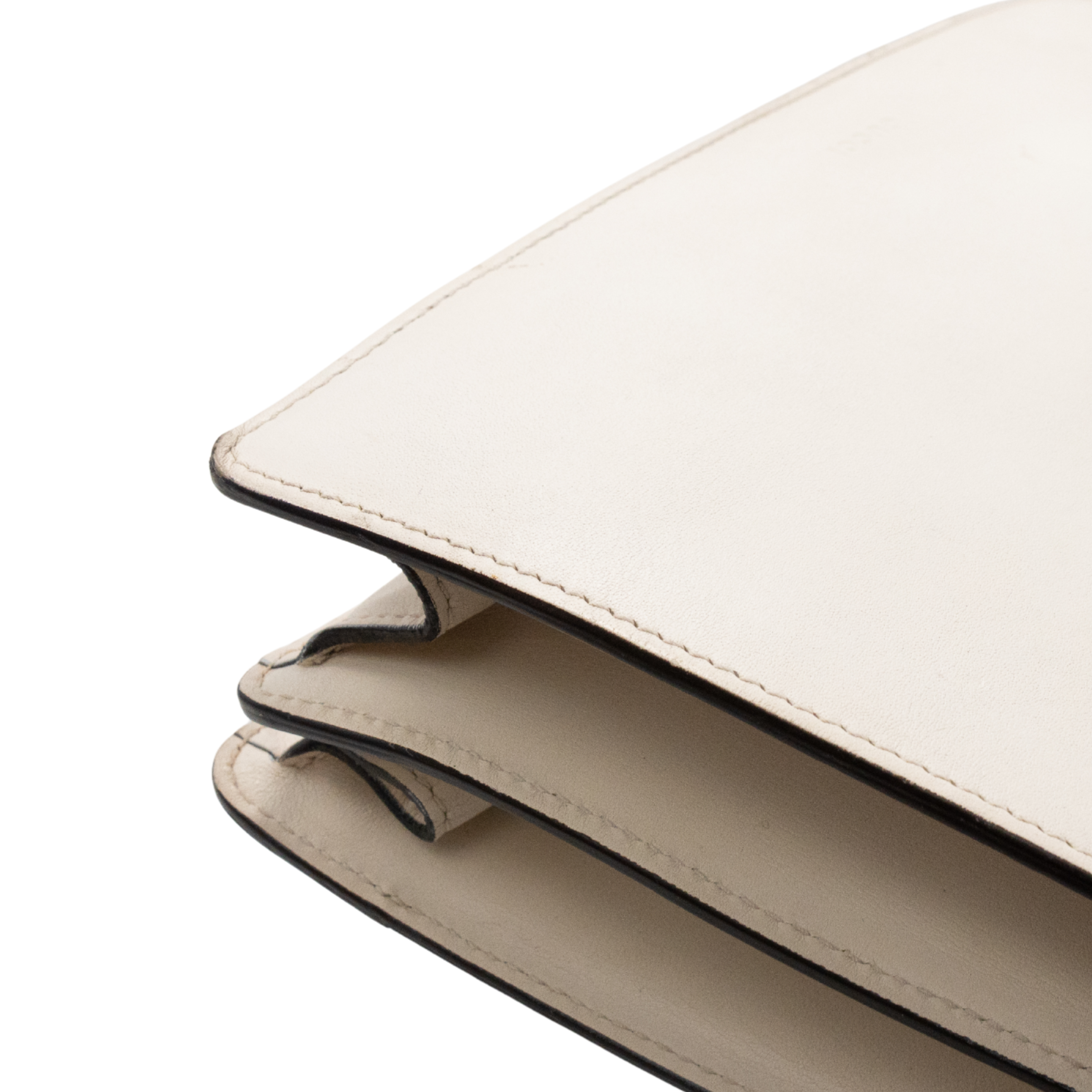 Good. Creasing on top flap, light discolouration and staining on white leather throughout, wear on metal hardware, discolouration in top flap around metal hardware, large scratch on back of bag.