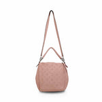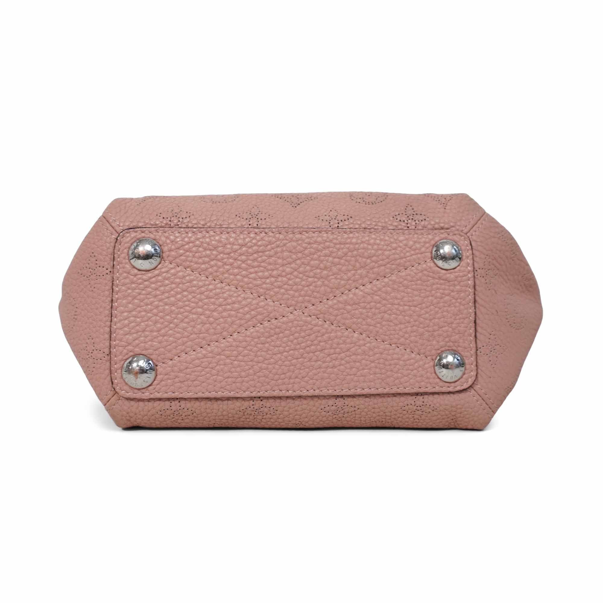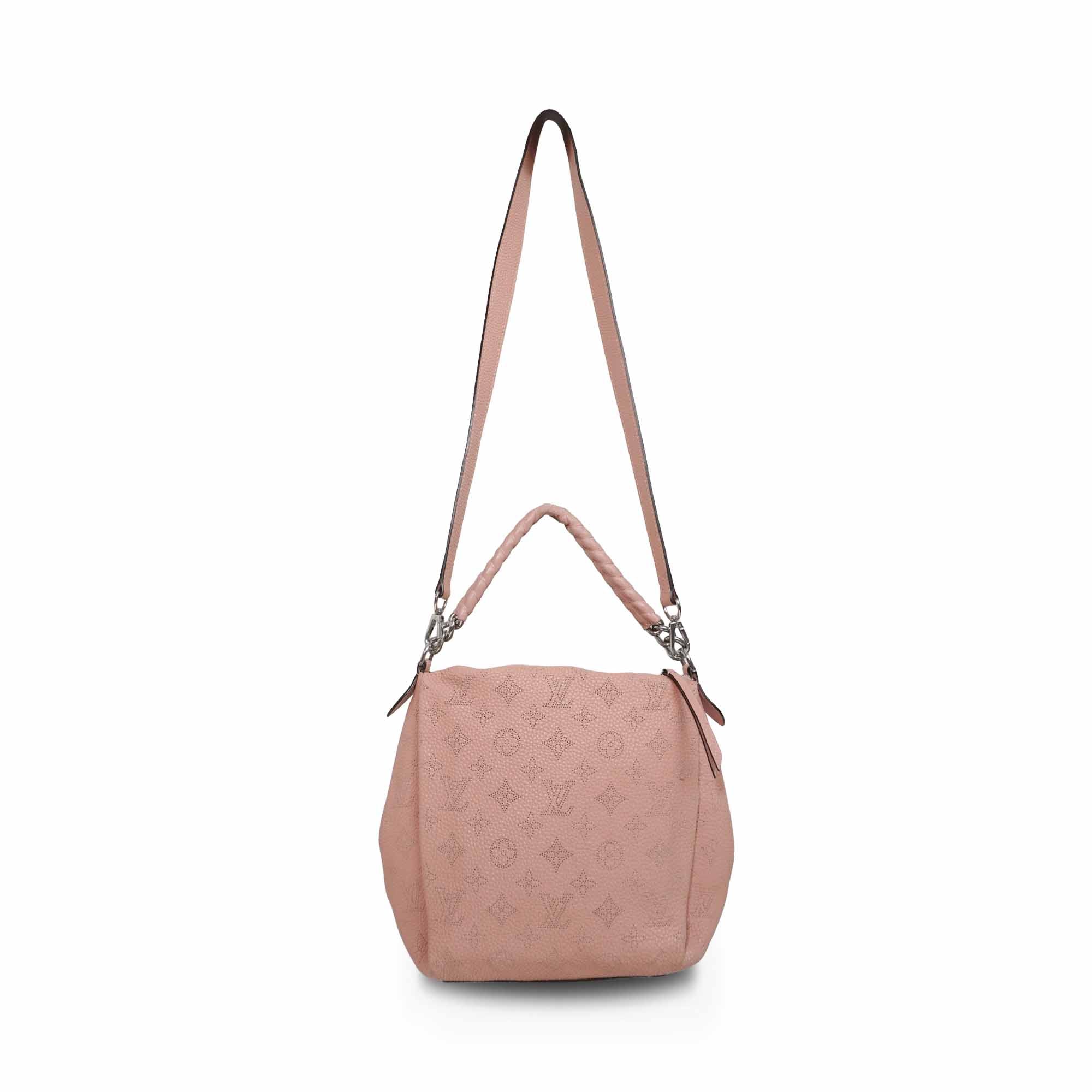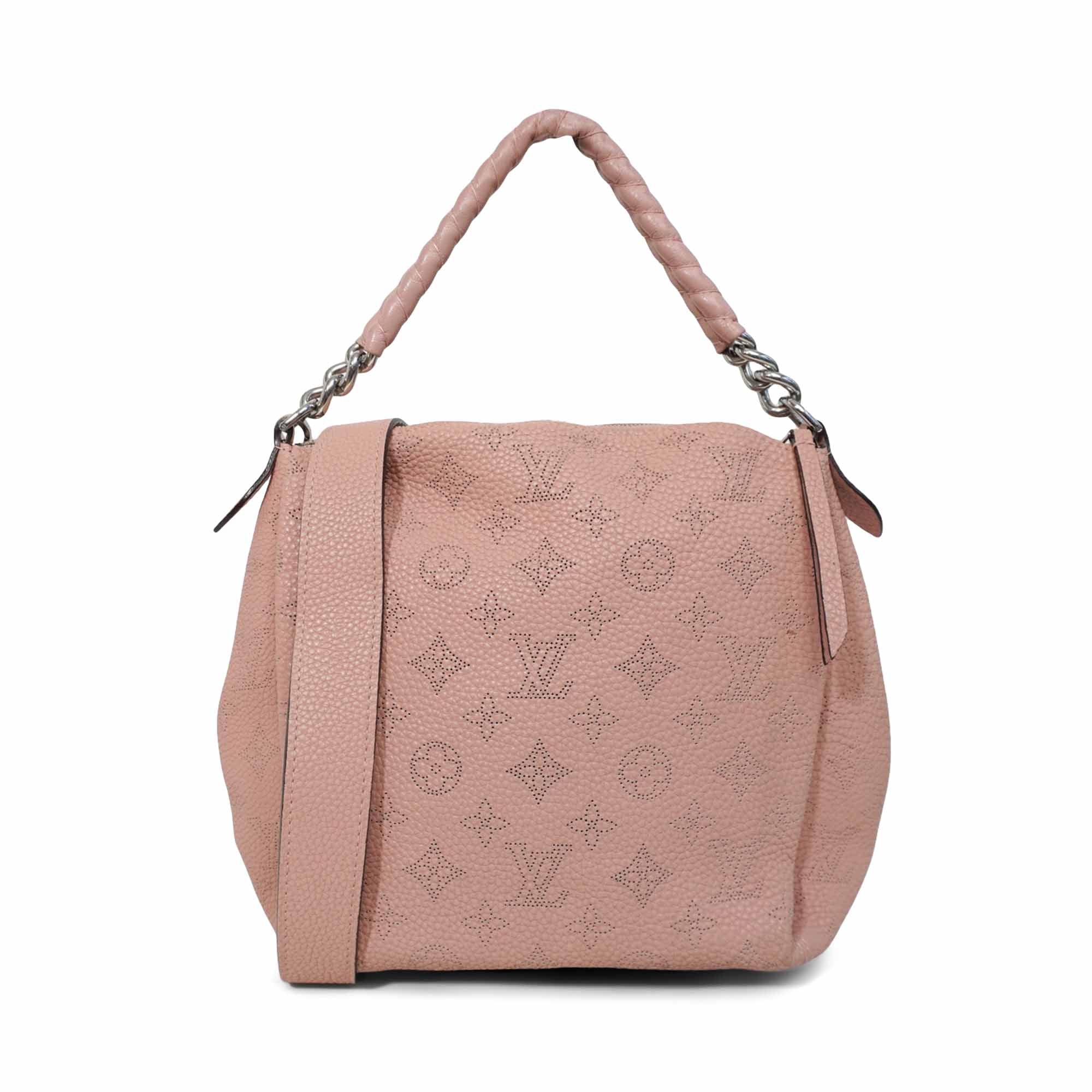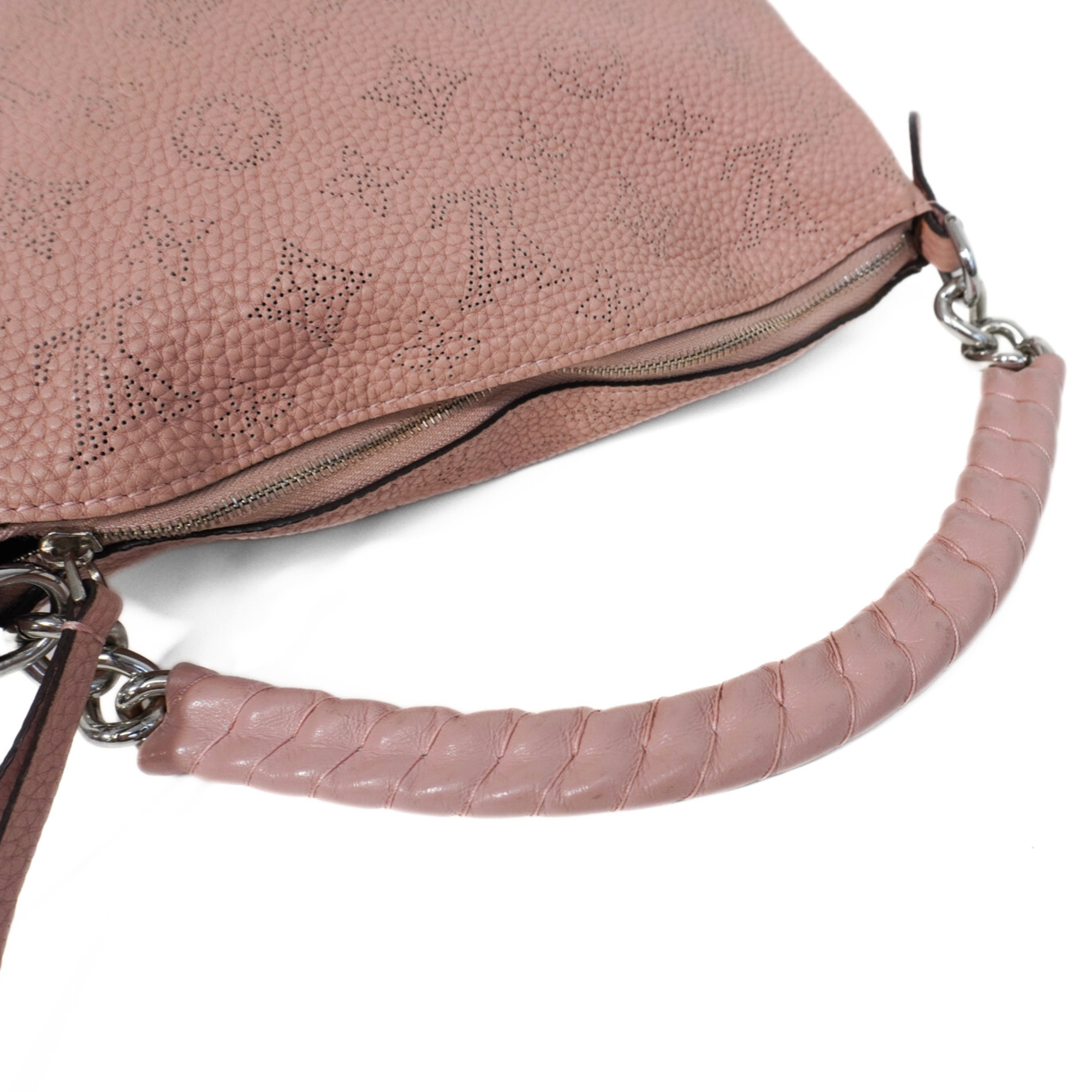 Louis Vuitton 'Mahina Babylone BB' top handle bag in baby pink leather with perforated monogram print all over. Features a detachable cross body strap, a silver chain top handle wrapped in pink leather, a brown suede lining, inner zip and slip pockets, and protective feet at the base.
