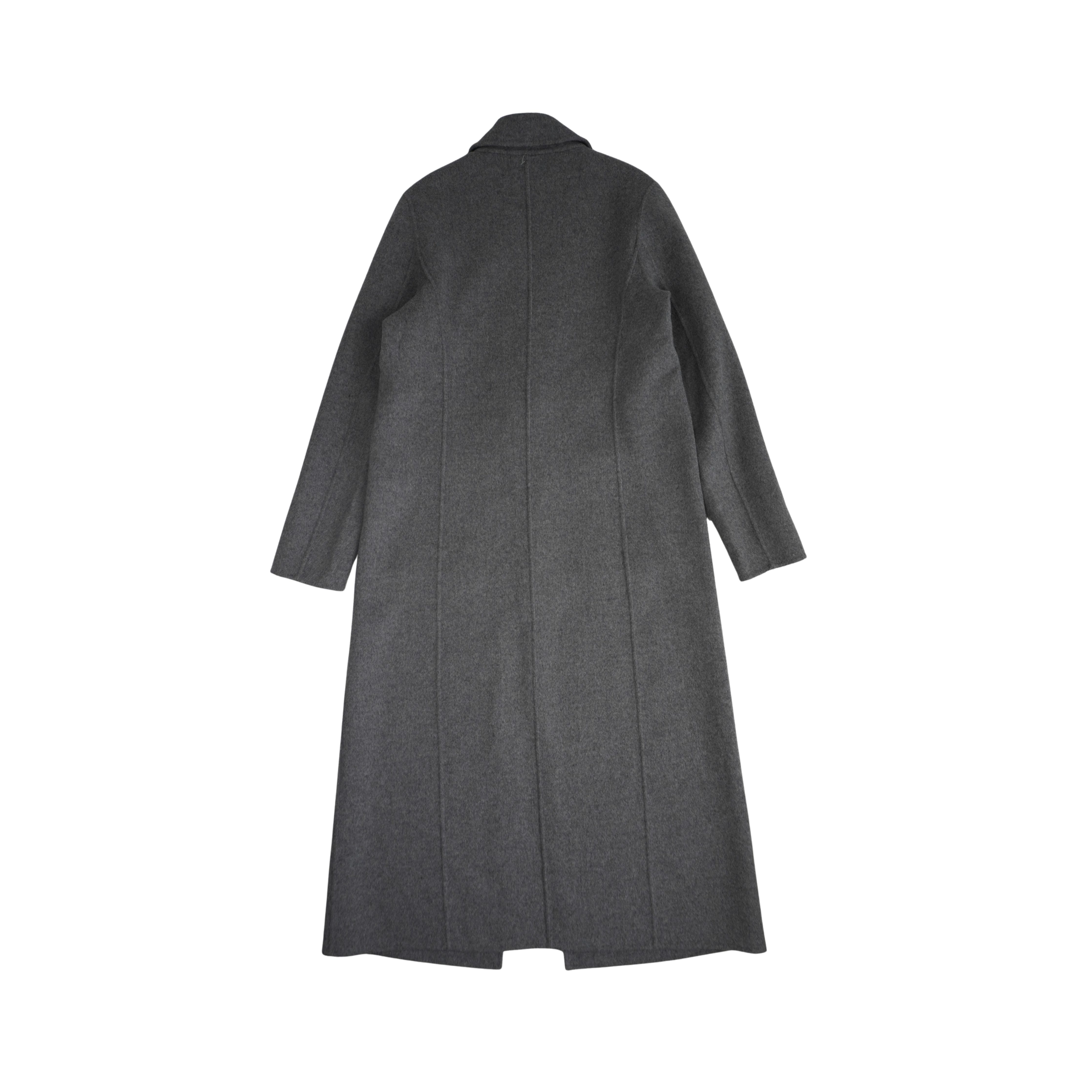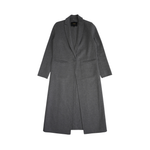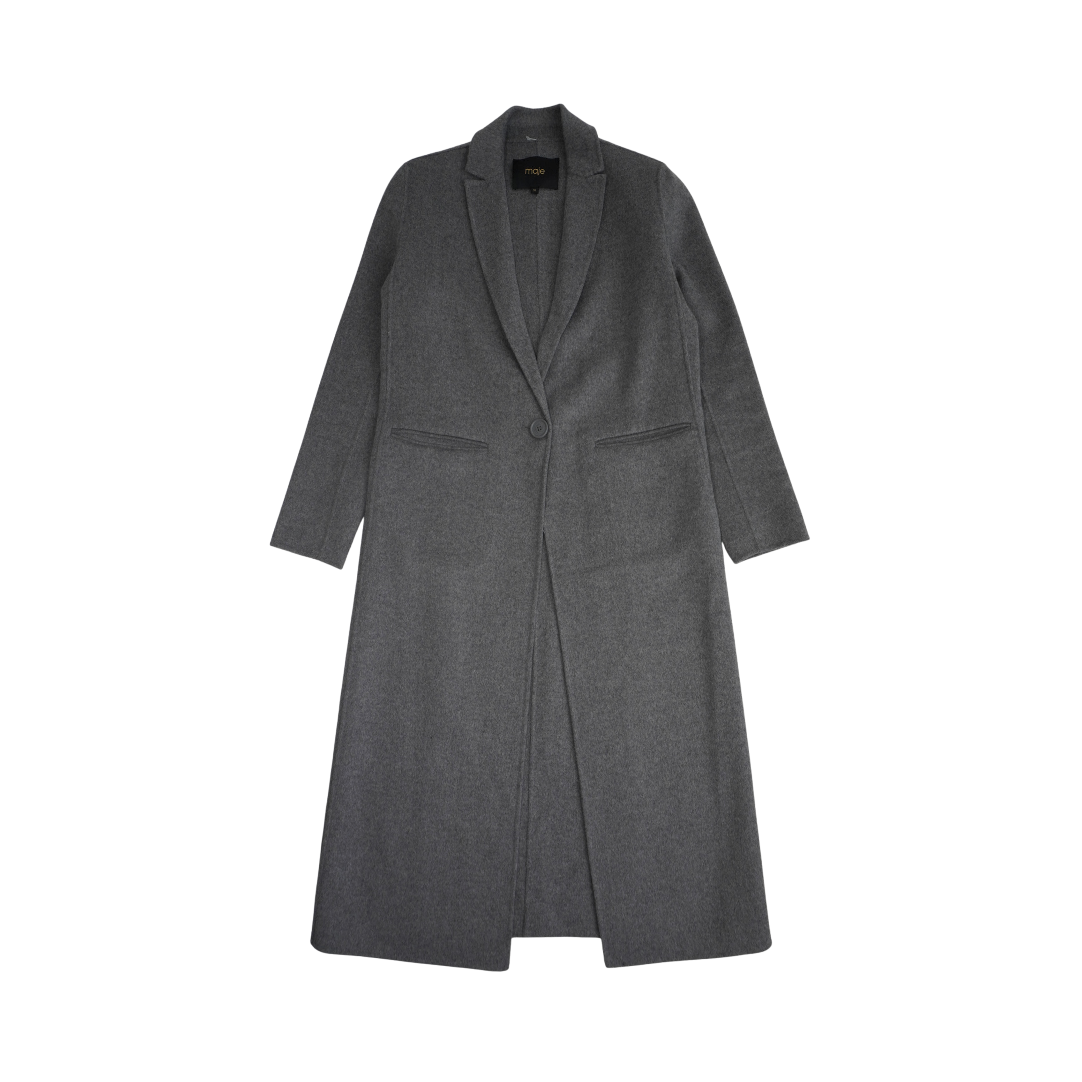Maje lightweight trench coat in grey wool with a single front button closure, slip pockets, and a notch lapel collar.