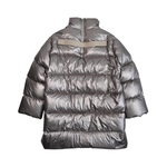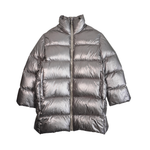 Moncler x Rick Owens 'Cyclopic' oversized puffer jacket in metallic silver nylon with a front zip opening in silver hardware, side slip pockets, a zip vent at the back neckline, and a beige canvas strap detail.