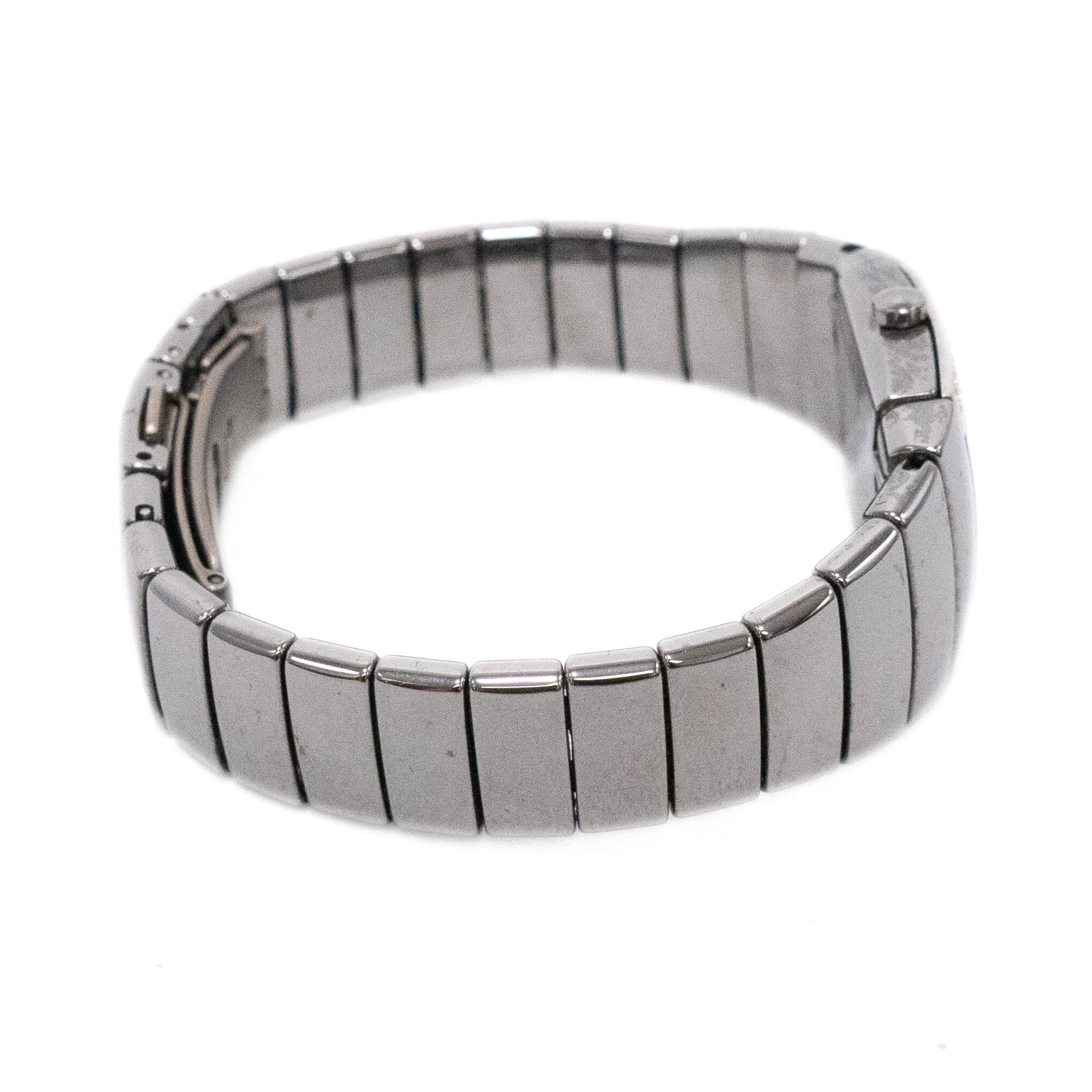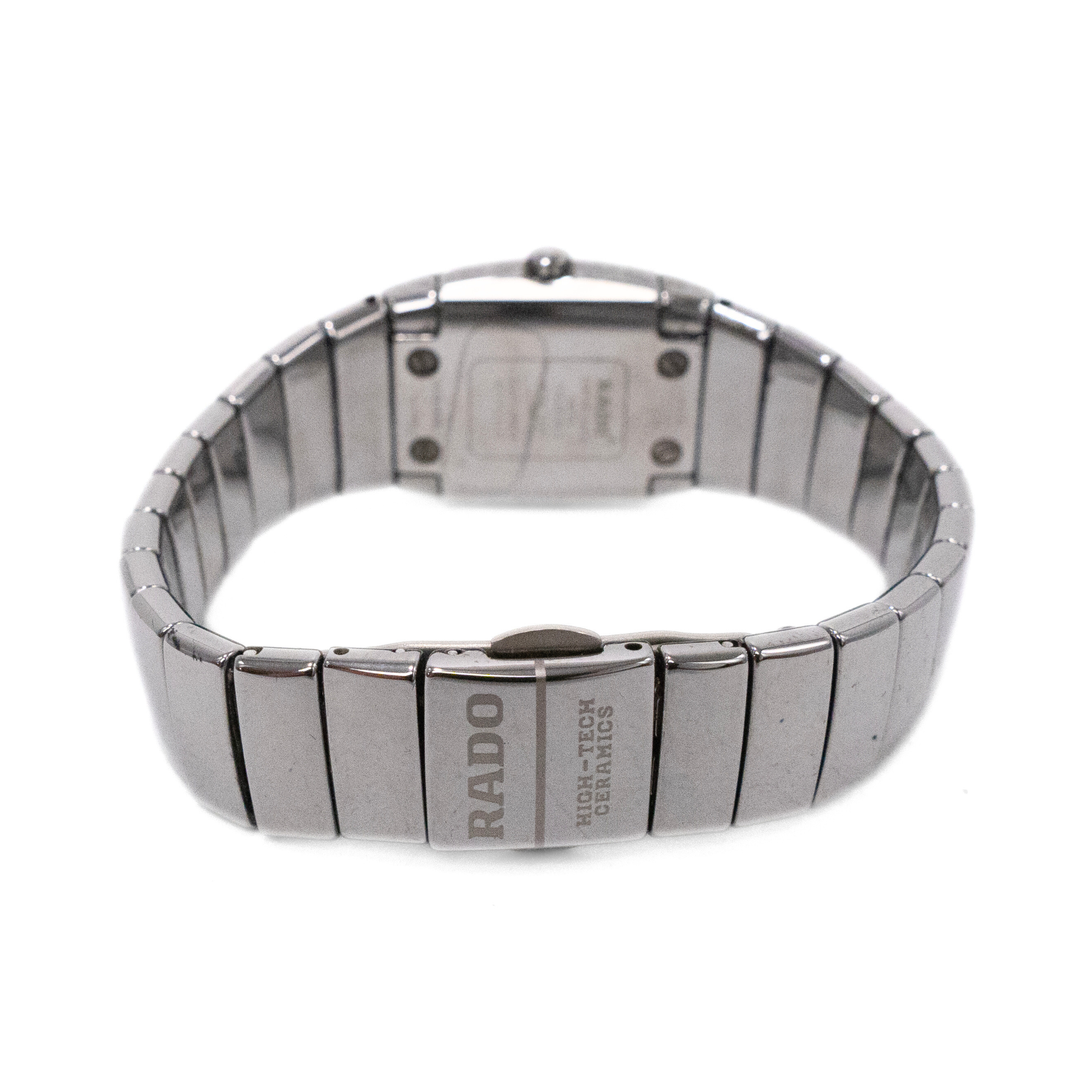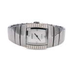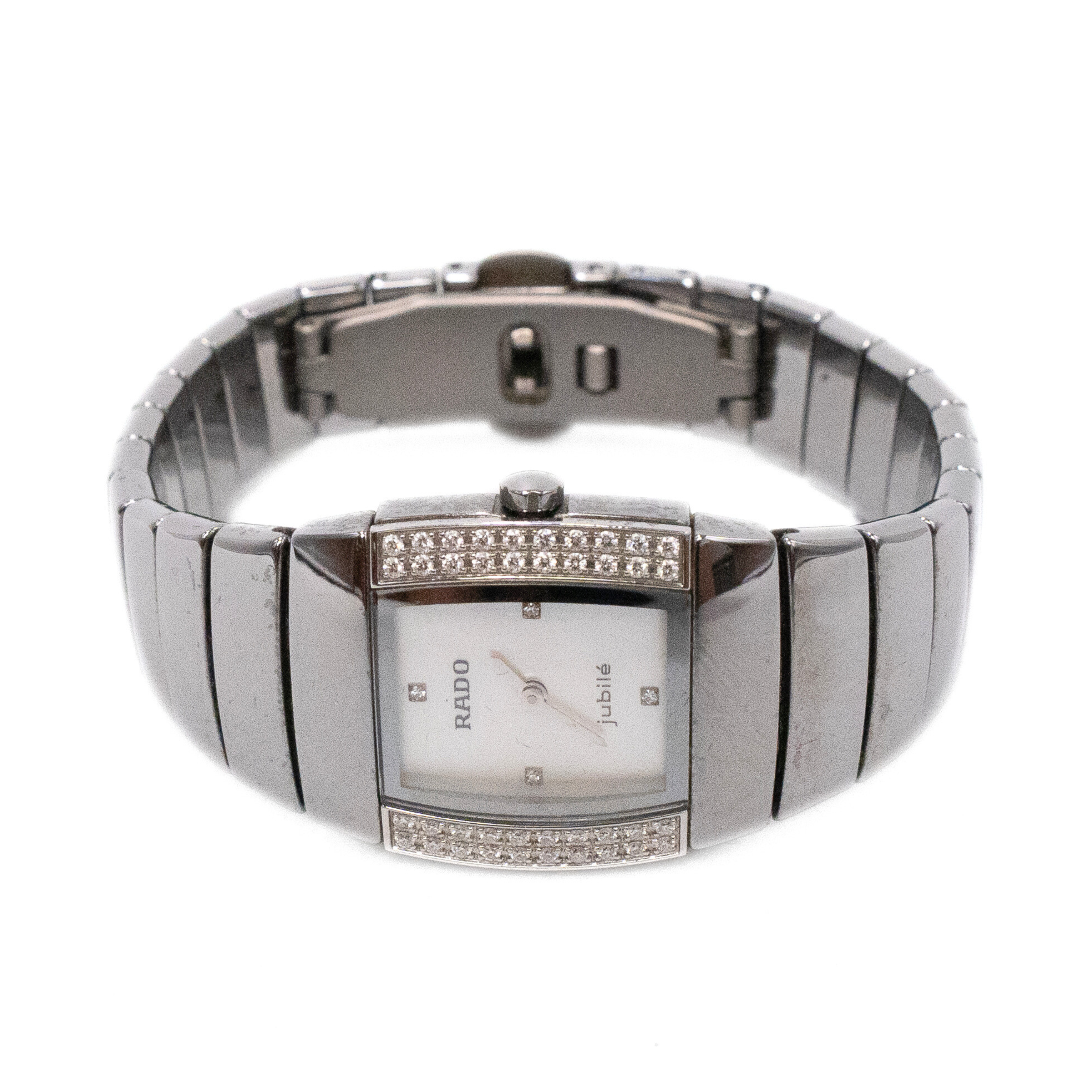 Rado 'Sintra Jubilé' wrist watch in chrome silver ceramic with a square face, platinum toned bezel, a white mother of pearl dial, and diamonds at the hour markers. The watch features two rows of inset diamonds on either side of the face.