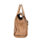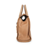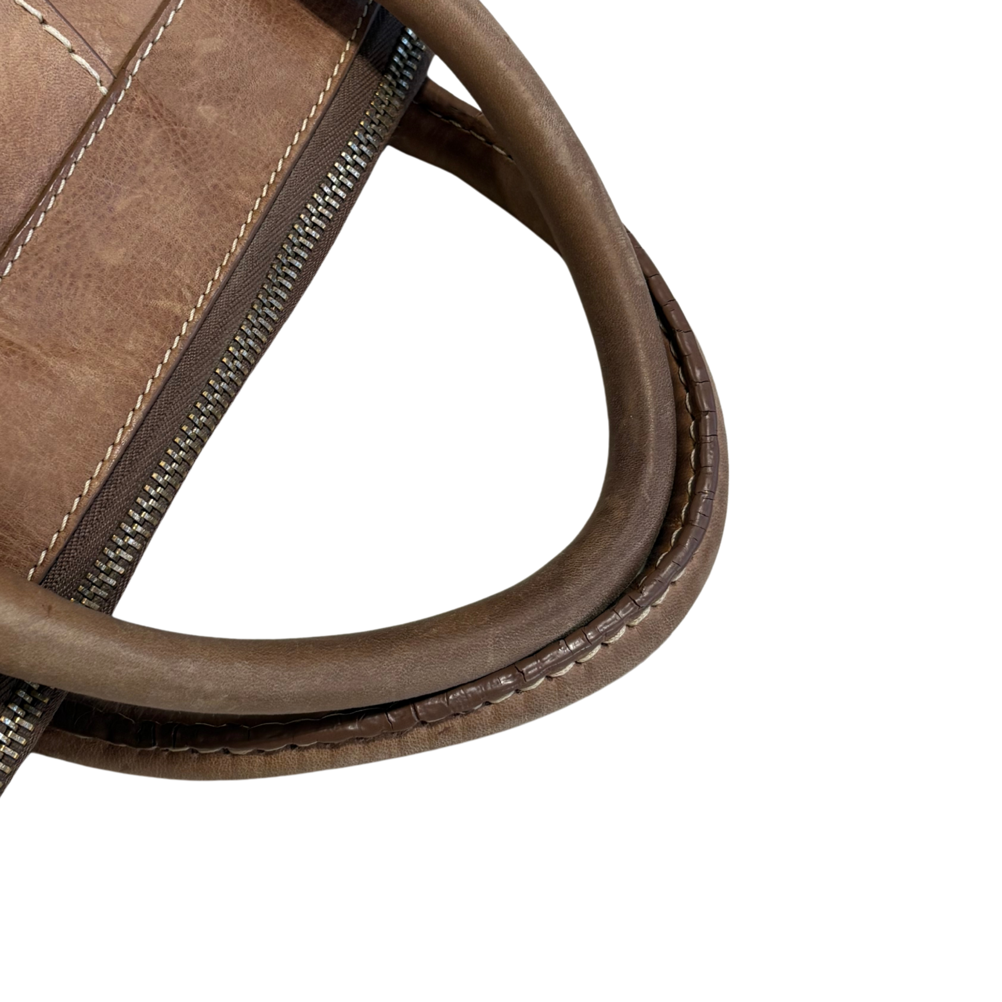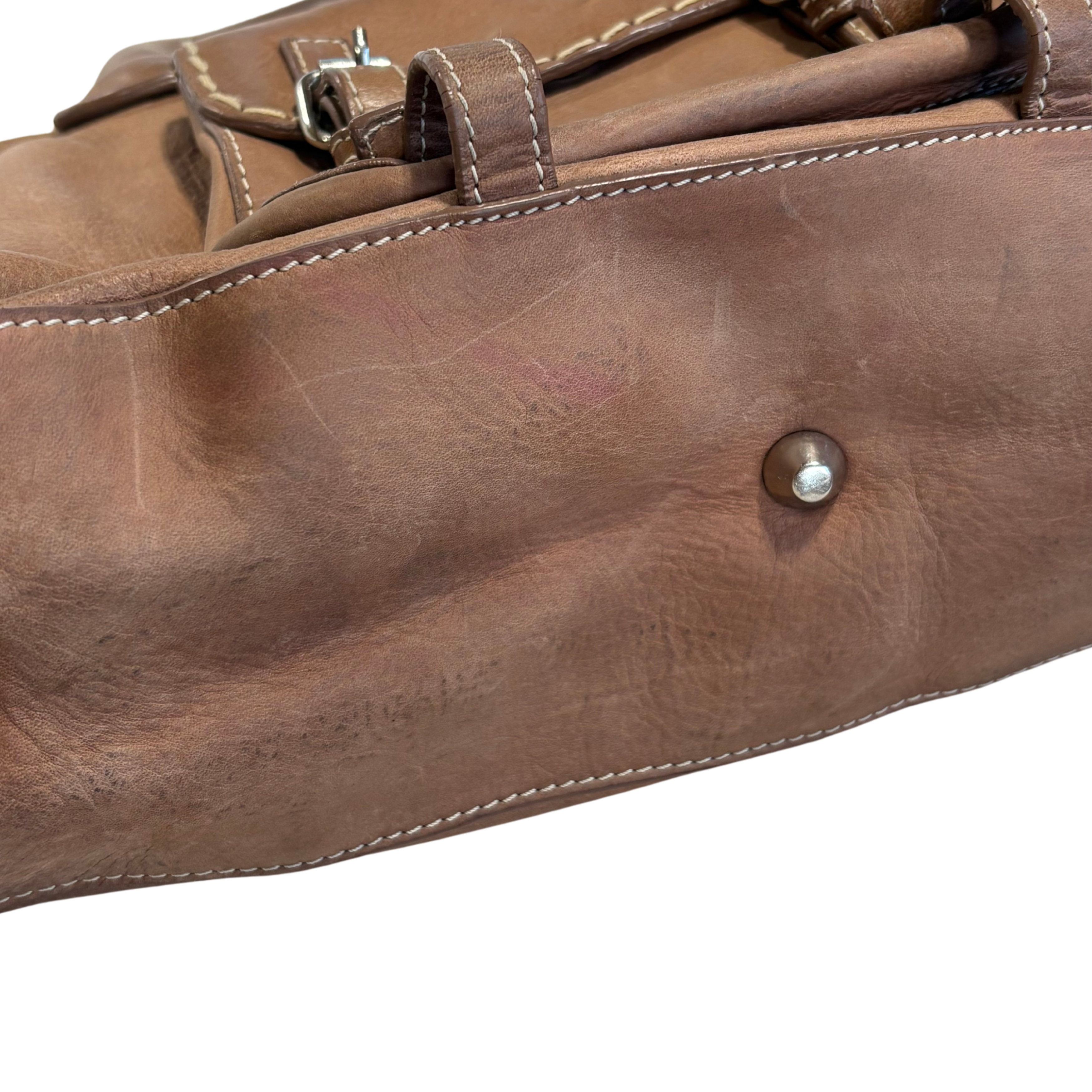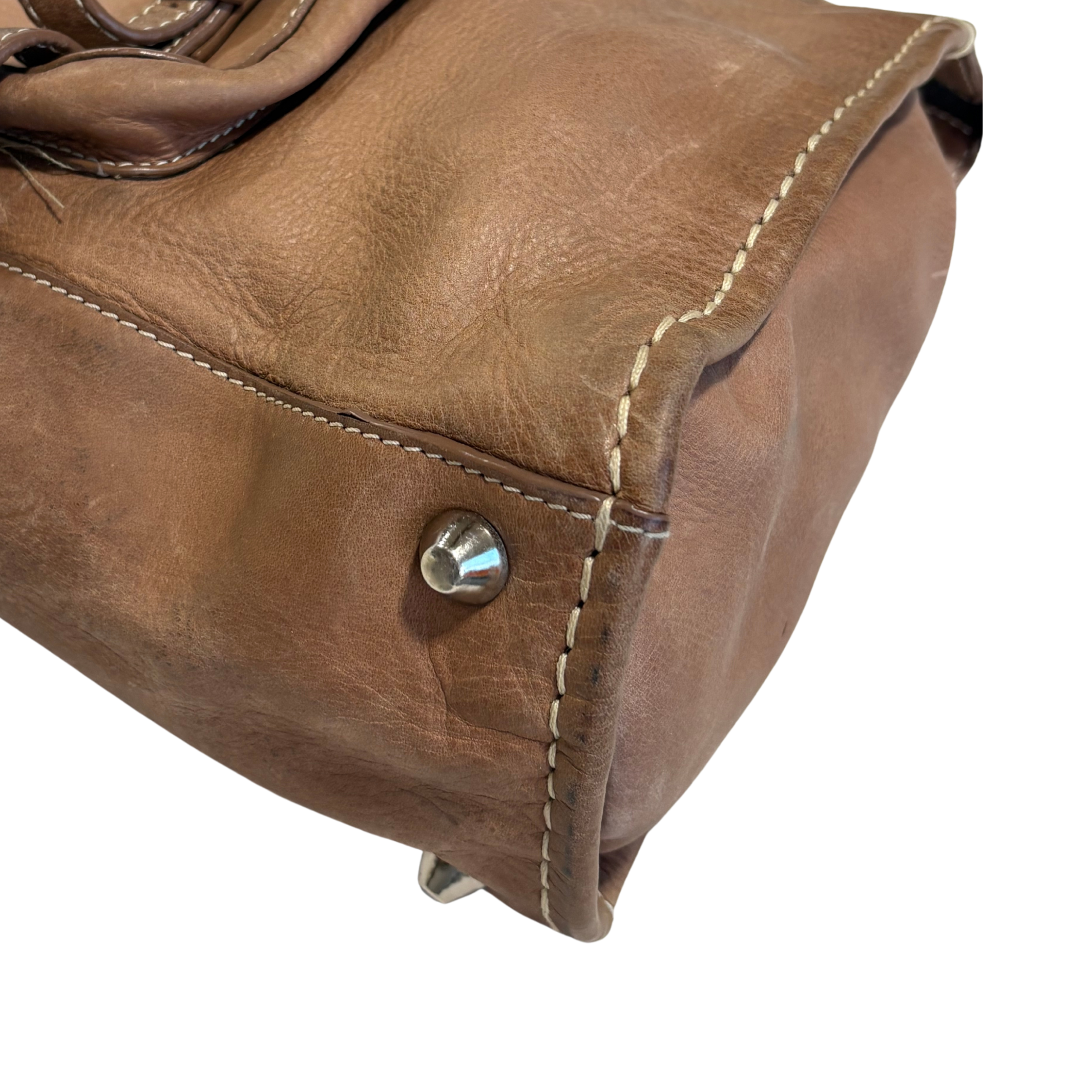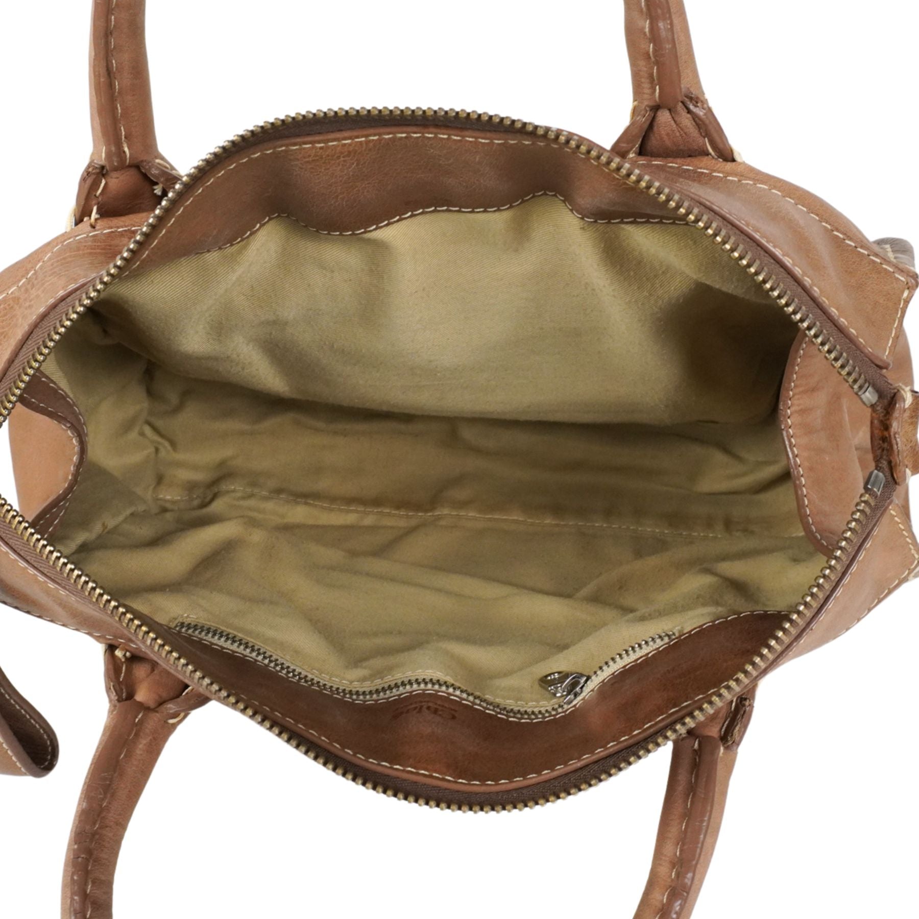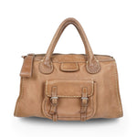 Chloe 'Edith' tote bag in light brown leather with dual rolled handles, front flap pocket and beige contrast stitching. Featuring a top zip closure that opens to beige canvas lining with zip pocket.