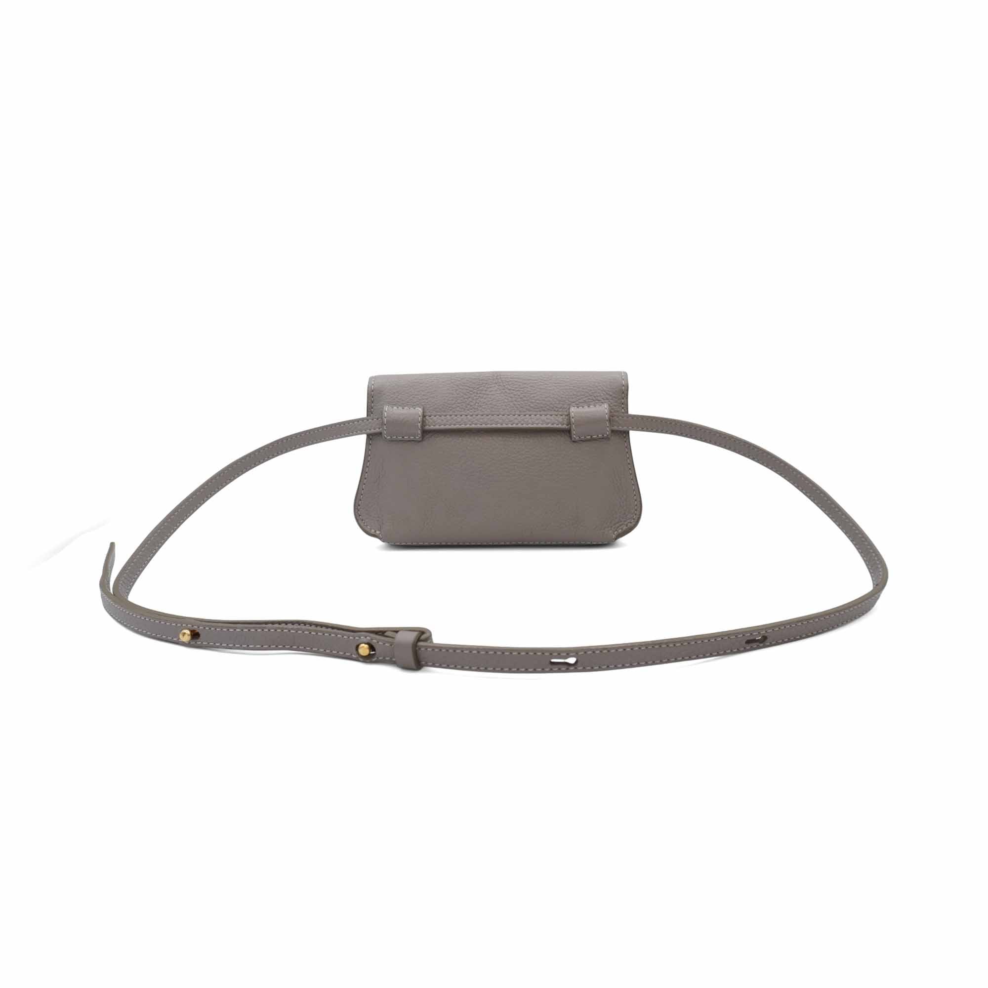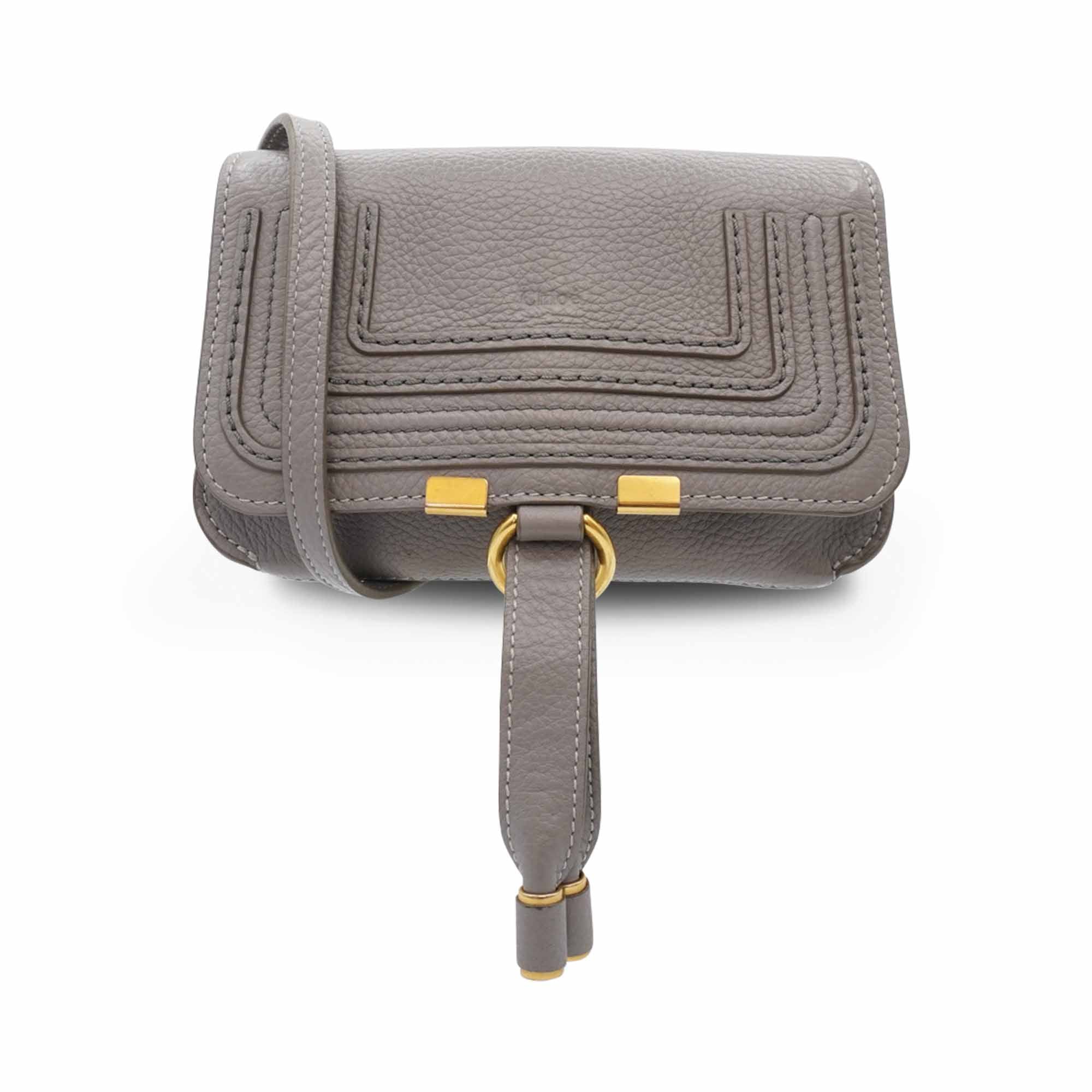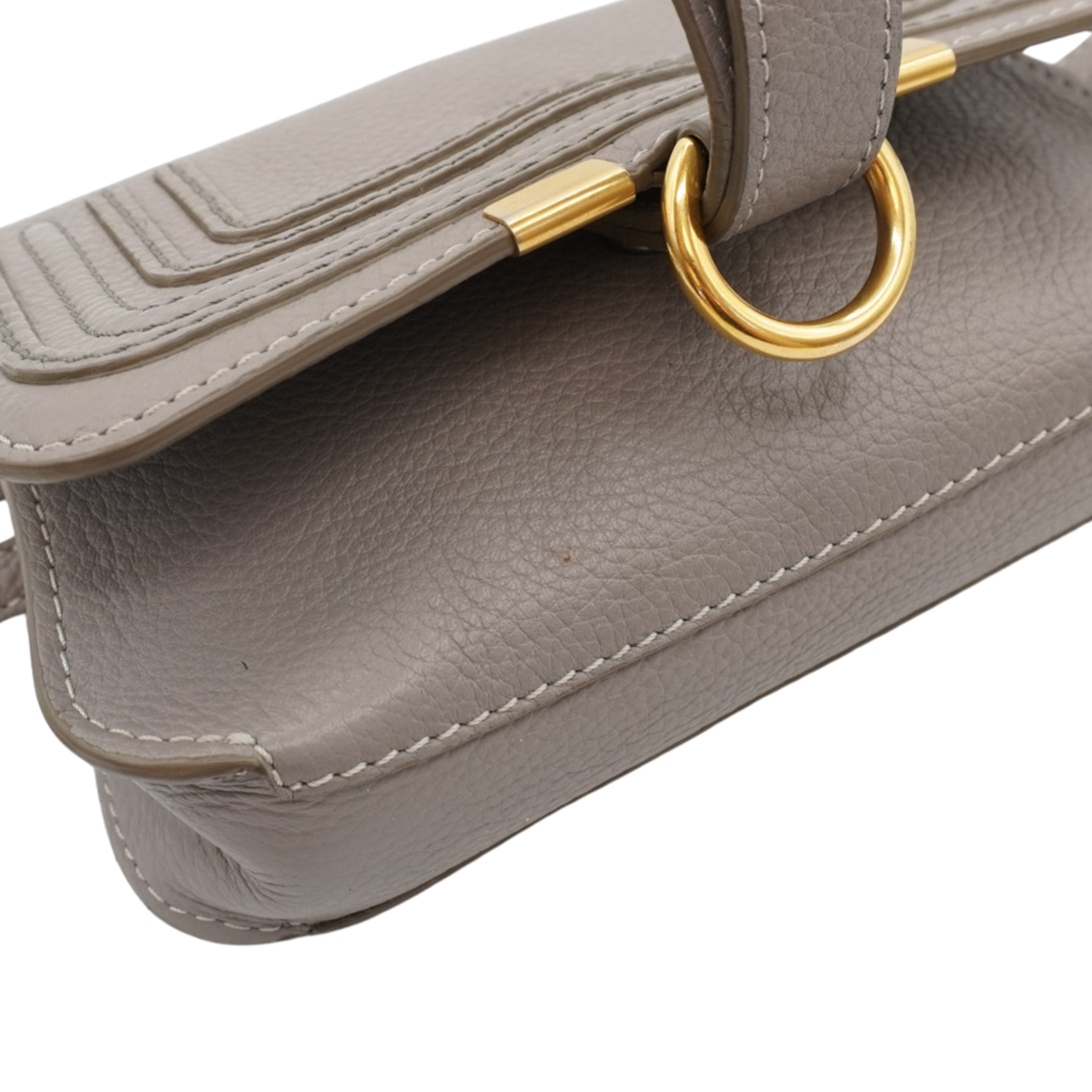 Chloe 'Marcie' waist bag in grey tumbled leather with gold hardware and signature O-ring detail. Features a magnetic flap closure, grey canvas lining, and interior slip pocket. The belt is adjustable and can be worn crossbody.