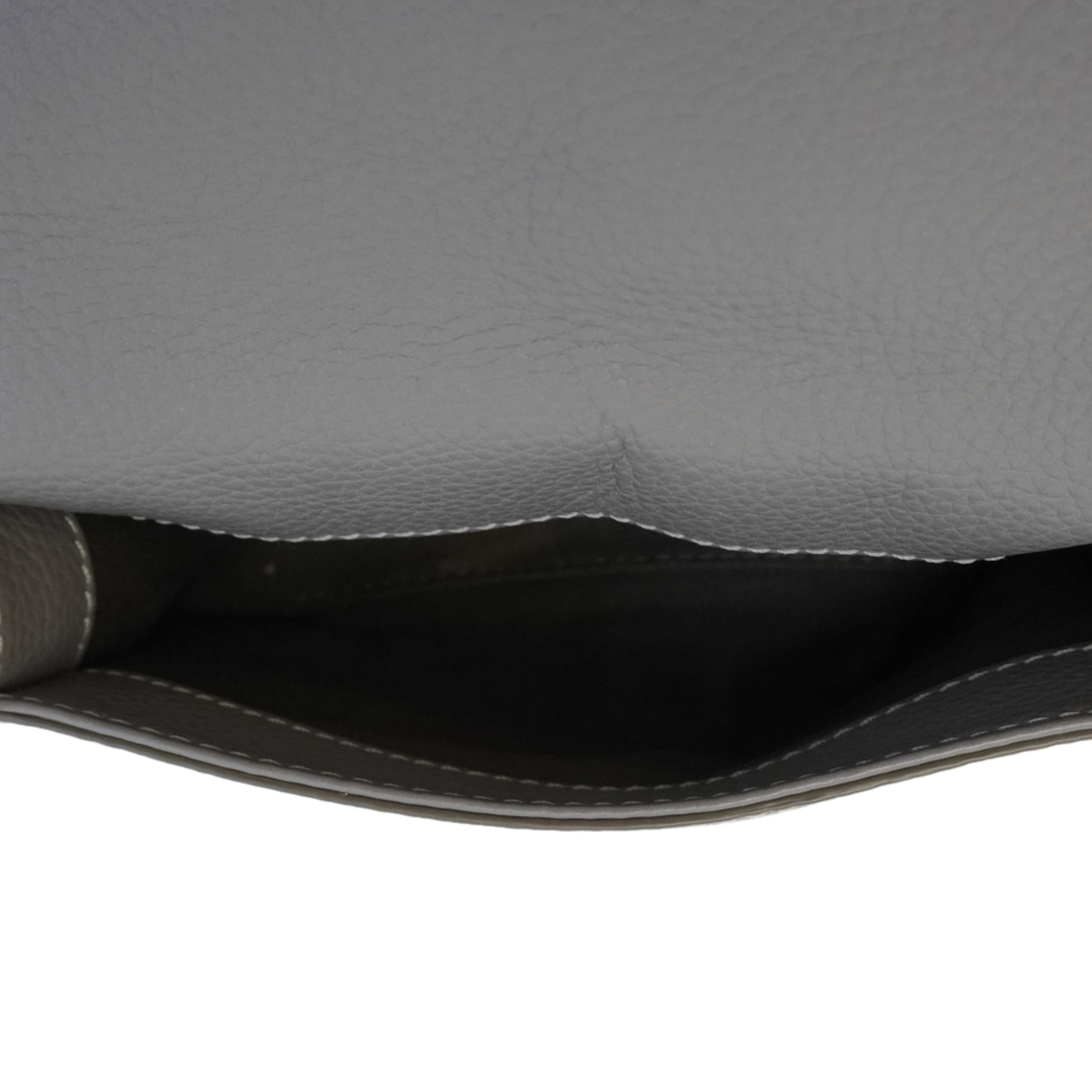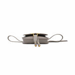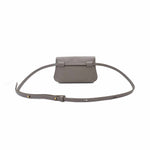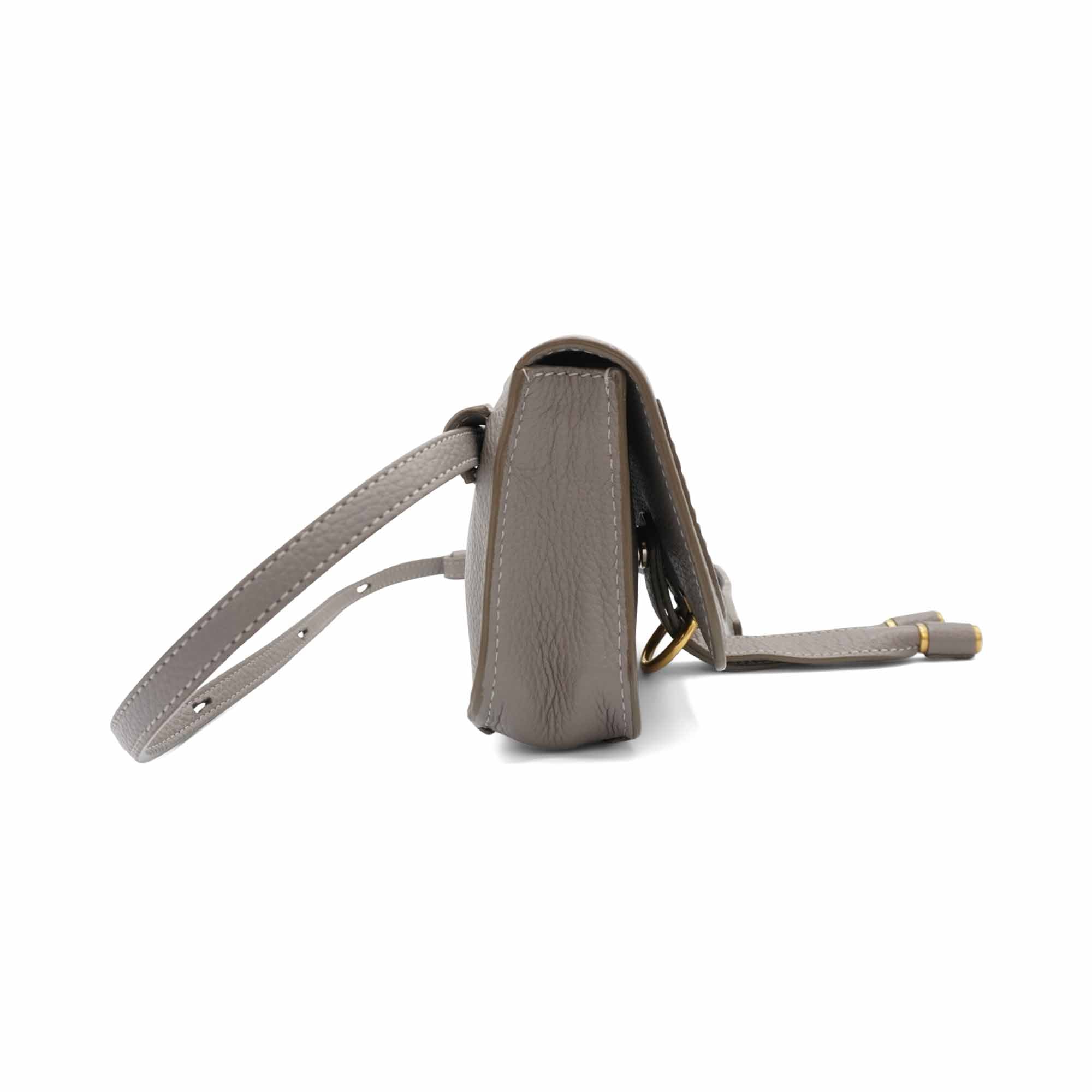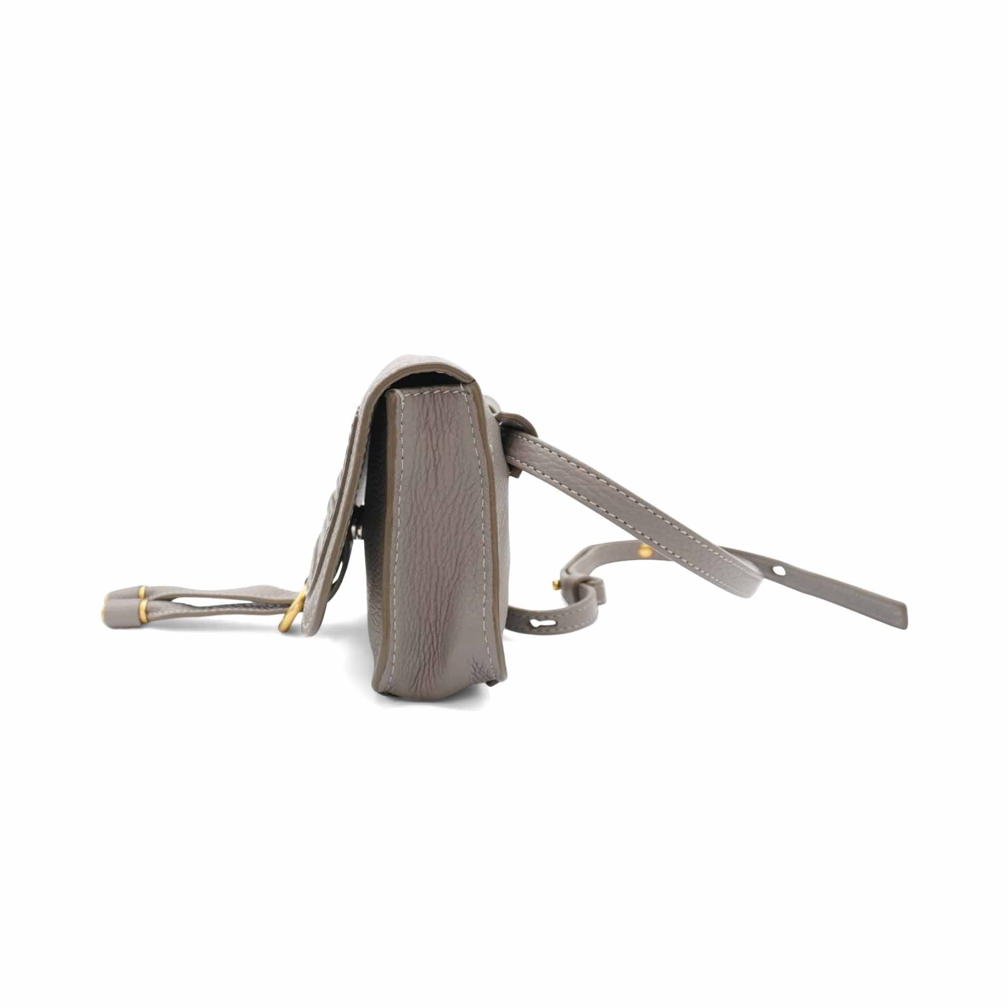 Chloe 'Marcie' waist bag in grey tumbled leather with gold hardware and signature O-ring detail. Features a magnetic flap closure, grey canvas lining, and interior slip pocket. The belt is adjustable and can be worn crossbody.