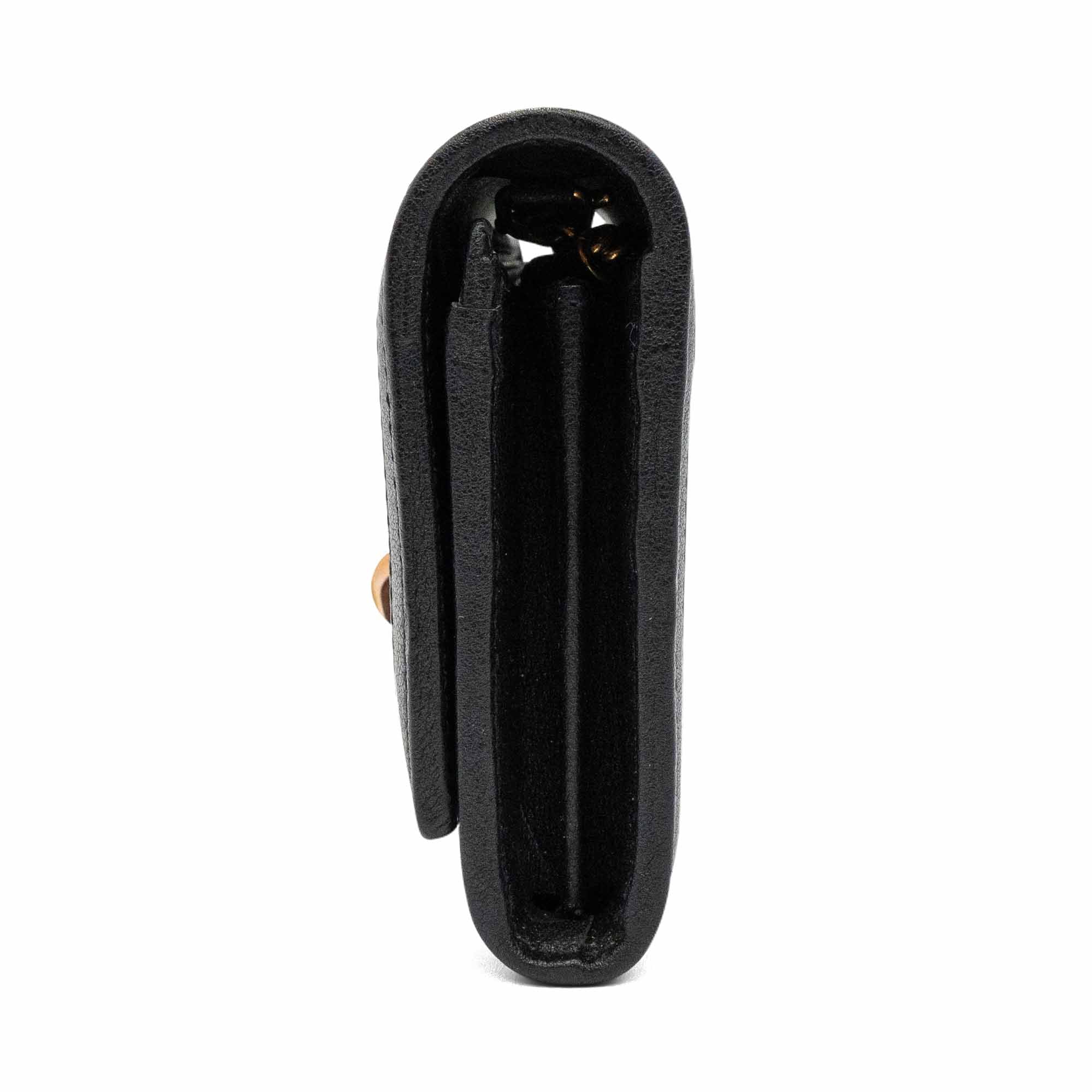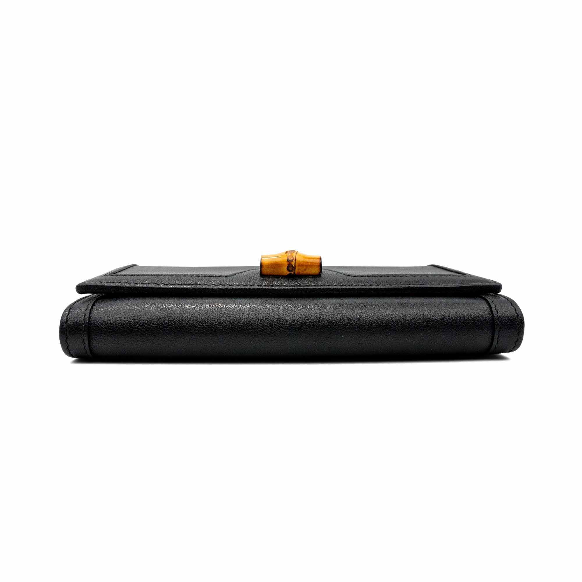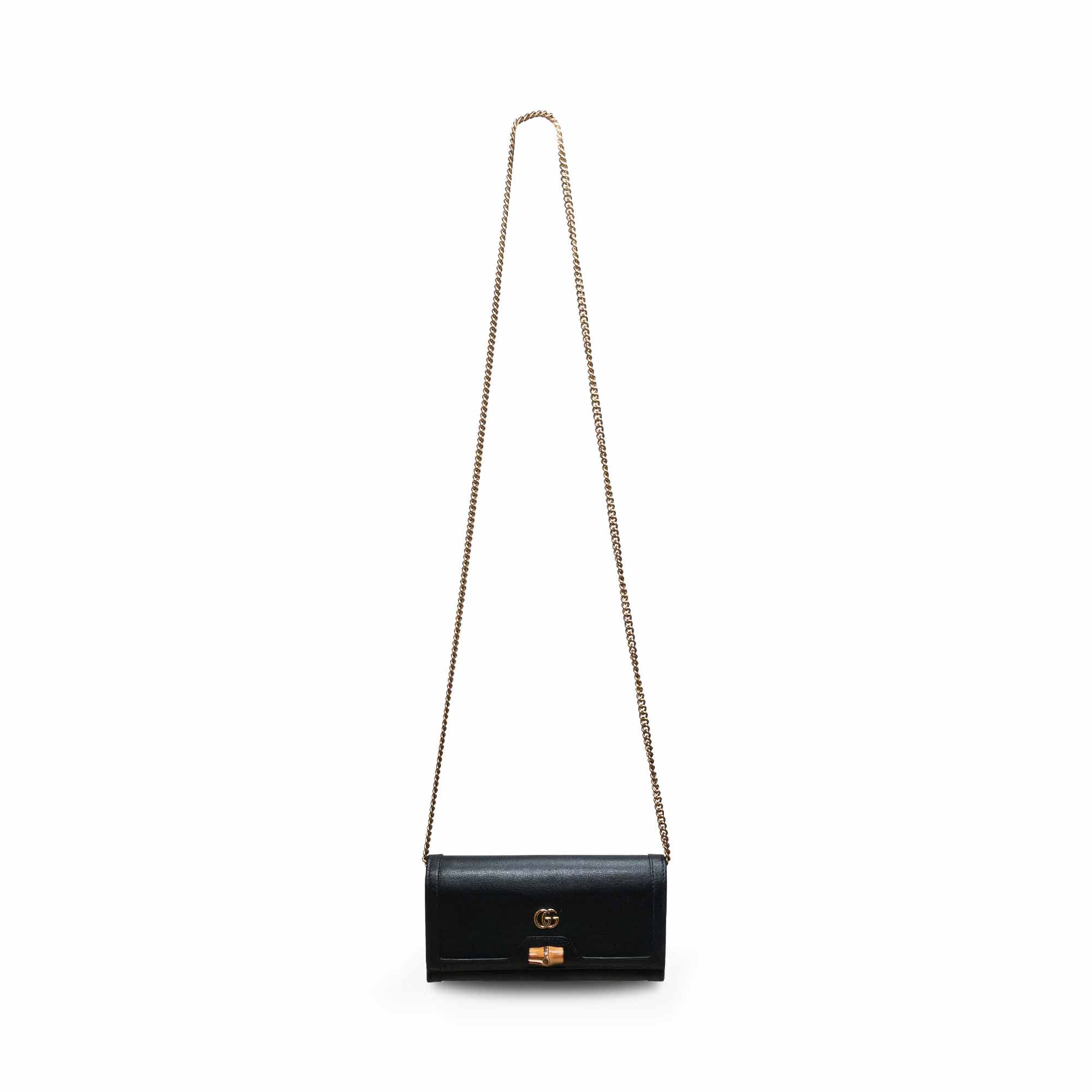Gucci 'Diana Bamboo' wallet on chain in navy grained leather with a gold chain crossbody strap, a 'GG' logo plaque, and a bamboo detail. The bag has a top flap opening with a snap closure revealing a leather lined interior with several card, zip and slip pockets.