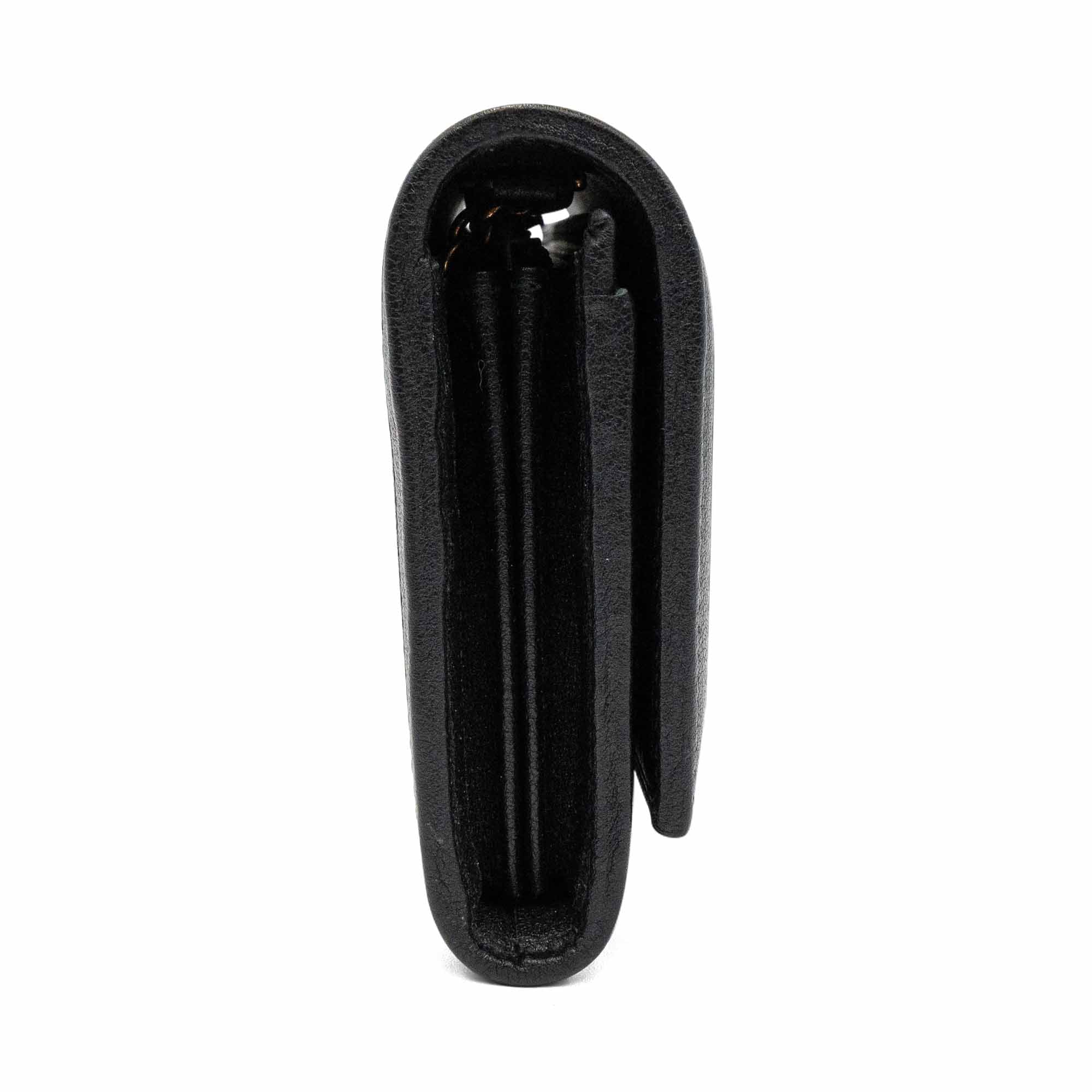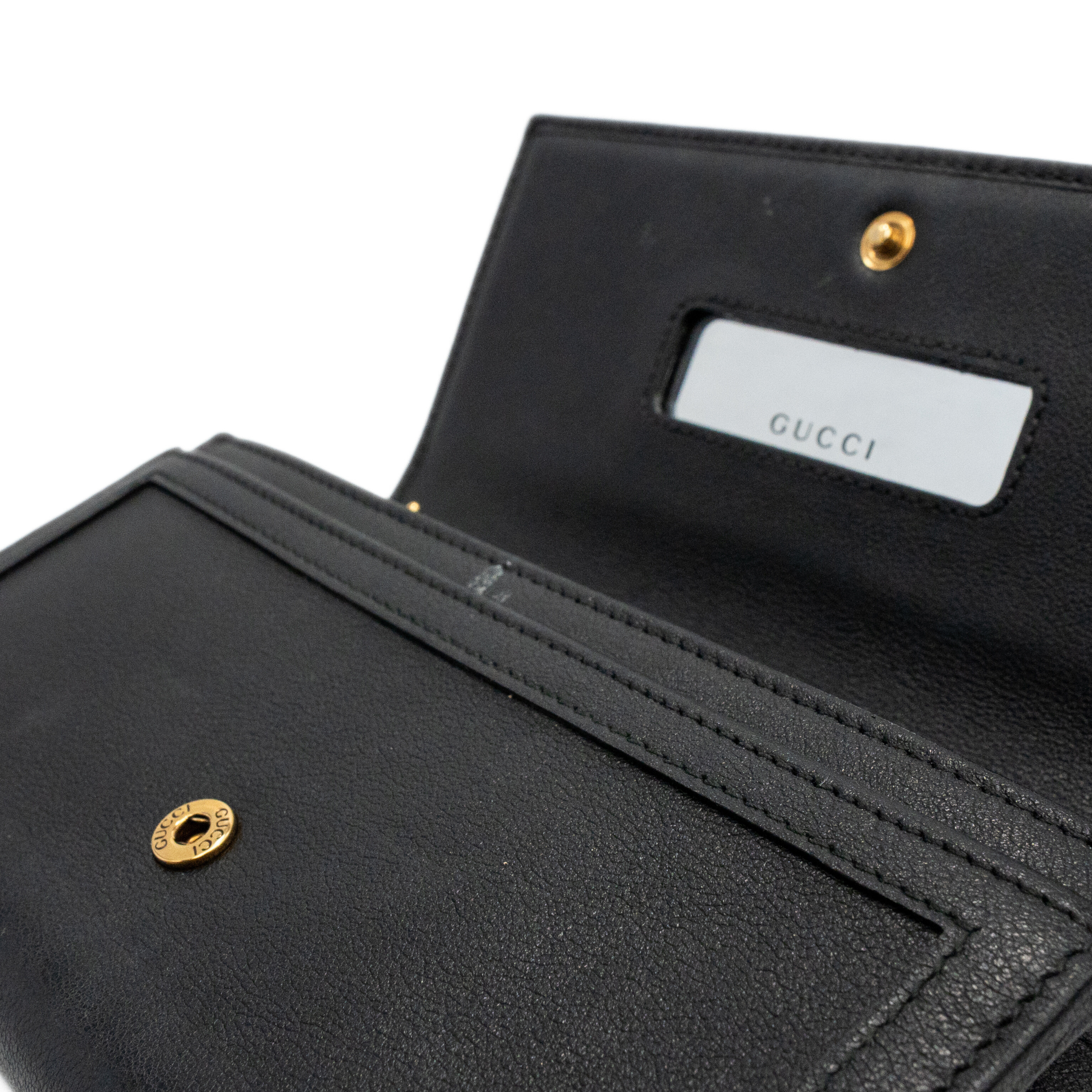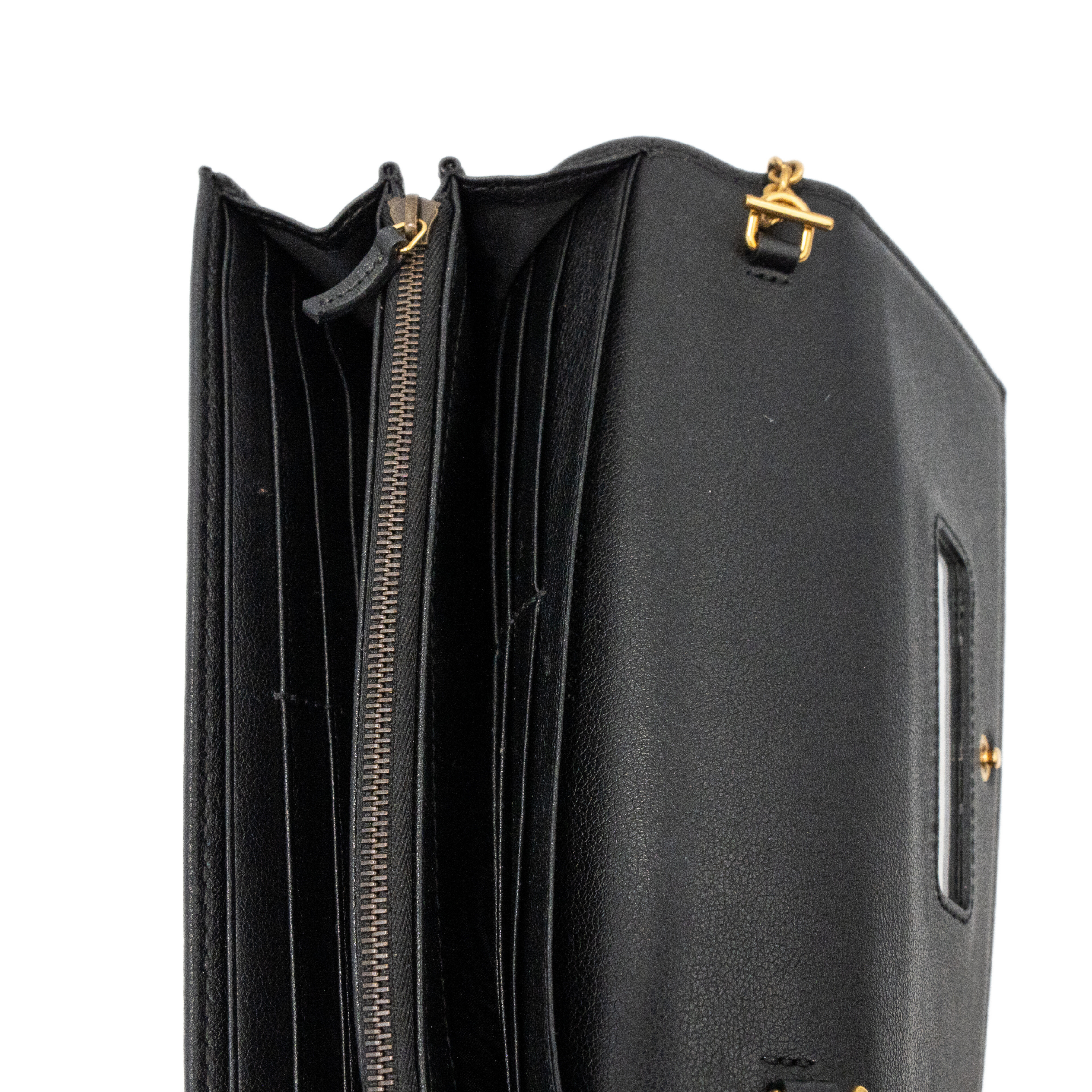 Gucci 'Diana Bamboo' wallet on chain in navy grained leather with a gold chain crossbody strap, a 'GG' logo plaque, and a bamboo detail. The bag has a top flap opening with a snap closure revealing a leather lined interior with several card, zip and slip pockets.