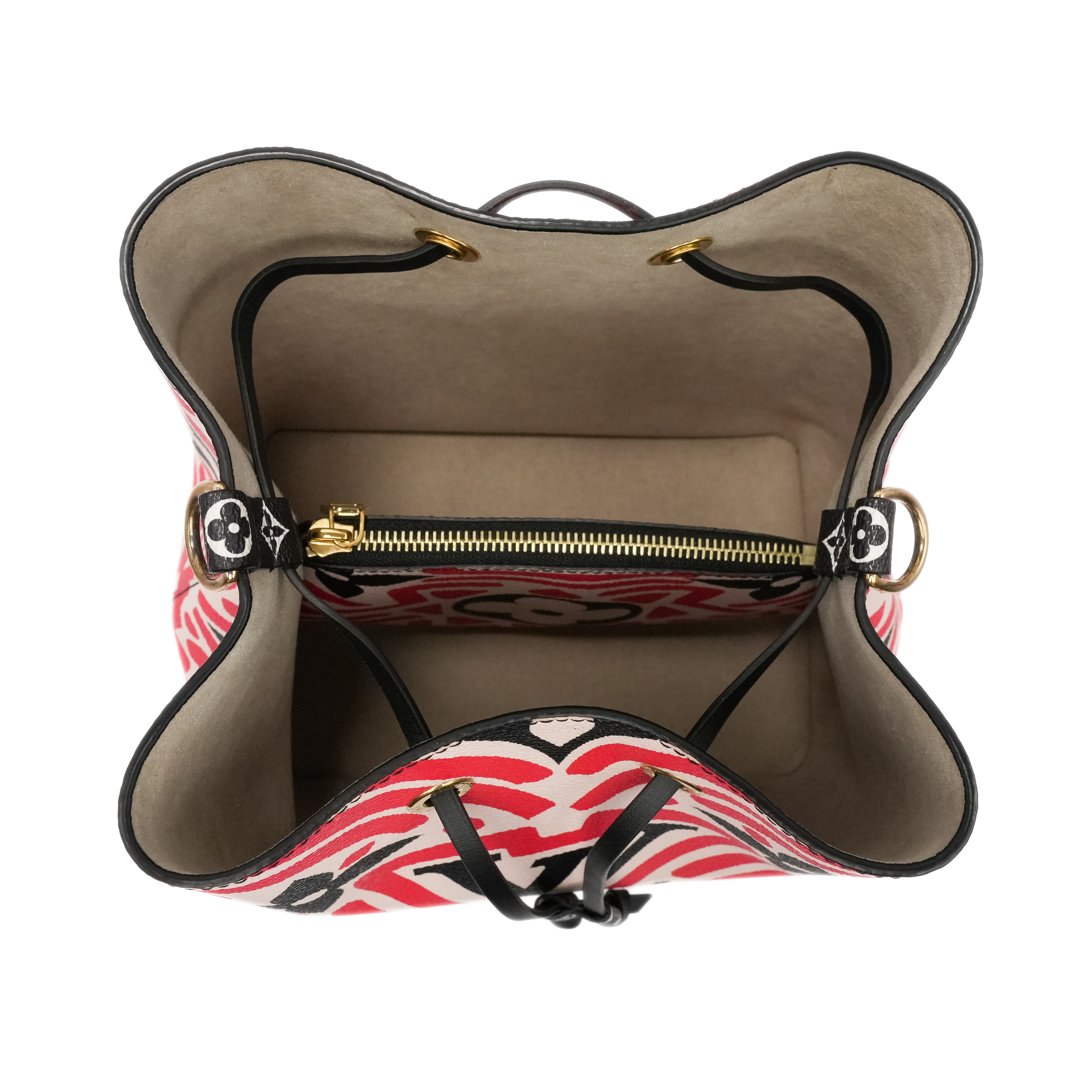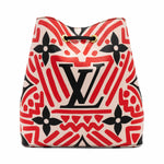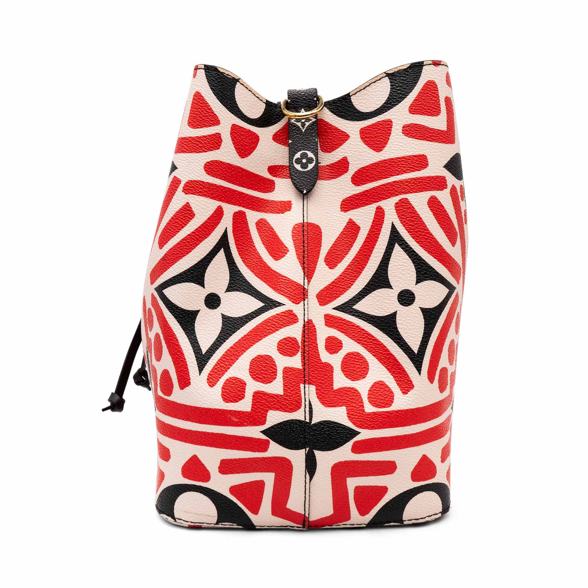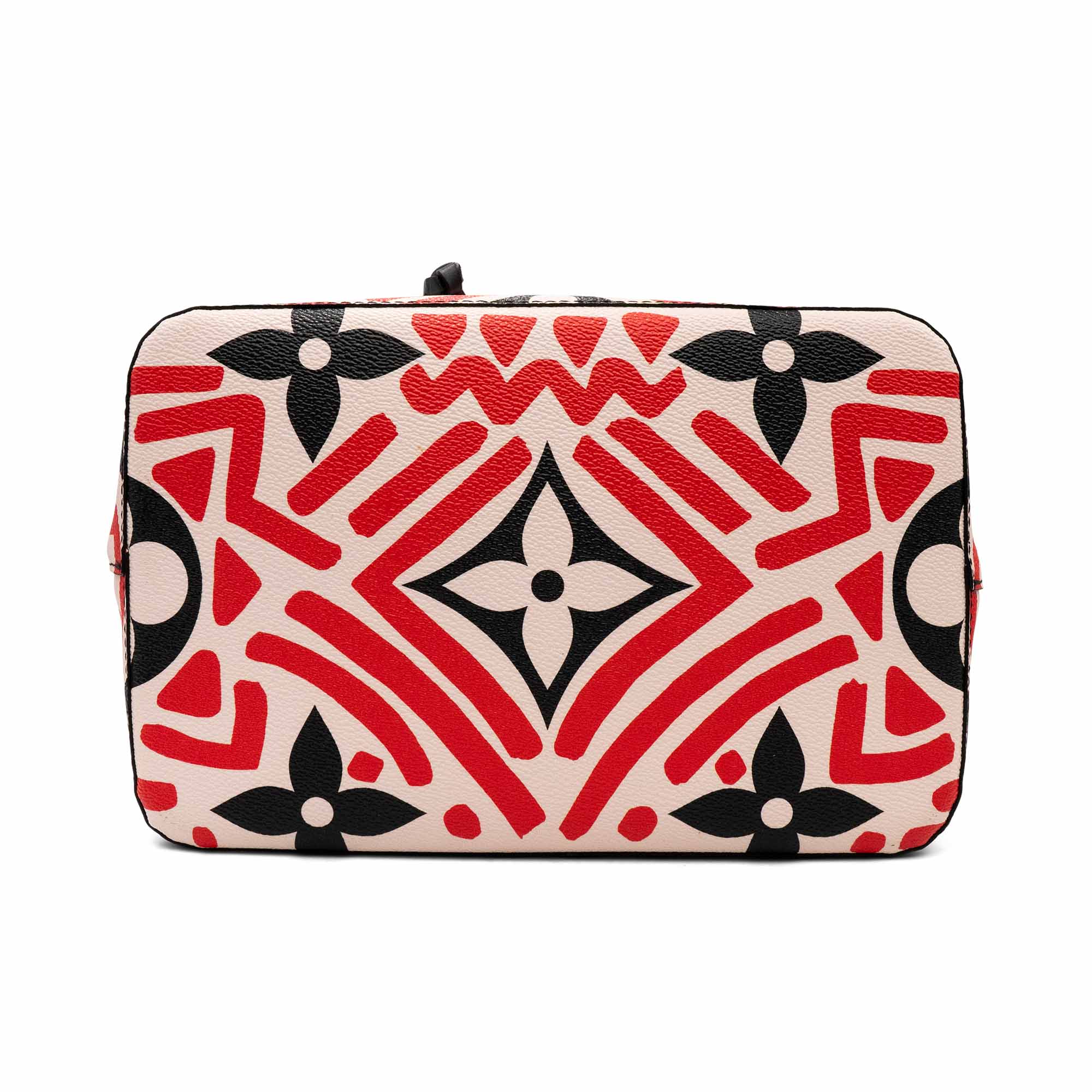 Louis Vuitton 'Neo Noe Crafty' bucket bag in white, red and navy graphic printed coated canvas with black monogram printed leather drawstring and strap. Features an adjustable drawstring closure and a removable top handle strap that can be adjusted to shoulder length with snap-buttons. The interior is taupe suede lined with a centre zipper pocket.