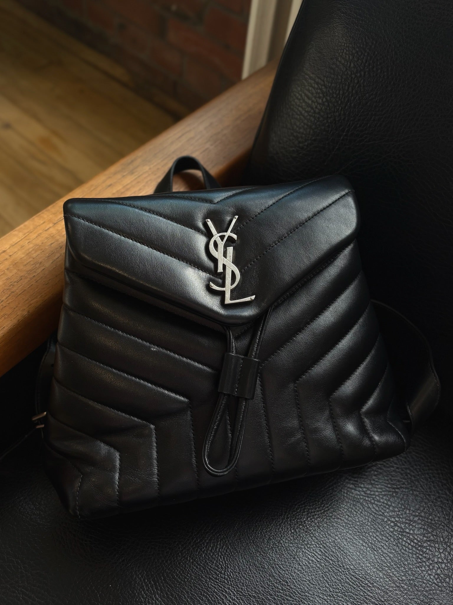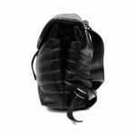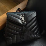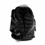 Saint Laurent 'Lou Lou' mini backpack in chevron quilted, smooth black leather. Features silver logo on flap, magnetic snap and drawstring closures, an inner zip pocket and slip pocket, and adjustable straps.