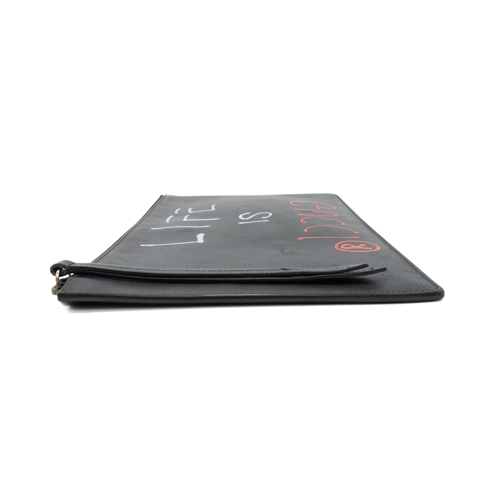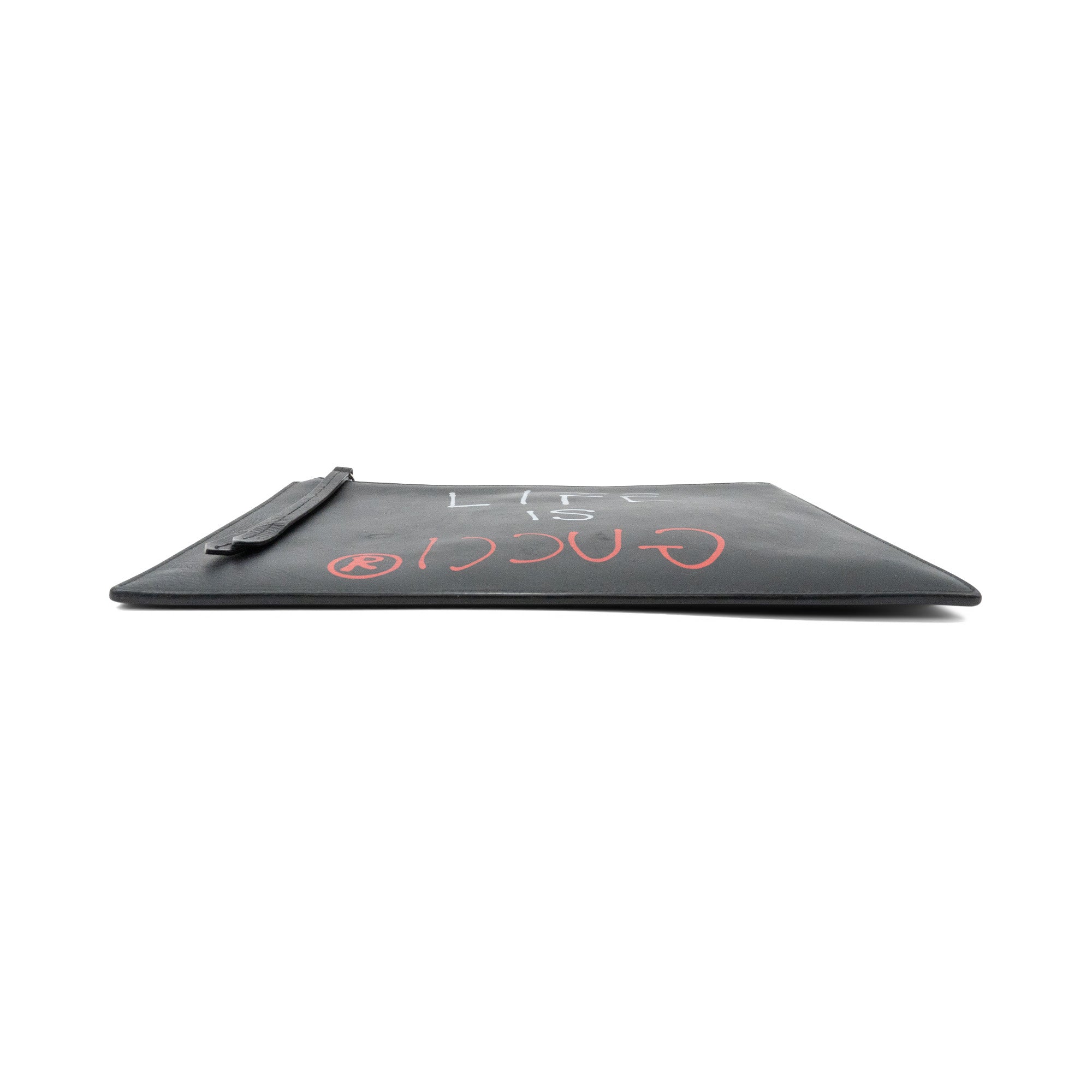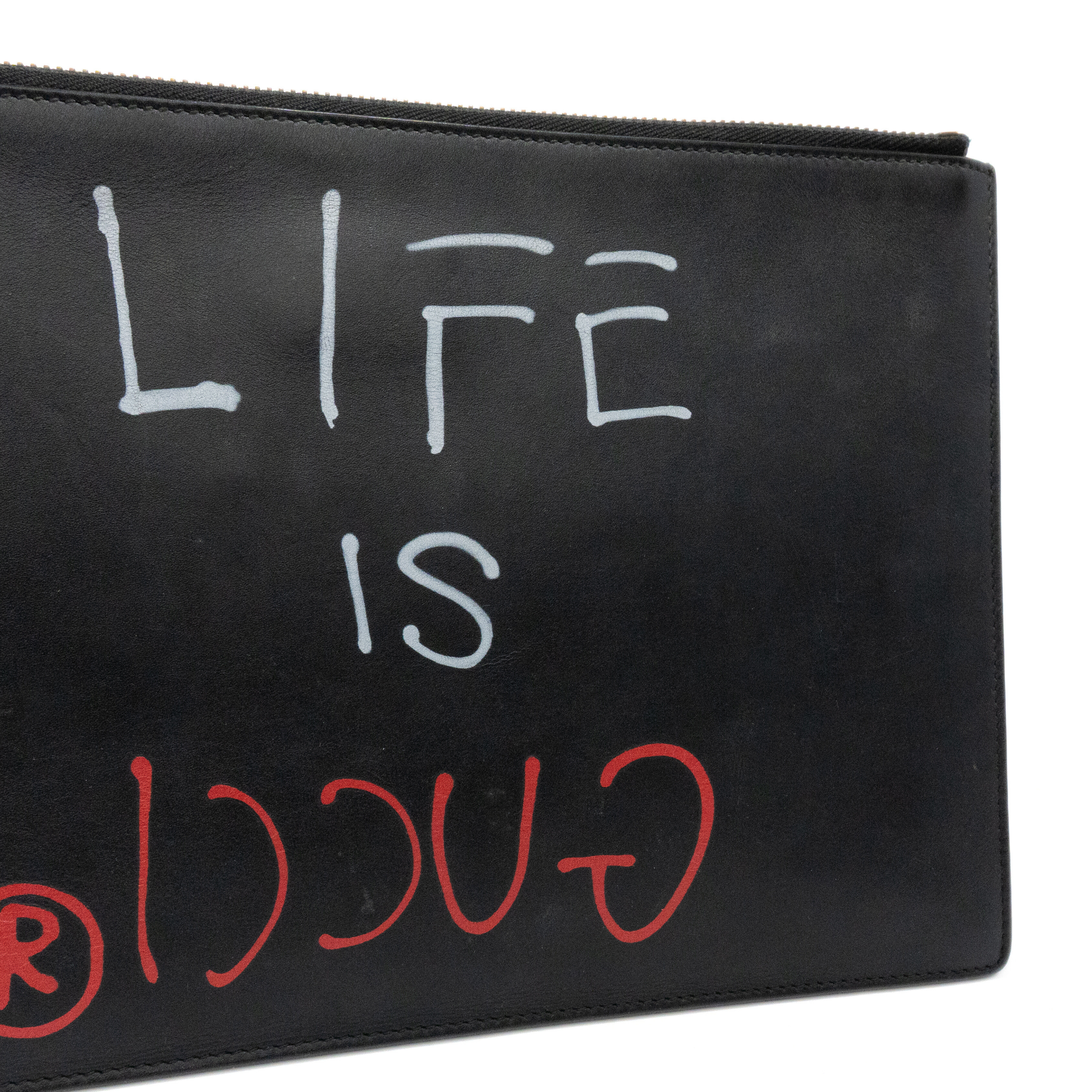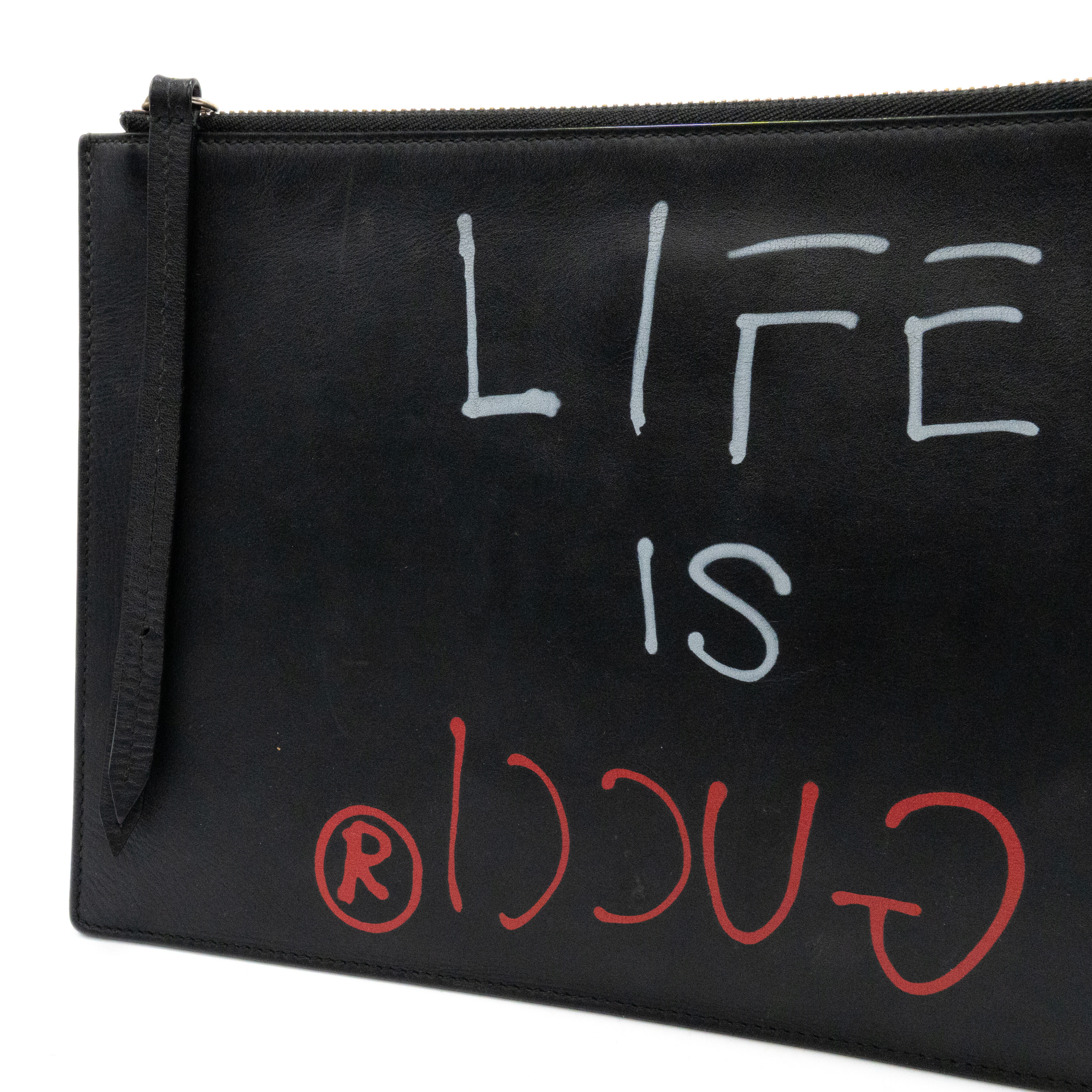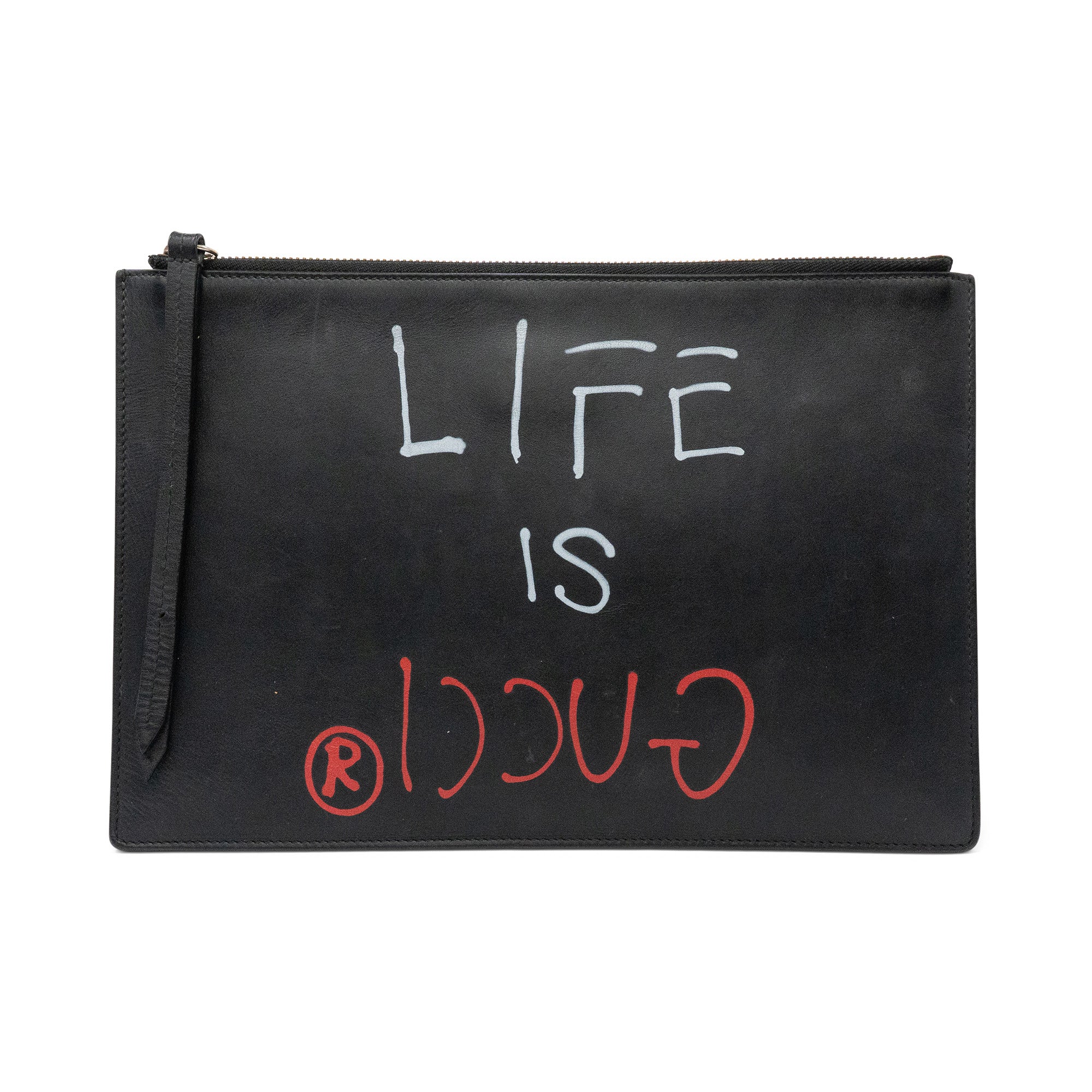 Gucci 'Ghost' by Trouble Andrew rectangular flat pouch bag in black leather with red and white spray paint font on the front that reads 'LIFE IS GUCCI'. Features a zipper closure on the top with a long, black leather zipper pull, and a light brown suede interior.