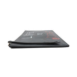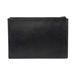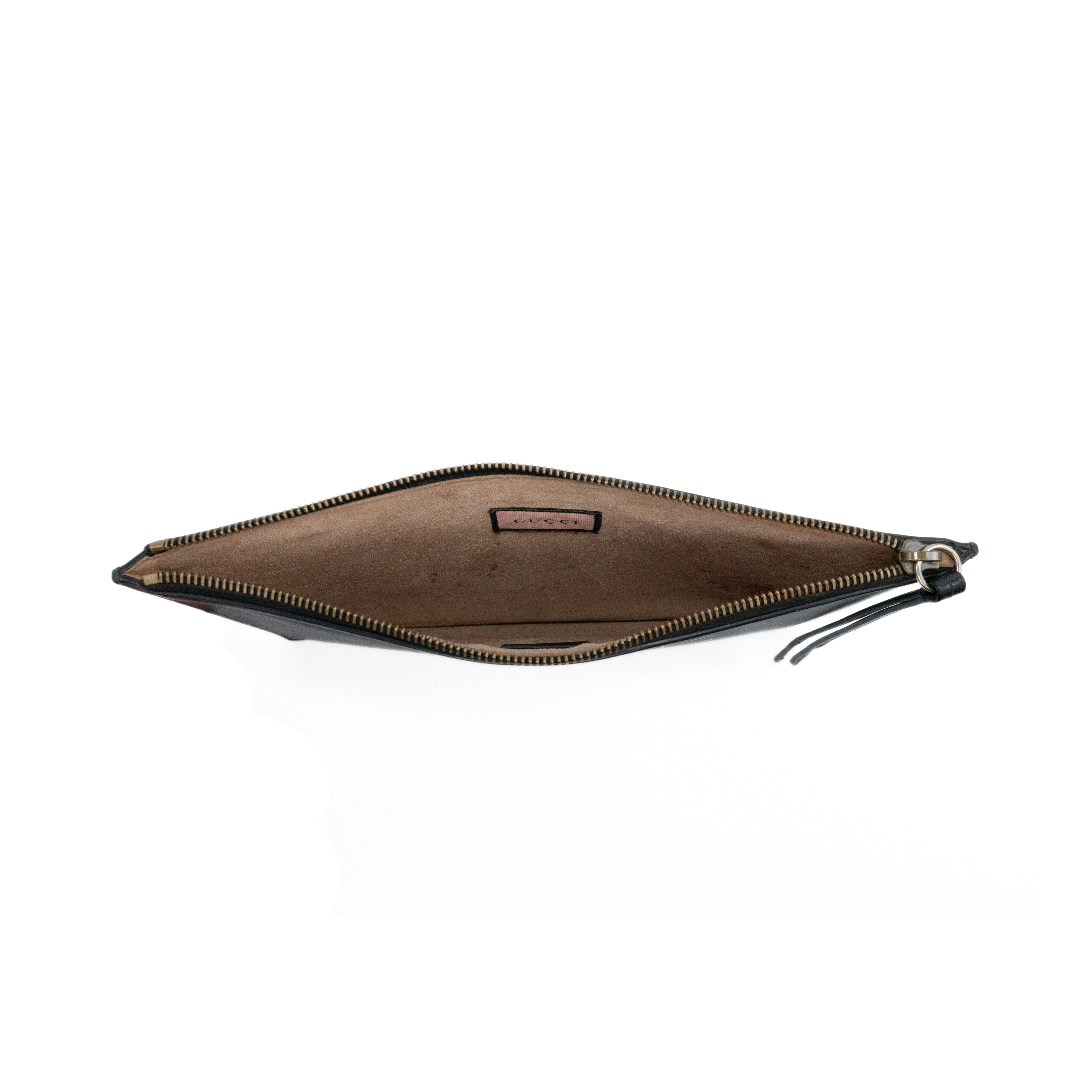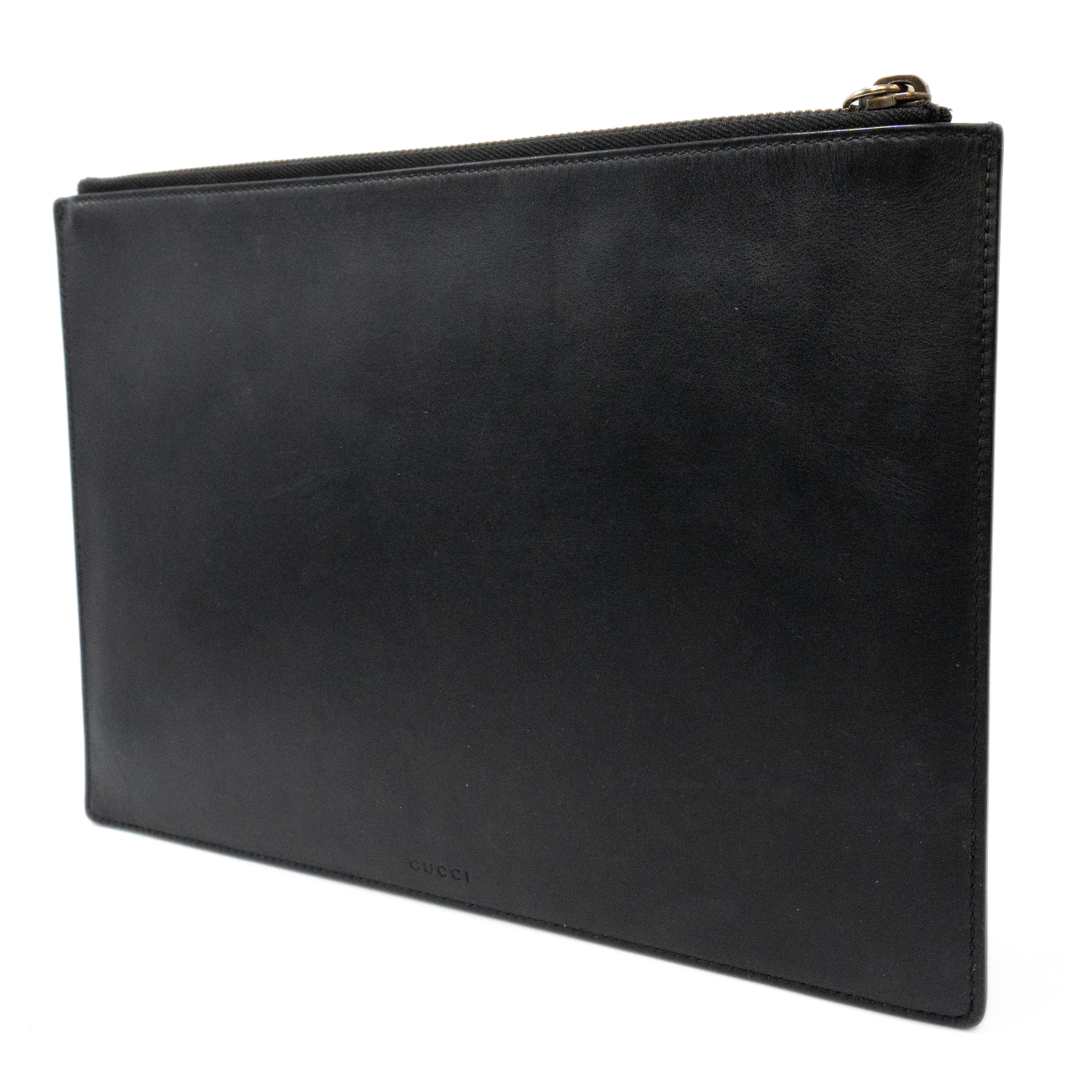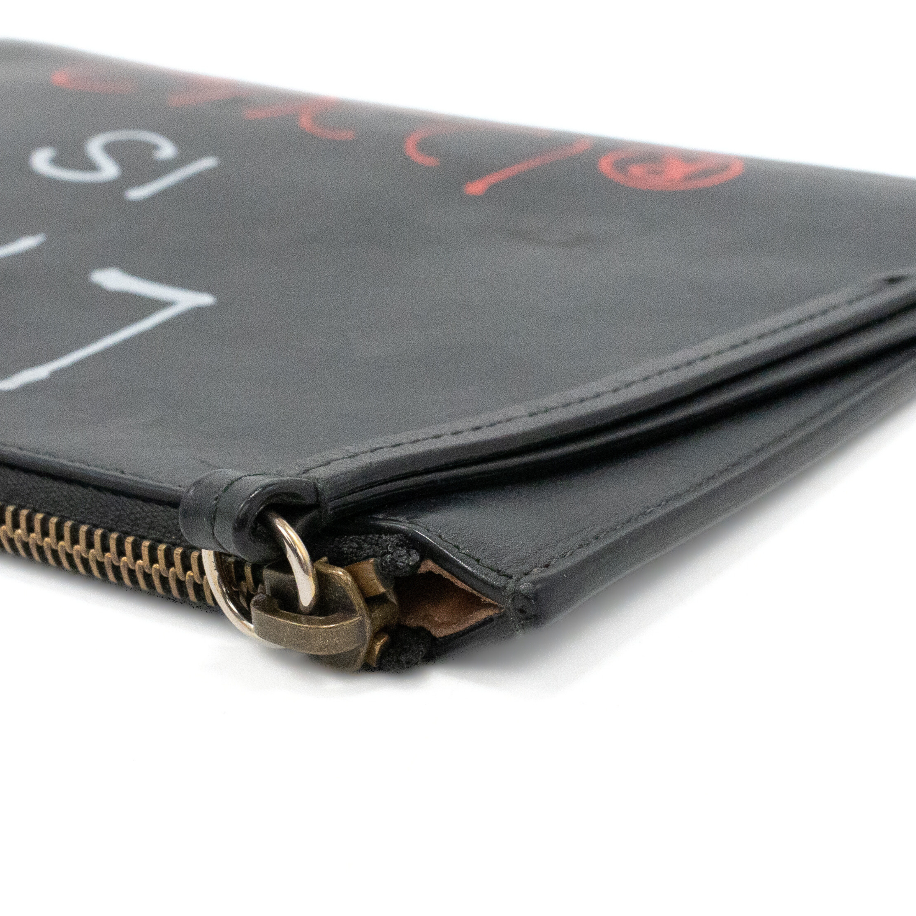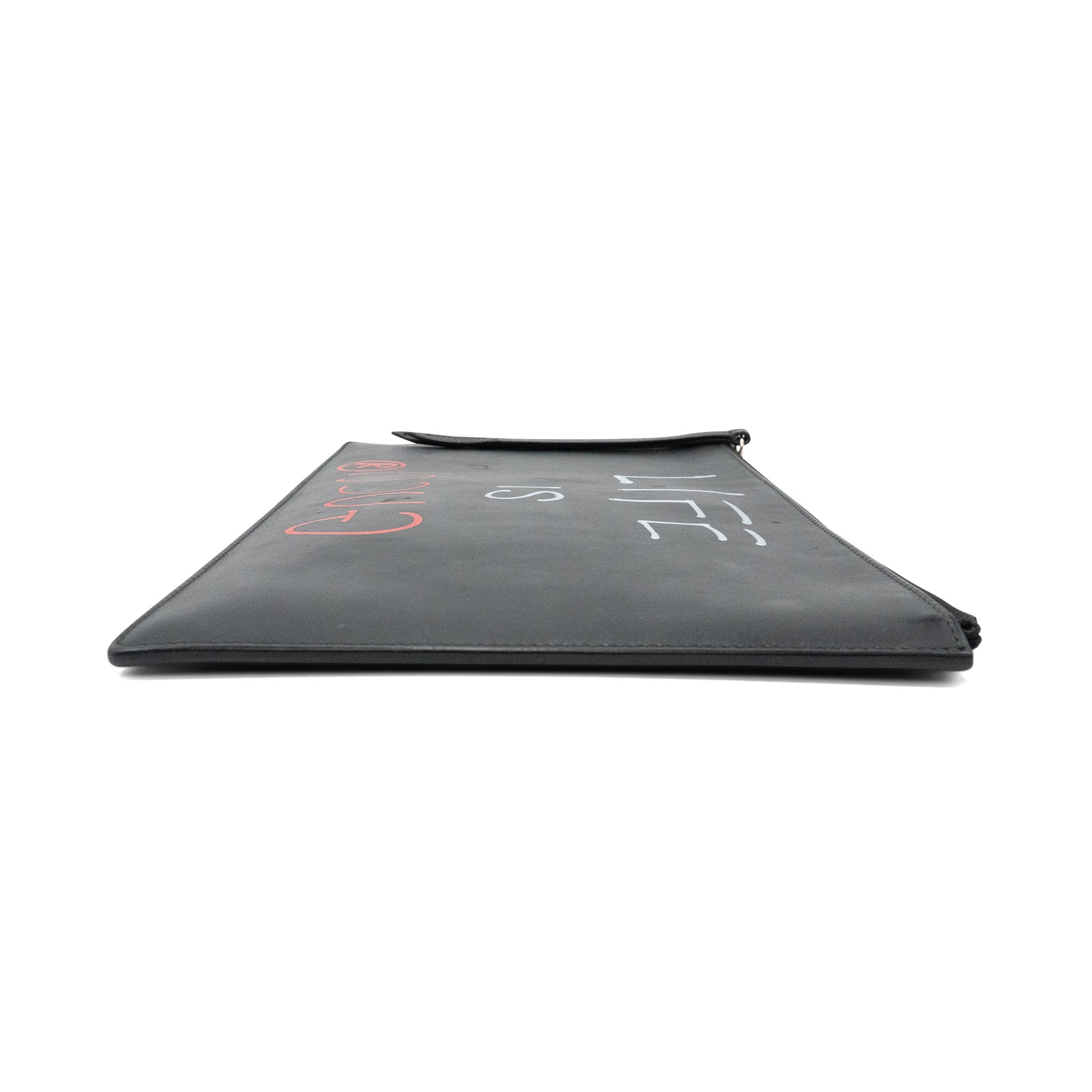 Gucci 'Ghost' by Trouble Andrew rectangular flat pouch bag in black leather with red and white spray paint font on the front that reads 'LIFE IS GUCCI'. Features a zipper closure on the top with a long, black leather zipper pull, and a light brown suede interior.