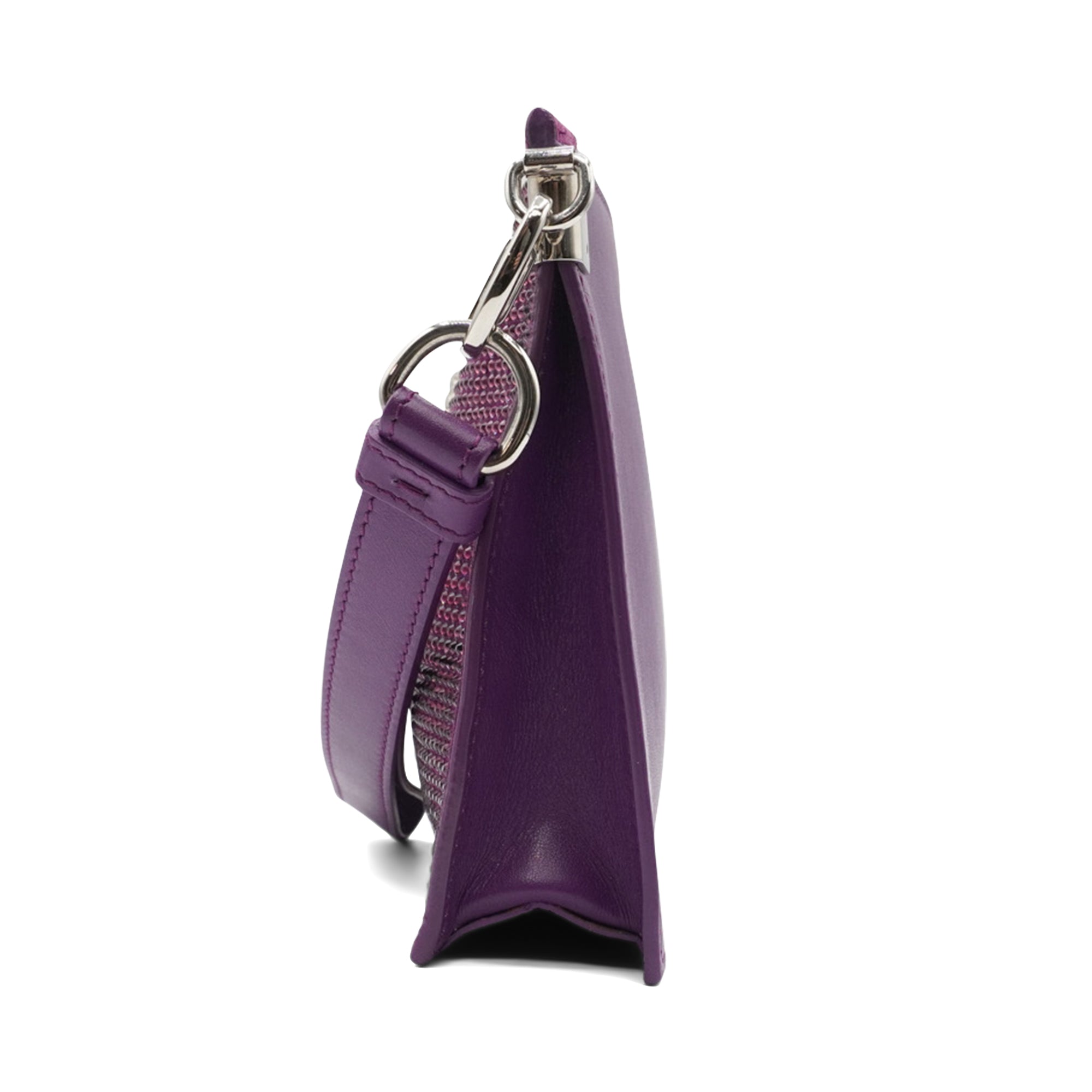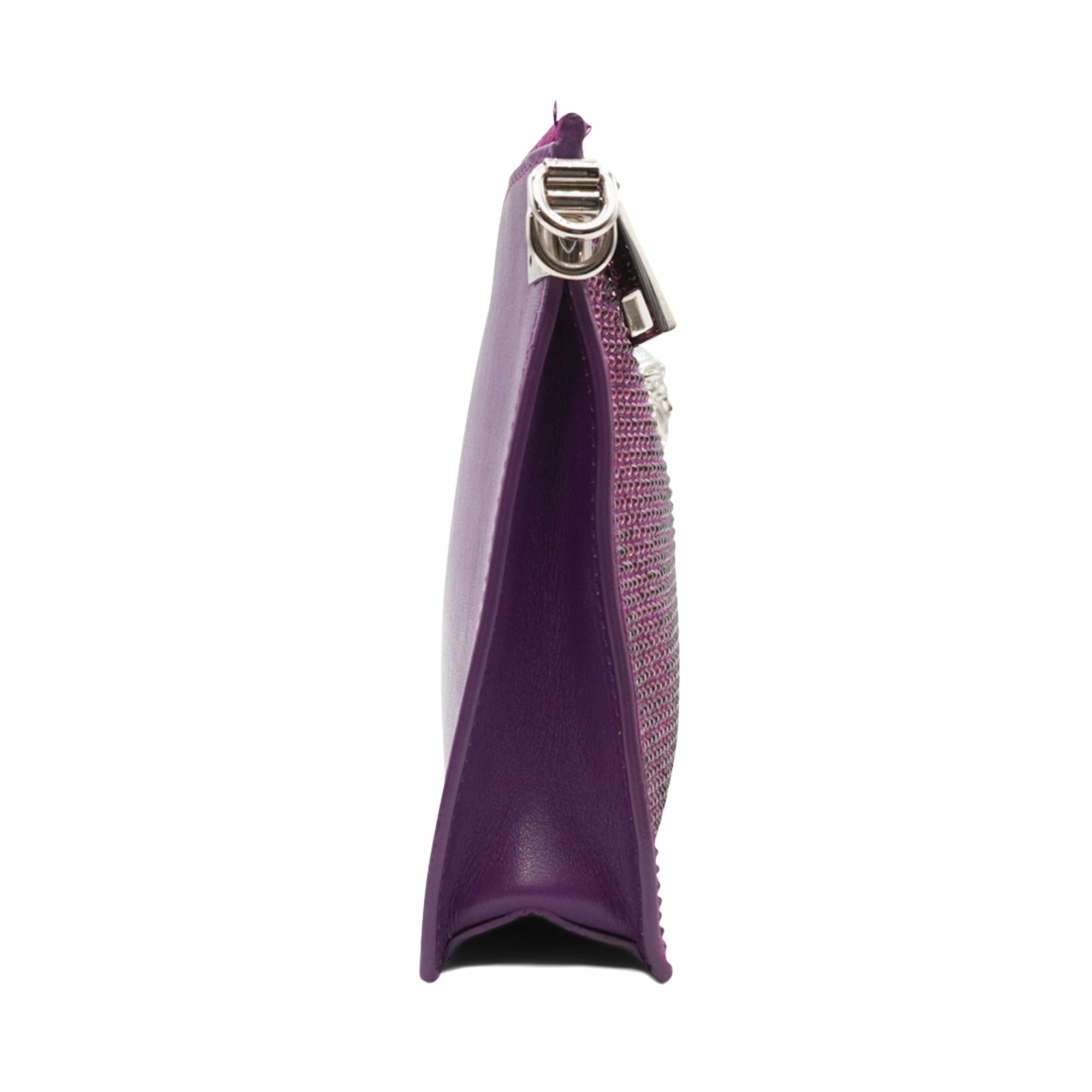 Versace 'Palazzo' wristlet pouch in purple leather with full crystal covered front and large medusa head in silver hardware. Featuring leather detachable wrist strap and top zipper closure opening to a black satin lining with one slip pocket.