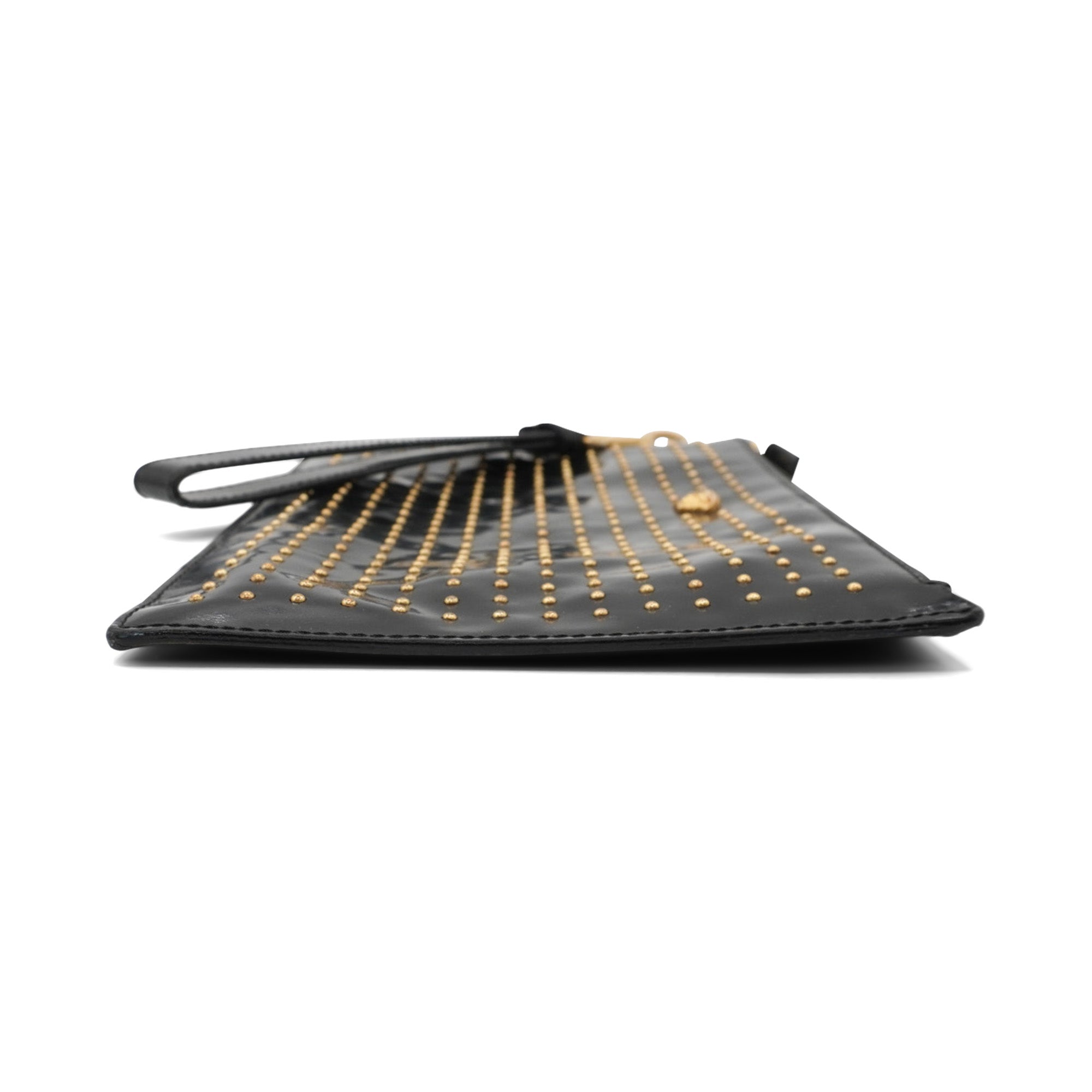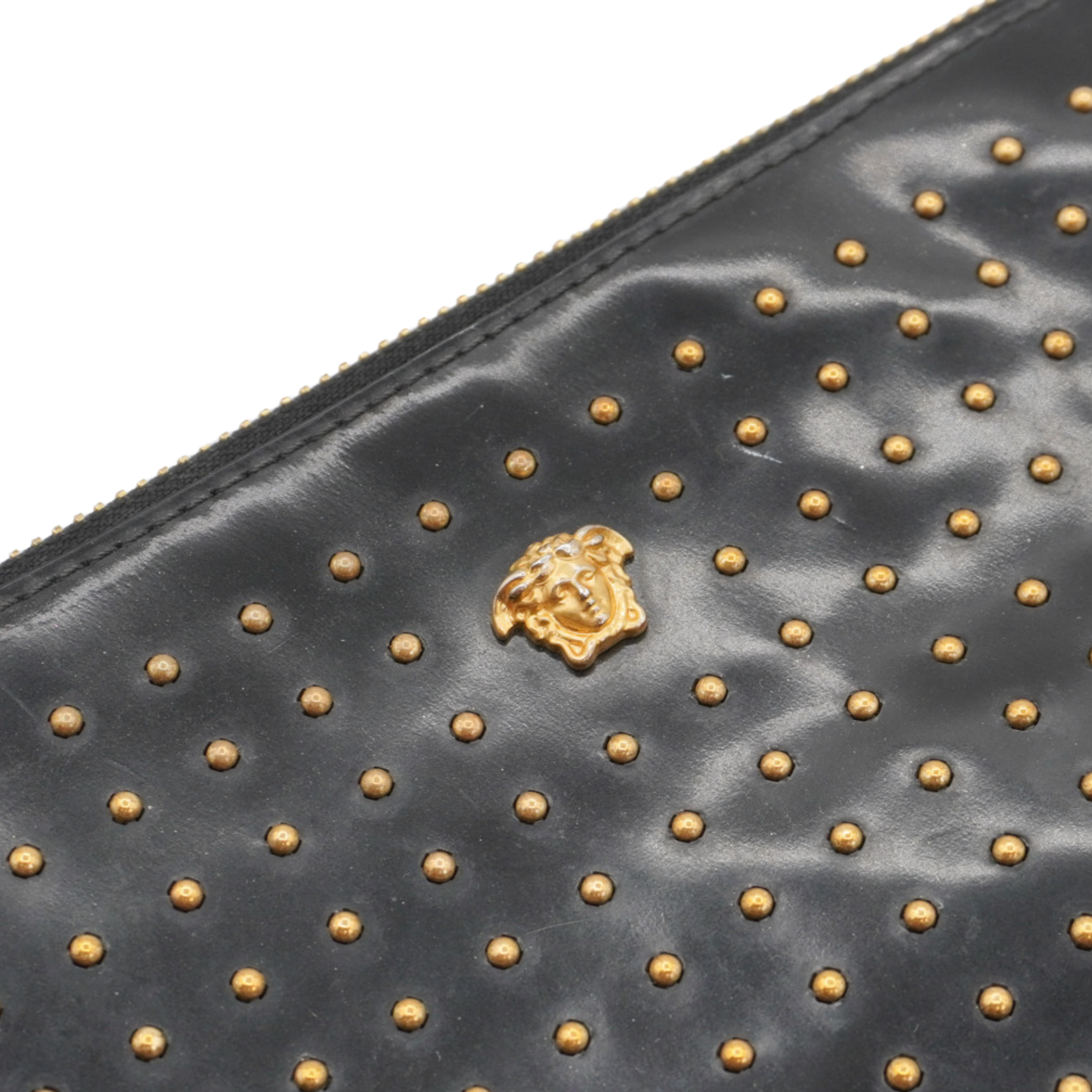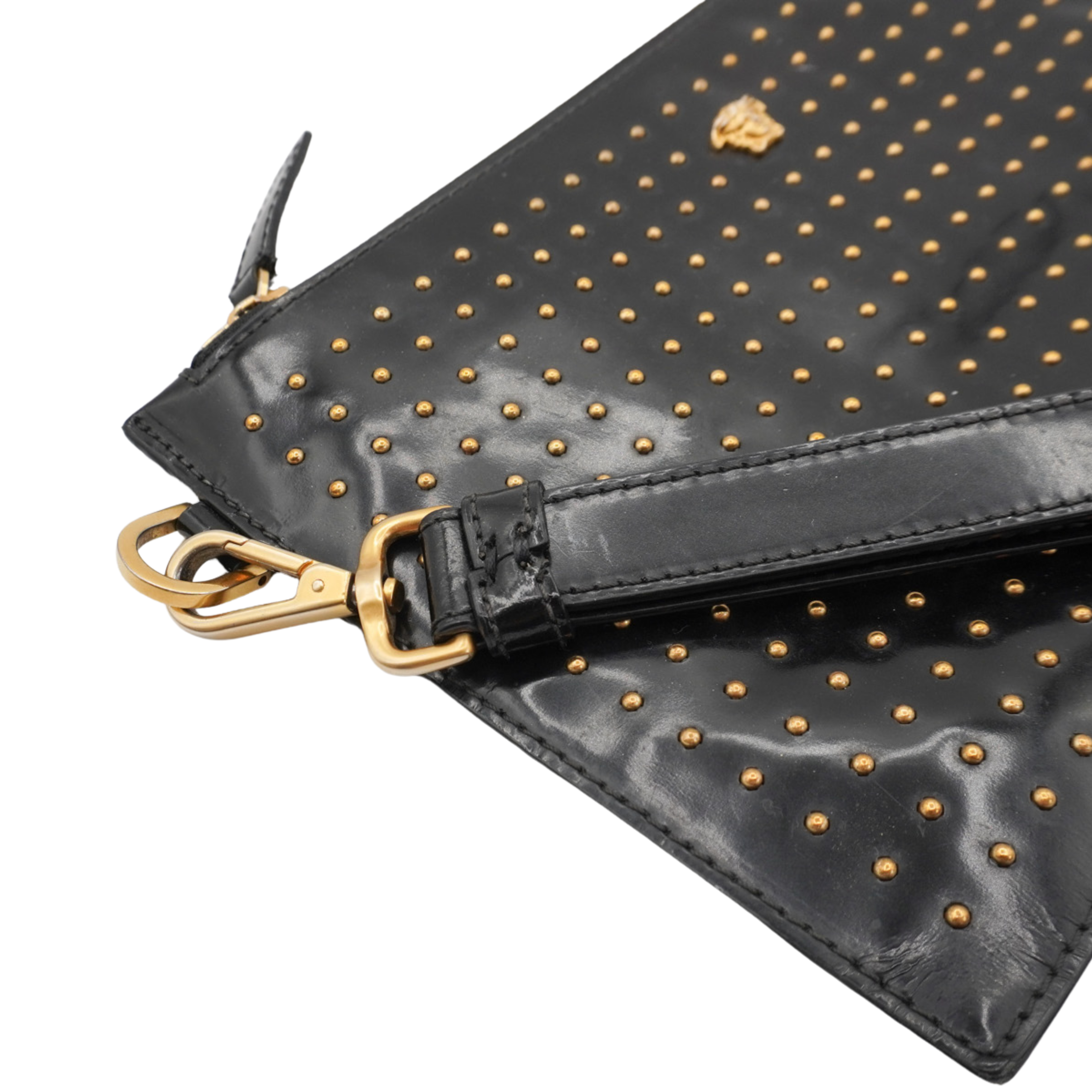 Versace 'Medusa Head' portfolio pouch in black patent leather with gold round studs on the front and medusa head emblem. Featuring detachable wristlet strap and top zip closure. Interior features black canvas lining and zip pocket.