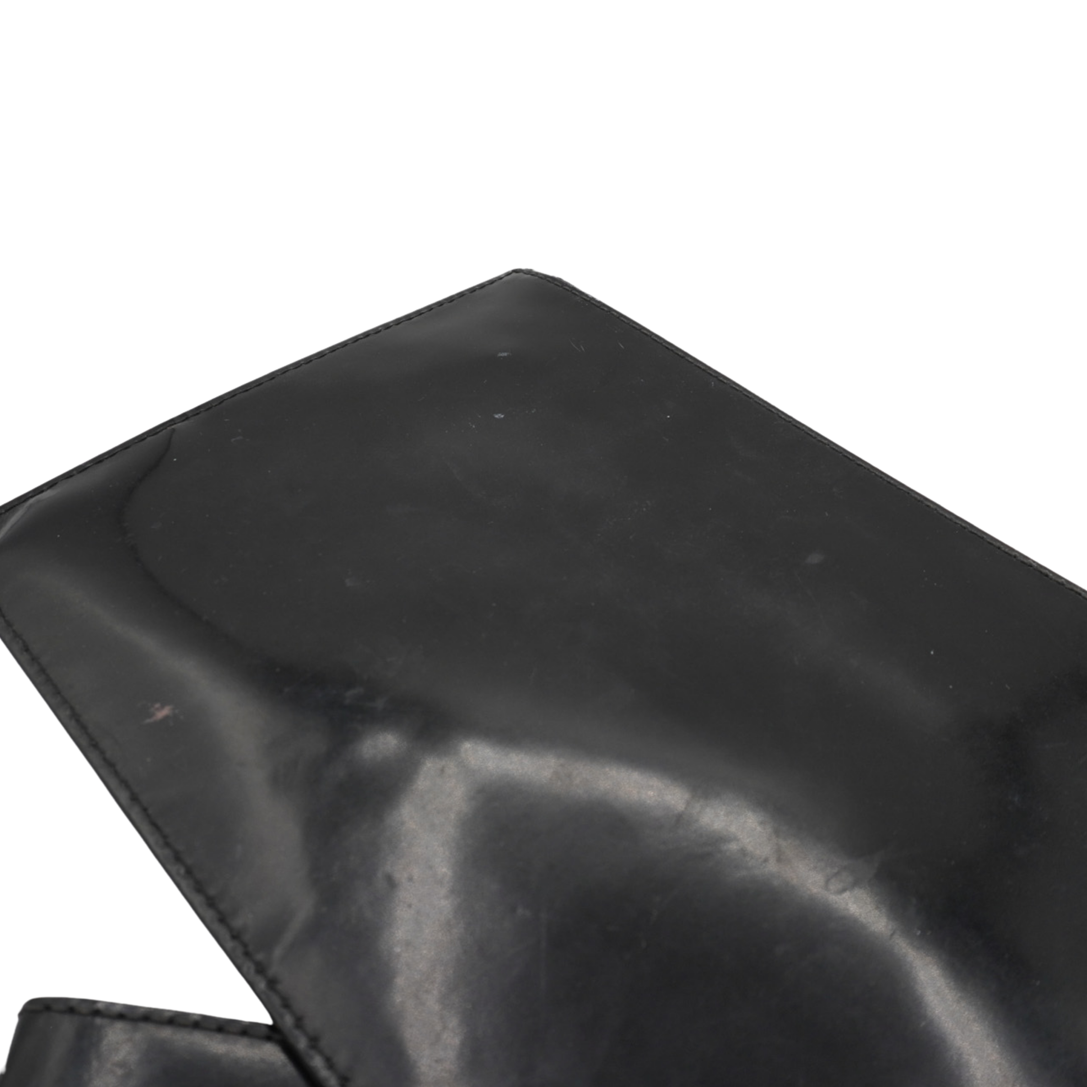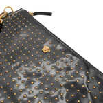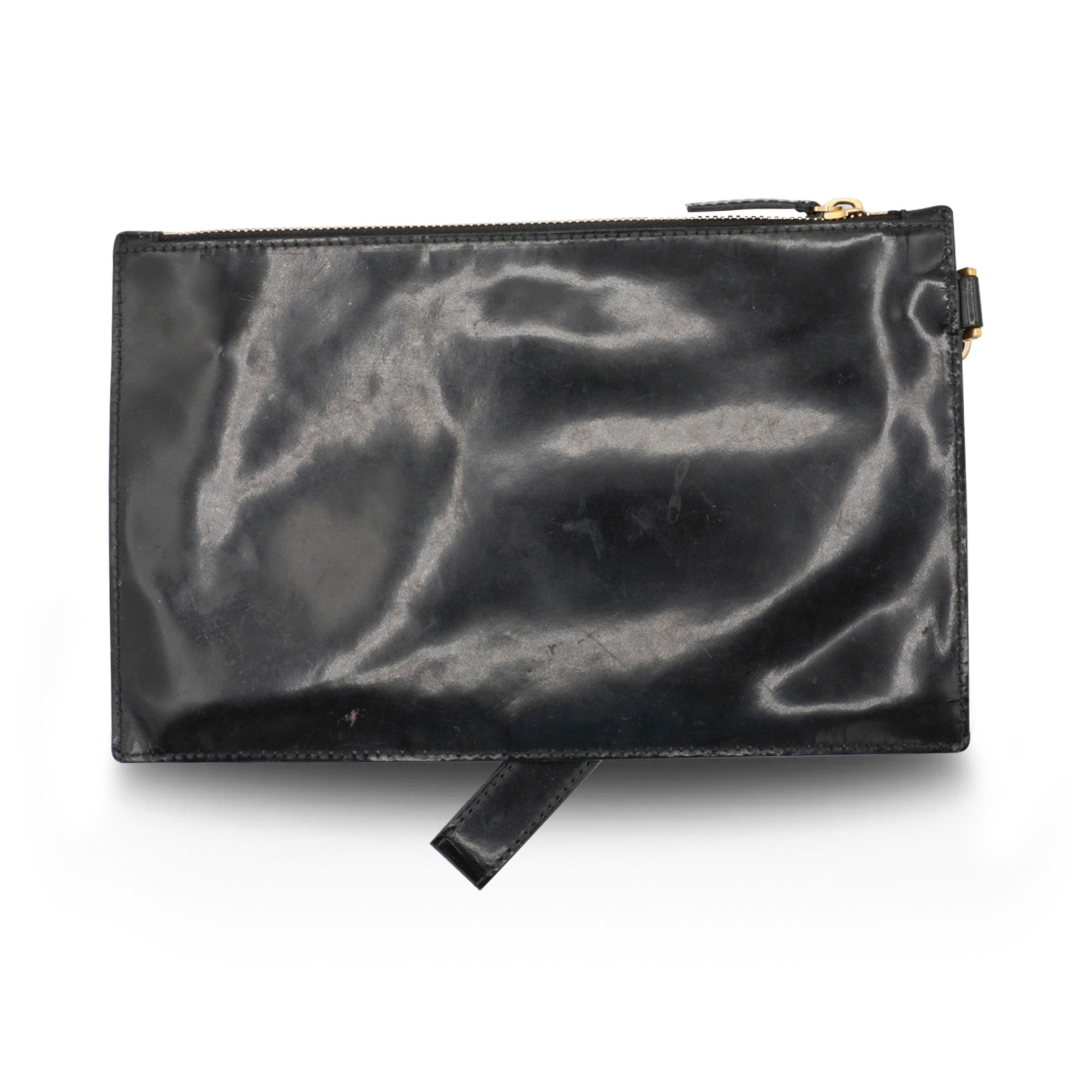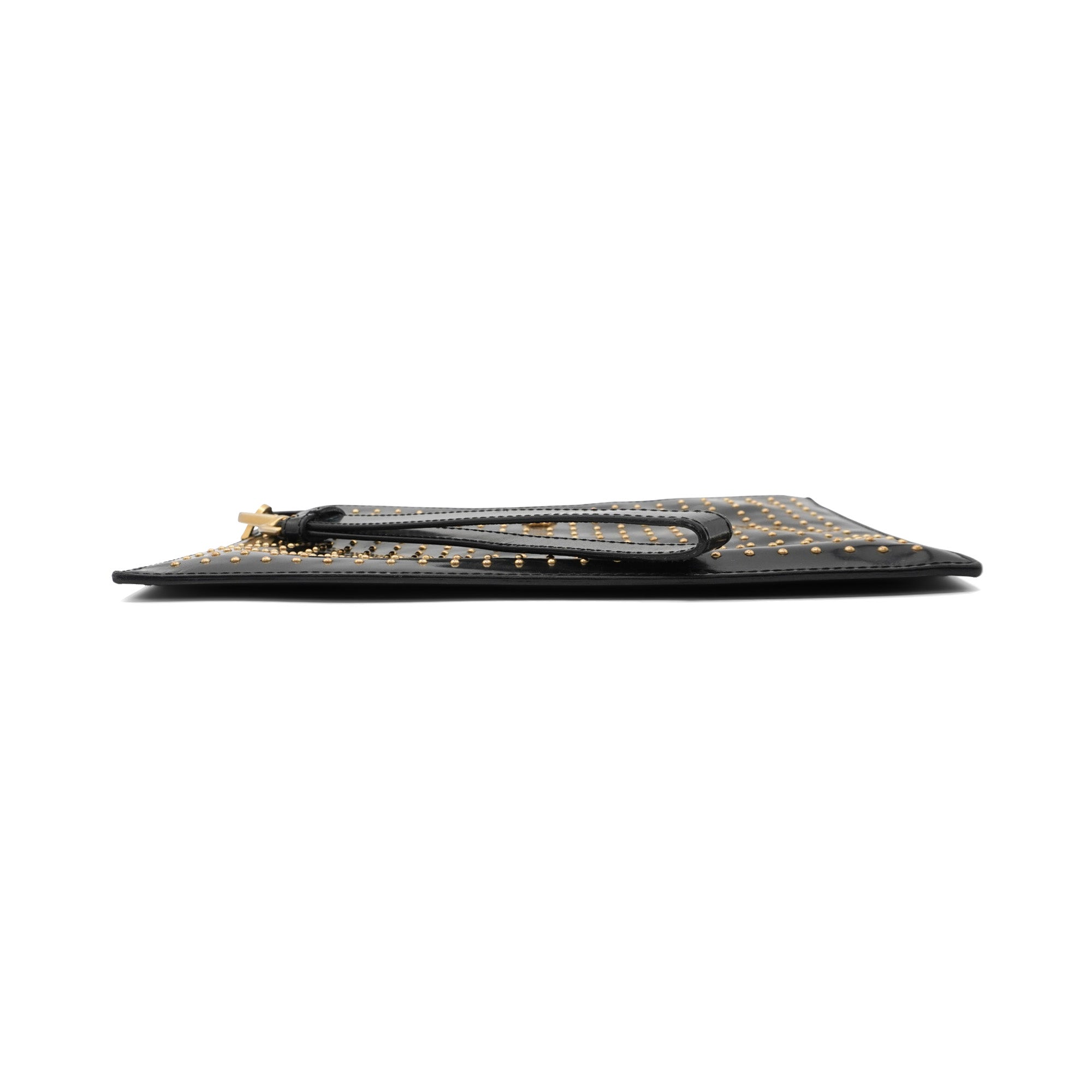 Versace 'Medusa Head' portfolio pouch in black patent leather with gold round studs on the front and medusa head emblem. Featuring detachable wristlet strap and top zip closure. Interior features black canvas lining and zip pocket.