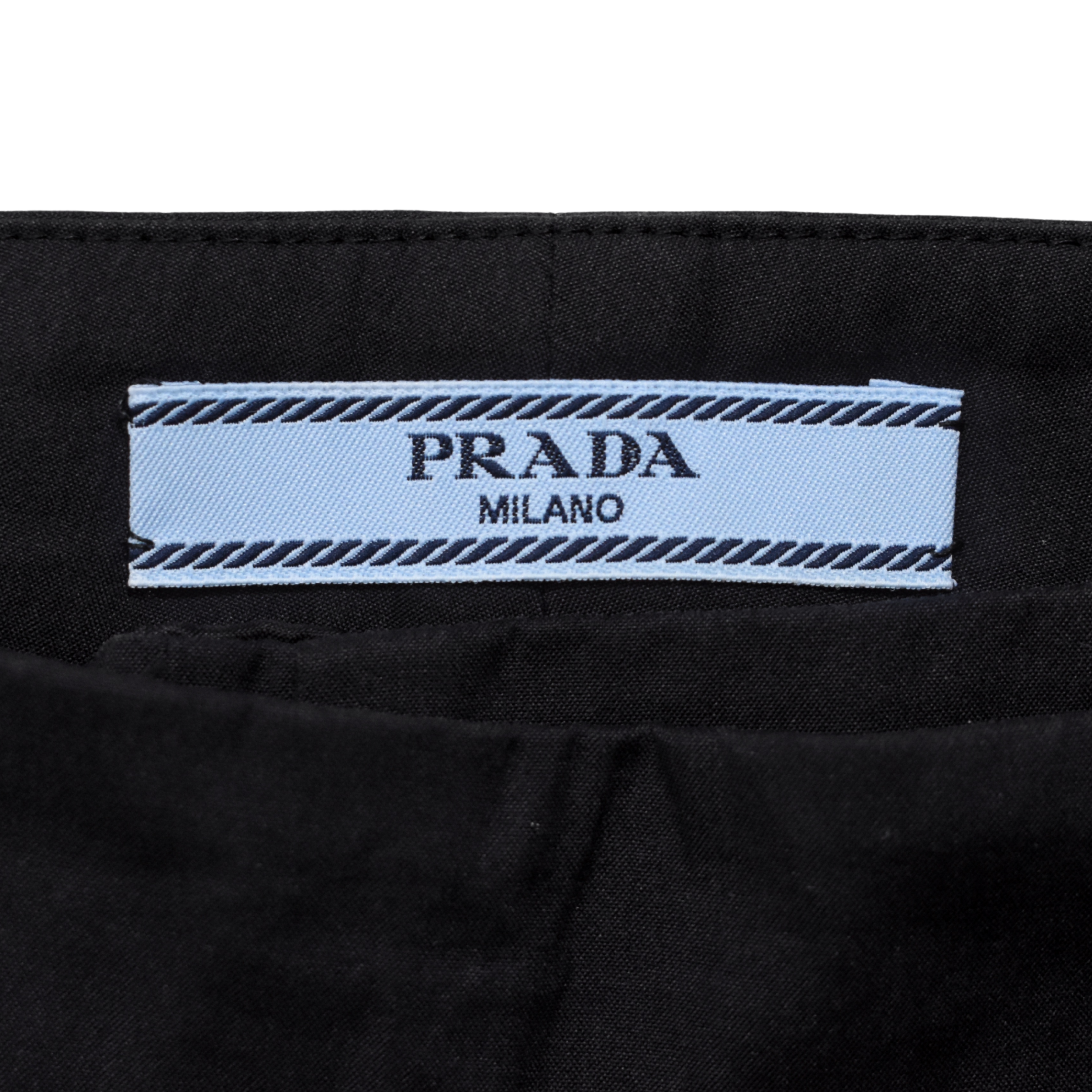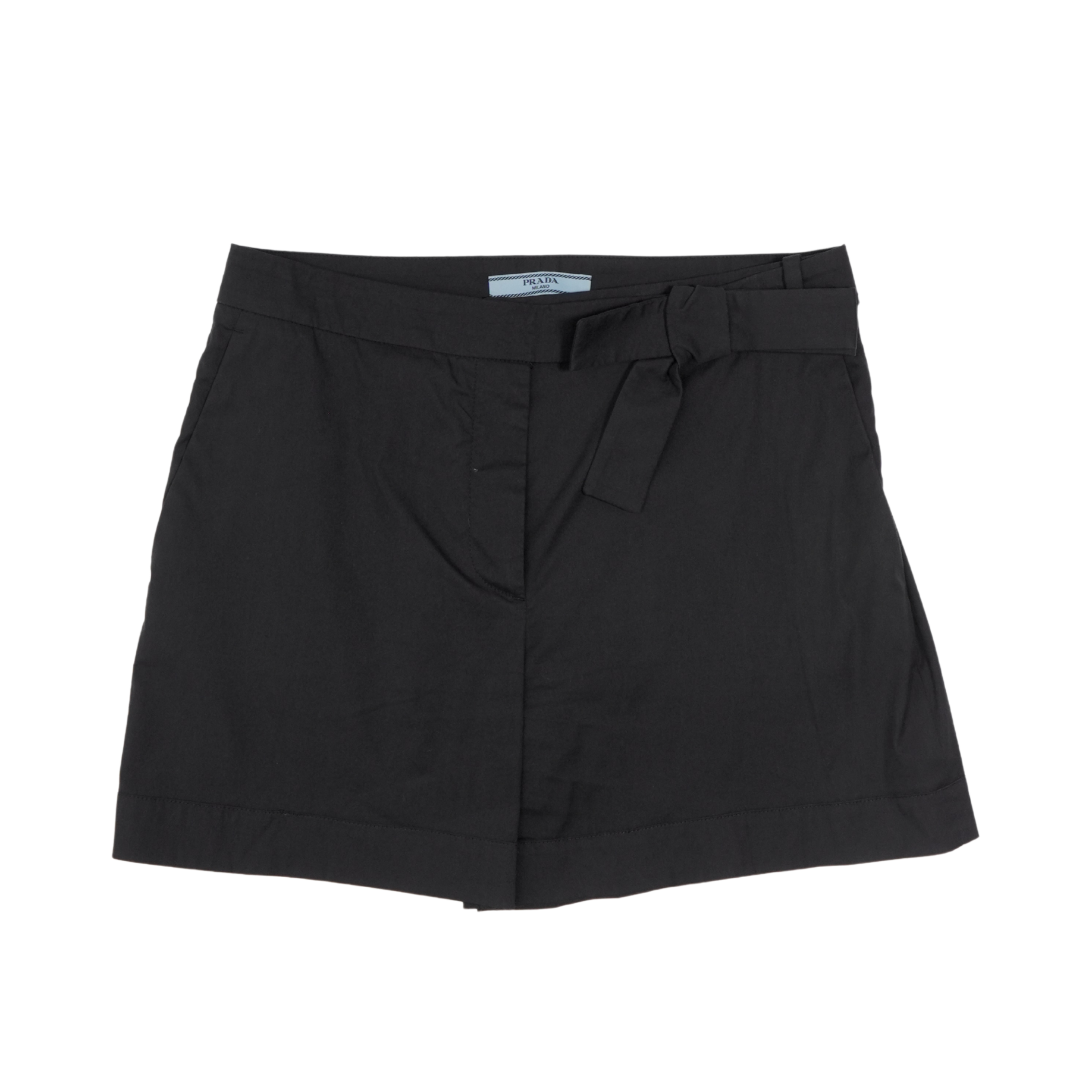 Prada mini shorts in black cotton with a front zip opening and a bow detail on the waistband.