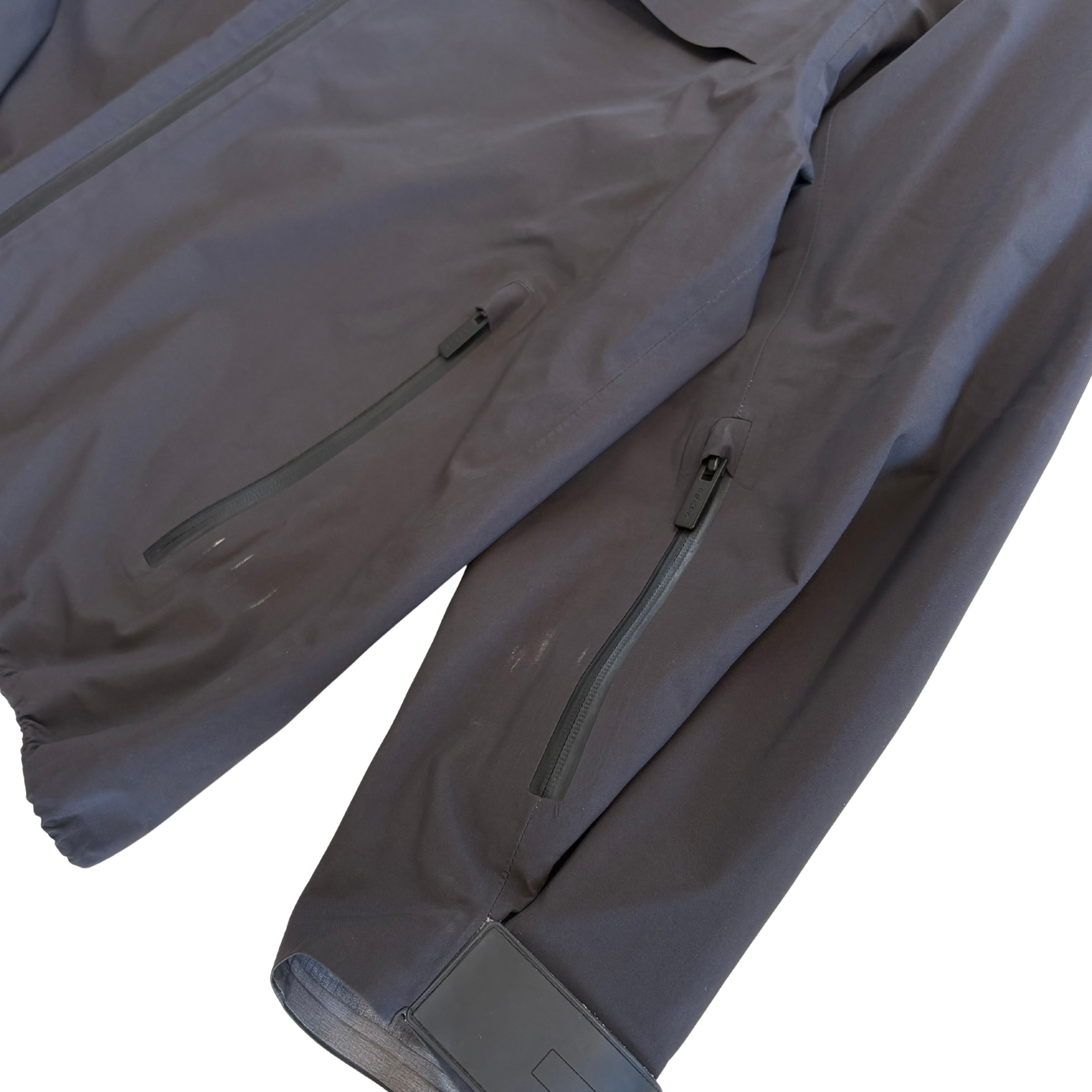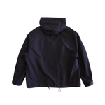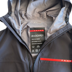 Prada black Gore-Tex shell jacket with red 'Prada' logo on right breast and an articulated hood. Features taped seams and zip pockets, velcro cuffs, and an elastic drawstring hem.