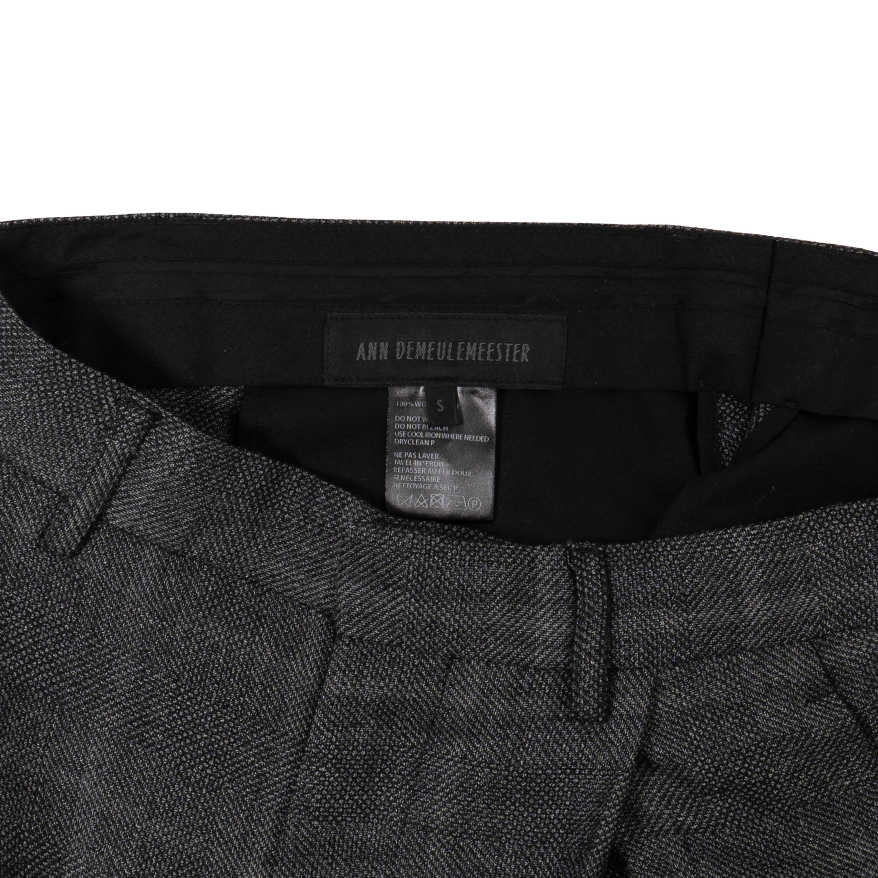 Ann Demeulemeester tapered trousers in grey and black wool with pleats on the front and four pocket styling.